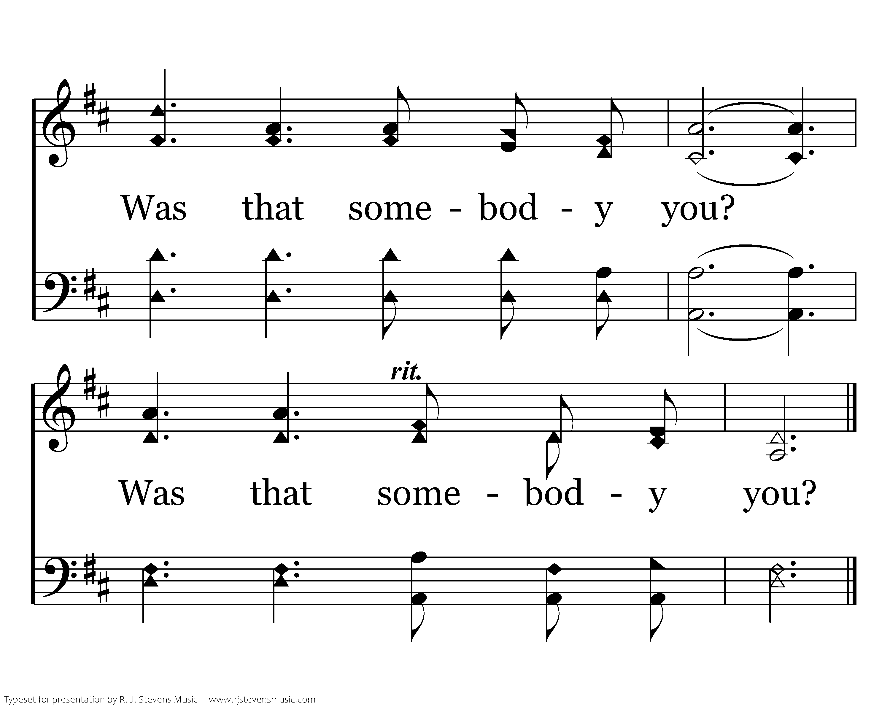 Somebody did a golden deed, Proving himself a friend in need; Somebody sang a cheerful song, Bright'ning the sky the whole day long, Was that somebody you? Was that somebody you?