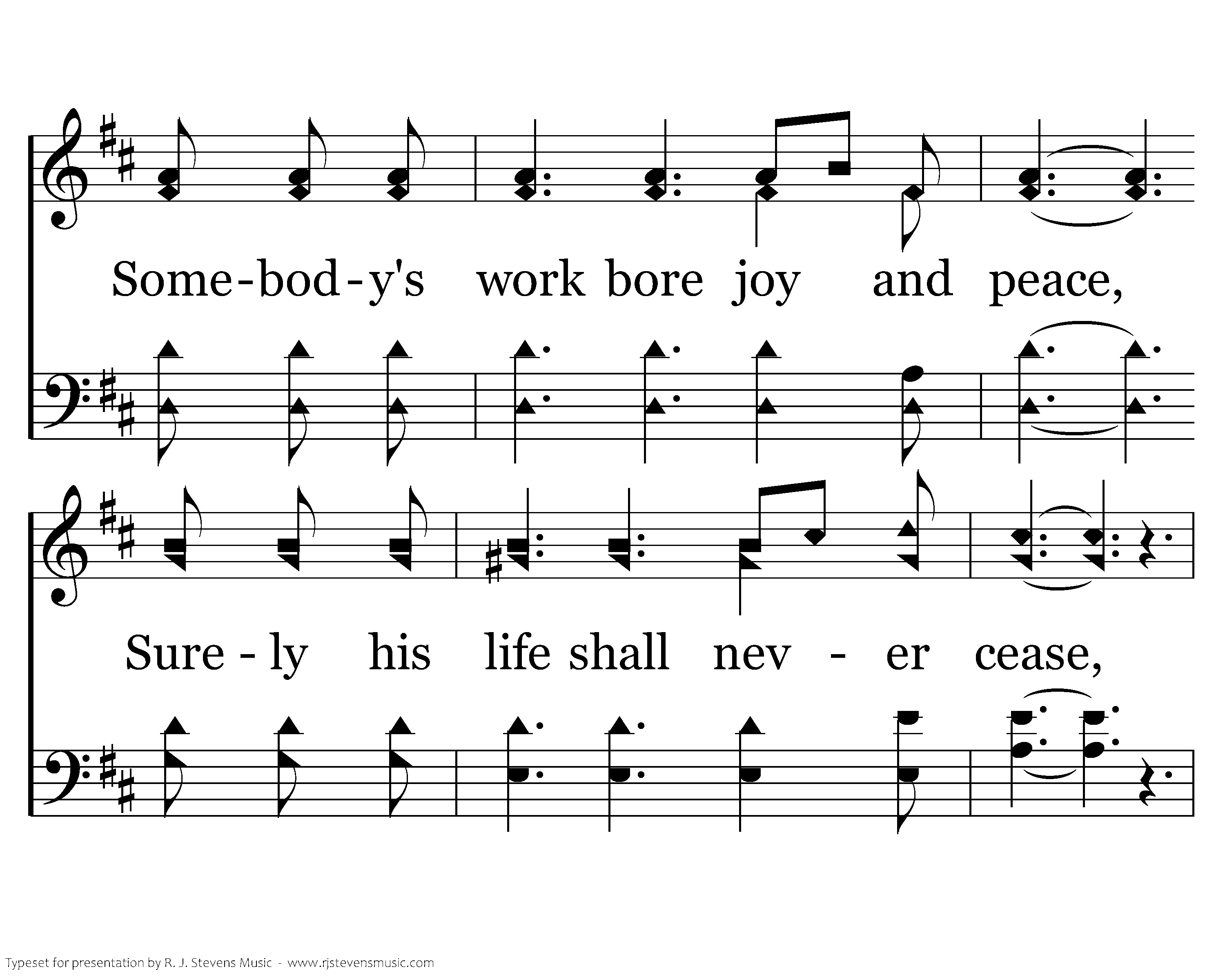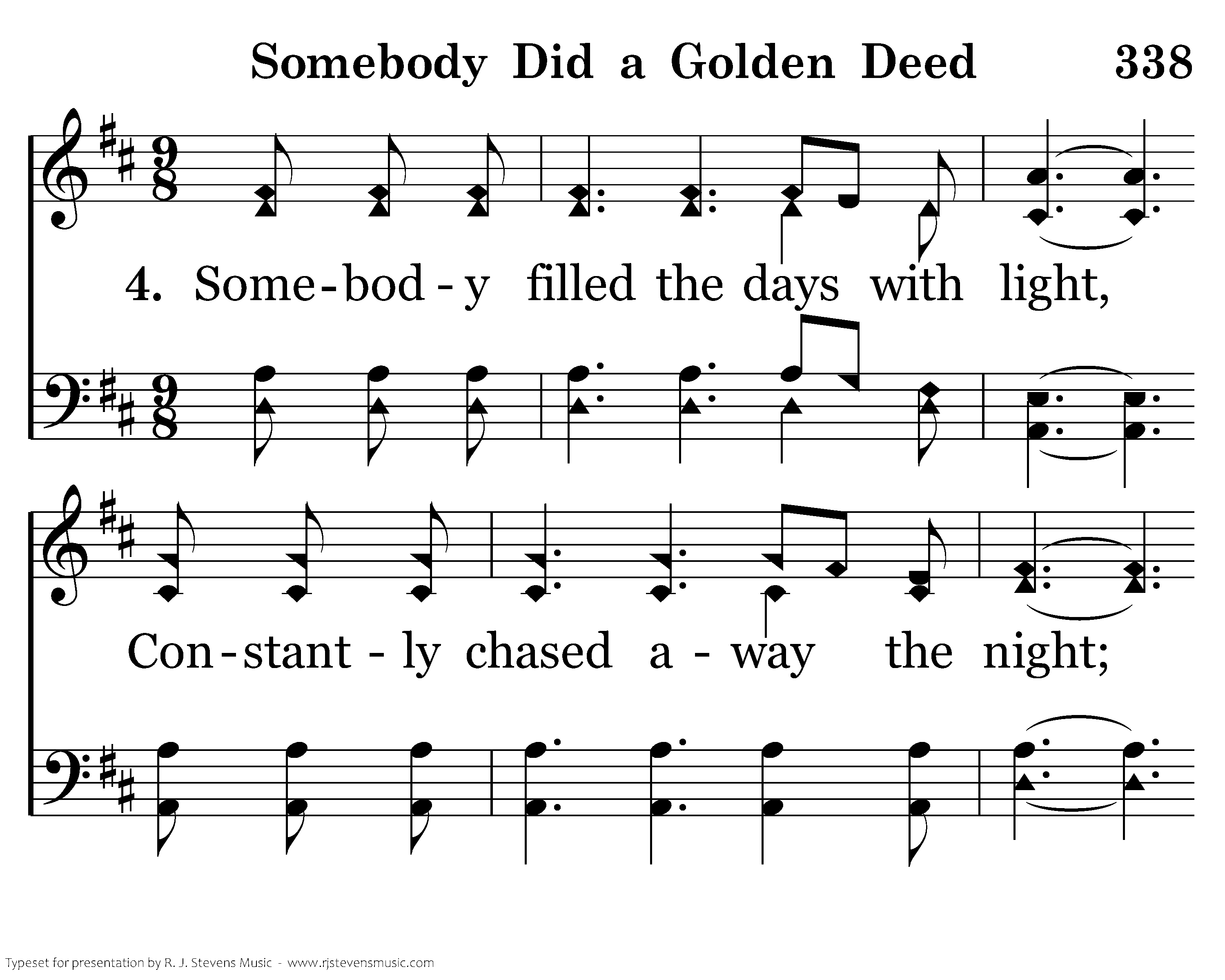 Somebody filled the days with light, Constantly chased away the night; Somebody's work bore joy and peace, Surely his life shall never cease, Was that somebody you? Was that somebody you?