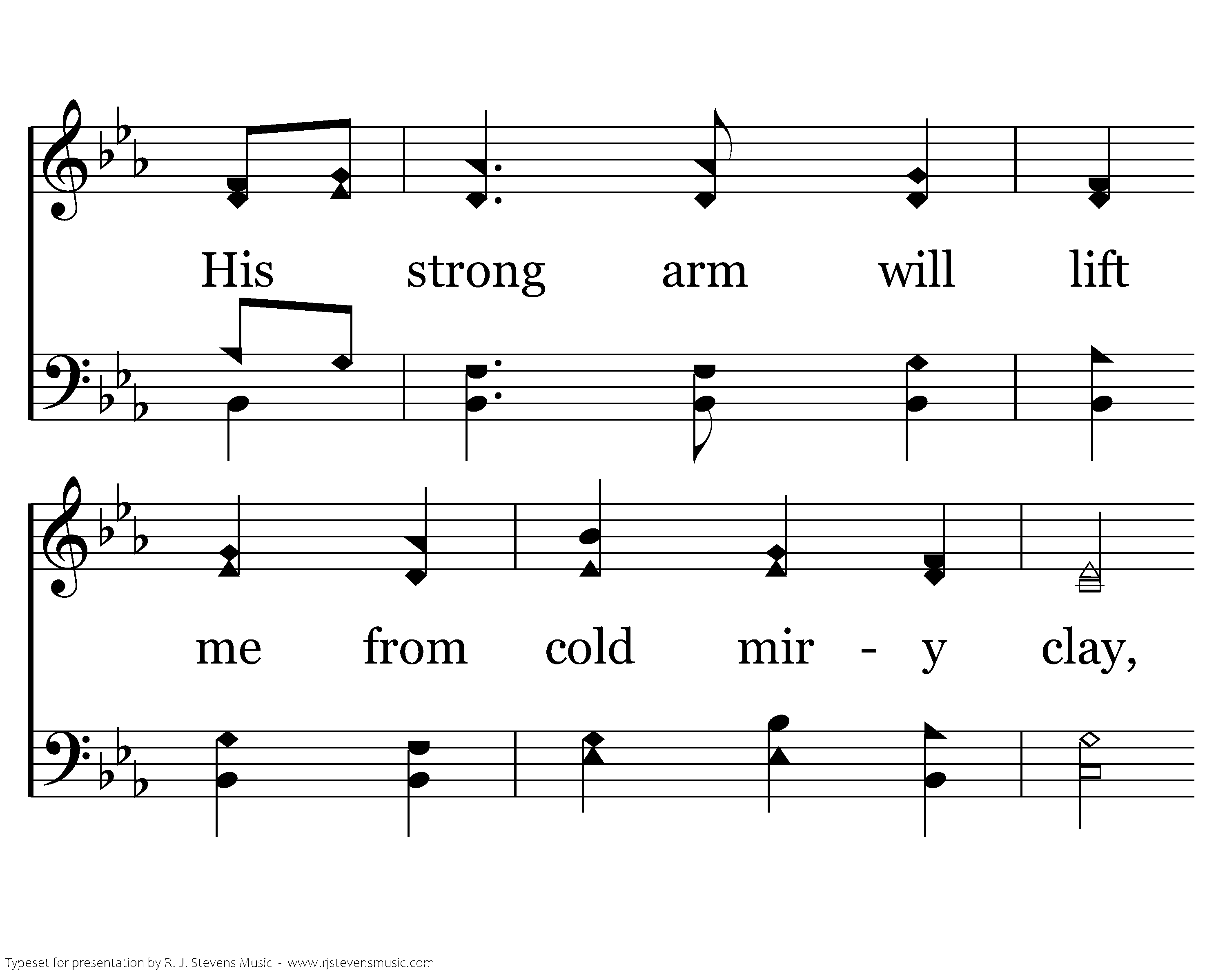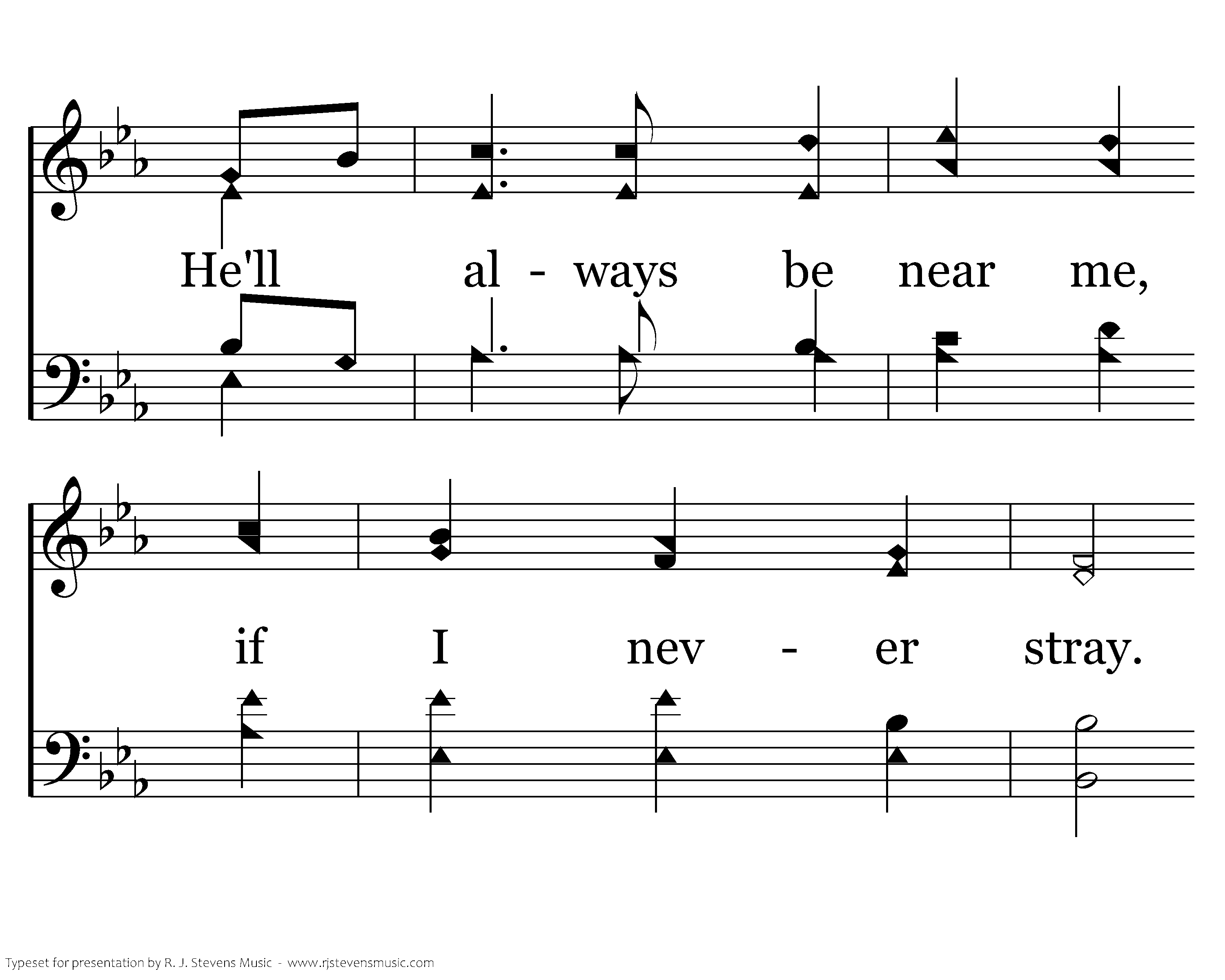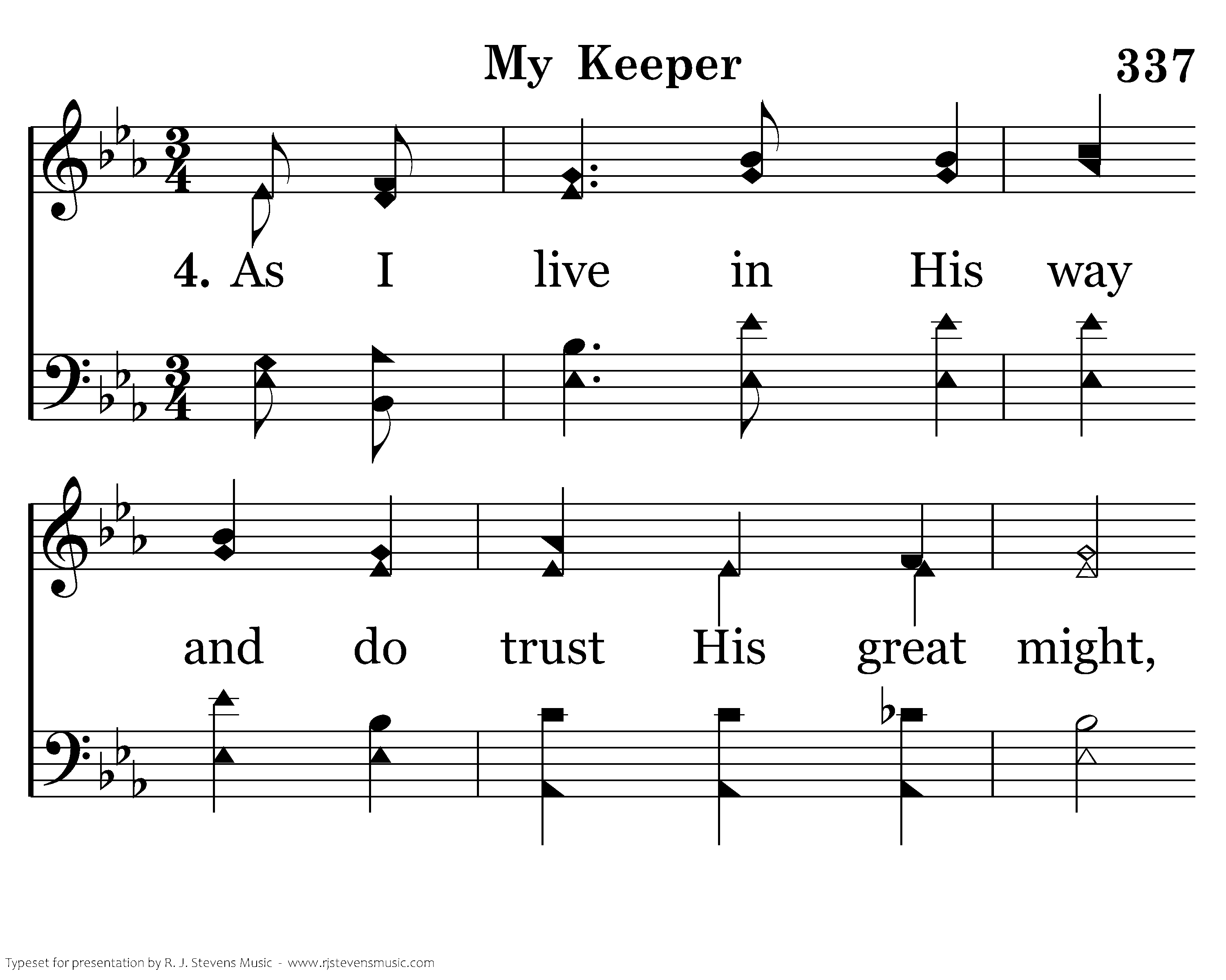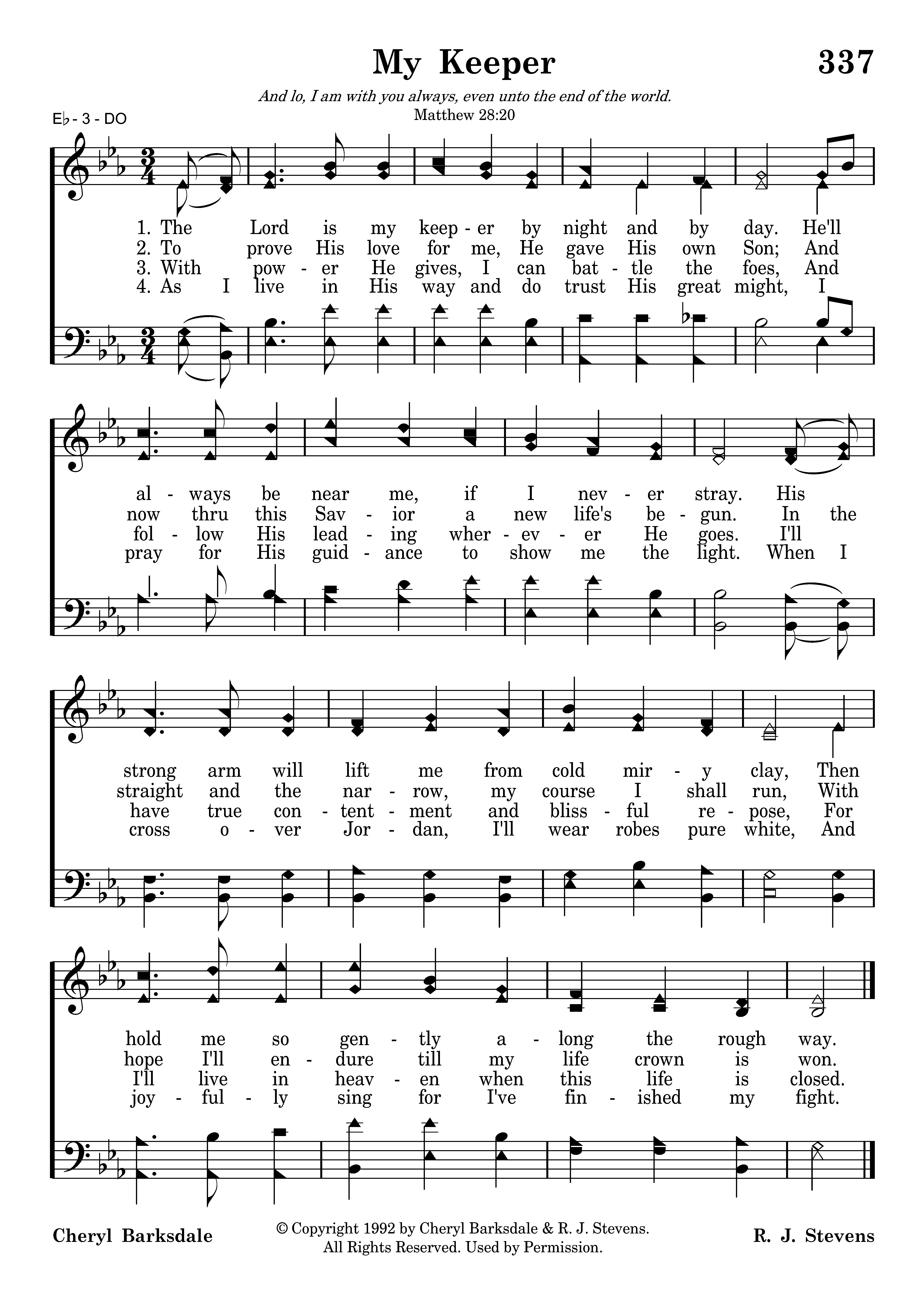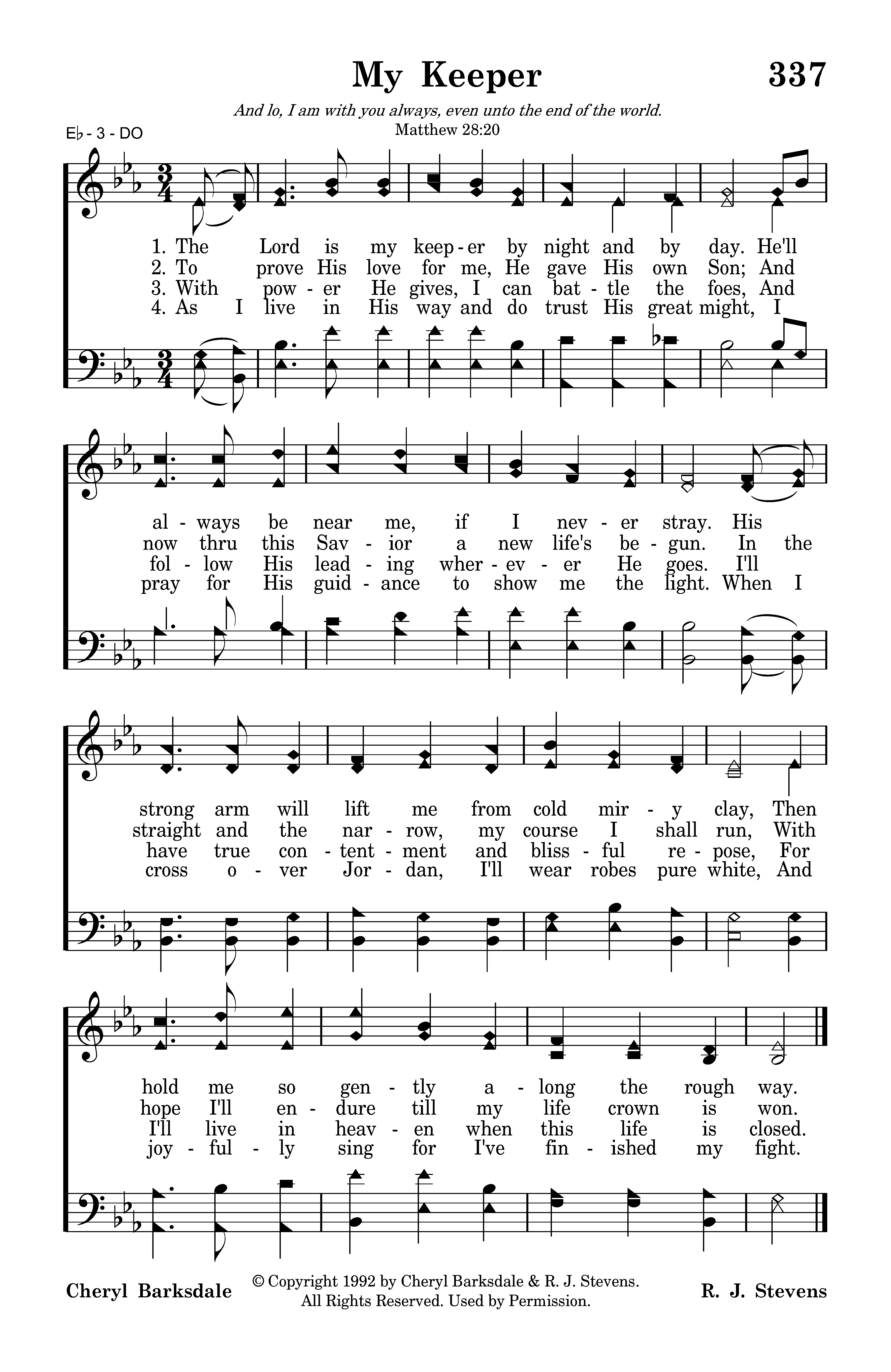 The Lord is my keeper by night and by day. He'll always be near me, if I never stray. His strong arm will lift me from cold miry clay, Then hold me so gently along the rough way.