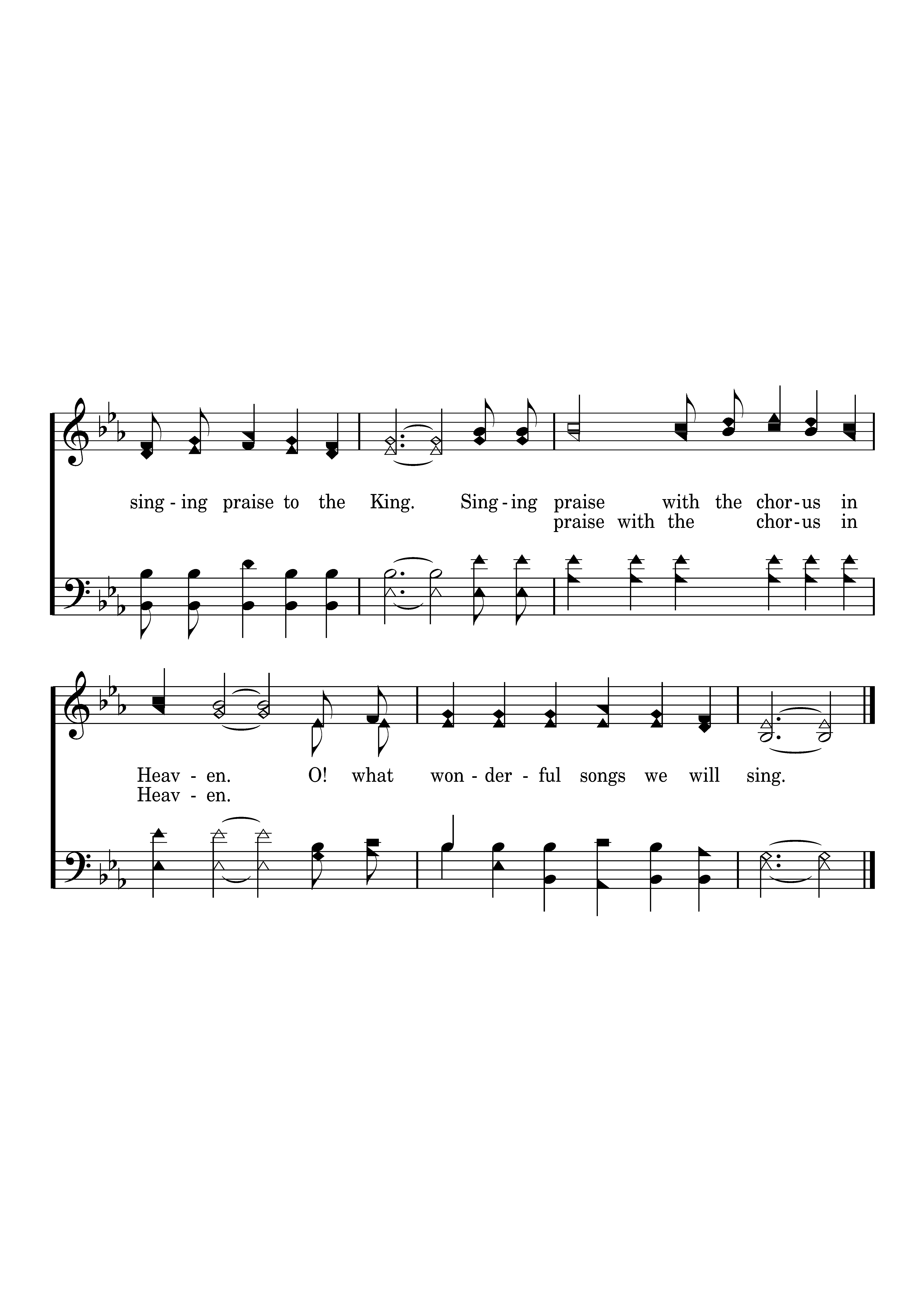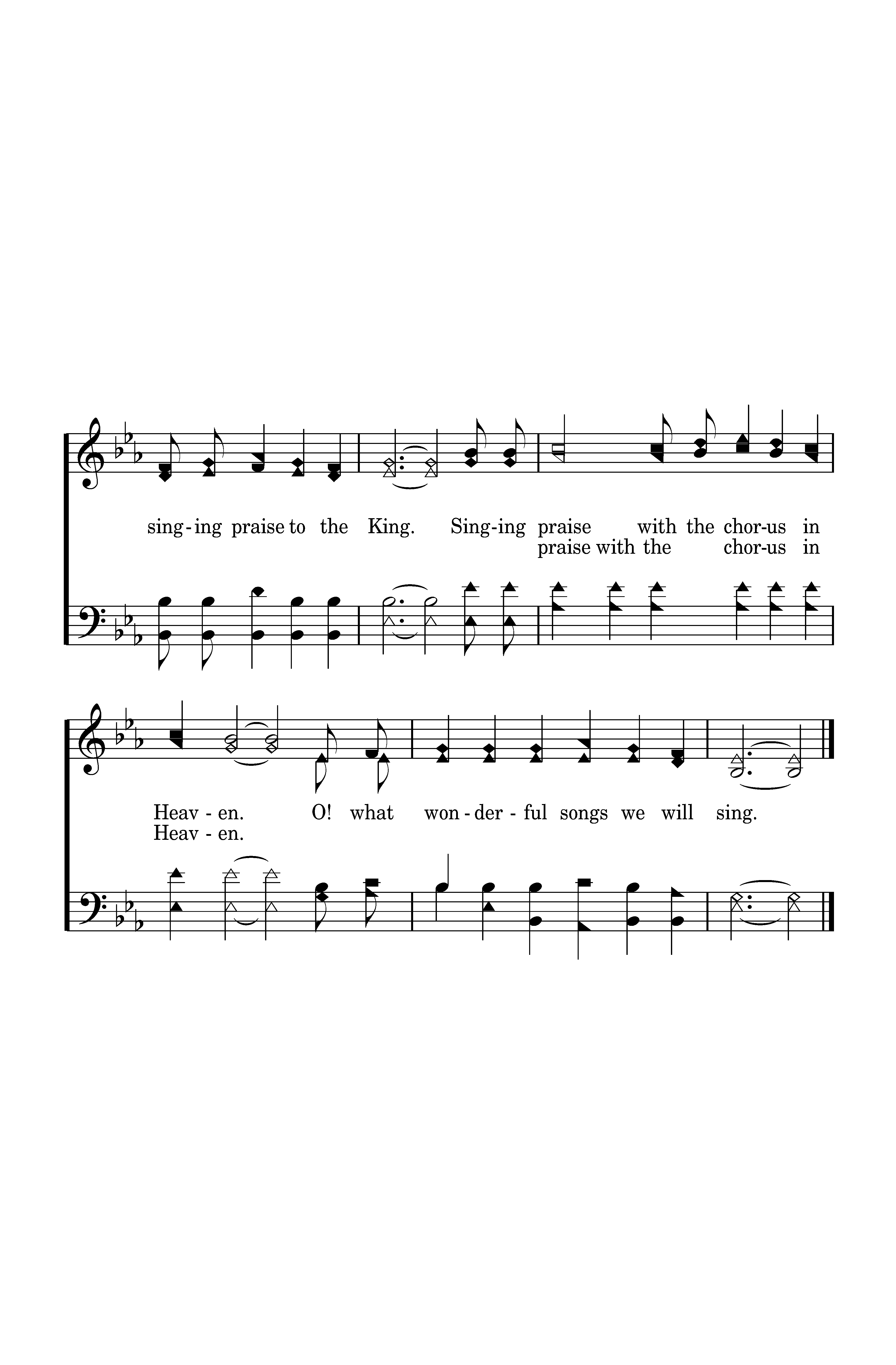 Singing praise with the chorus in Heaven, The saints singing praise to the King. Singing praise with the chorus in Heaven. O! what wonderful songs we will sing.