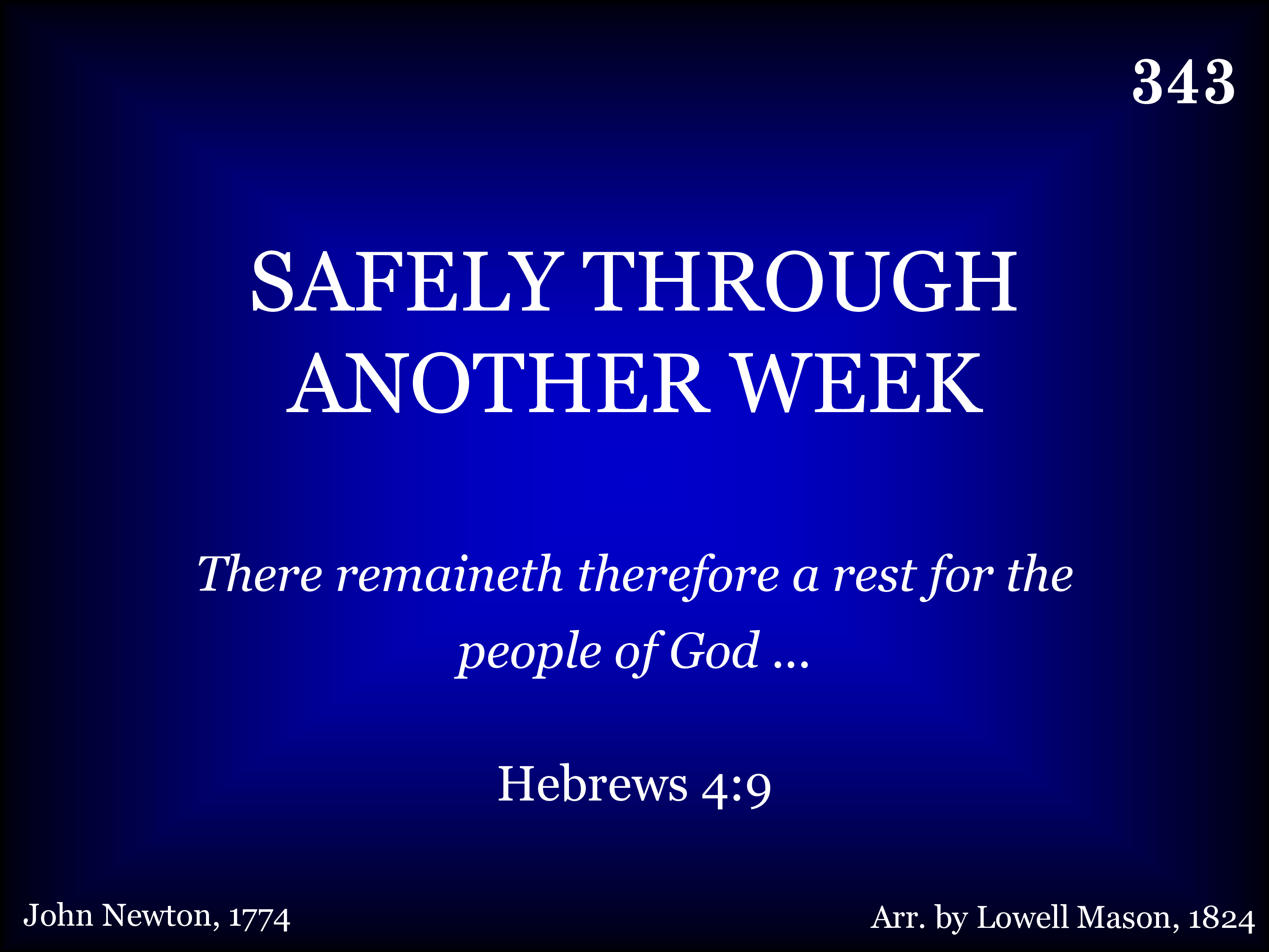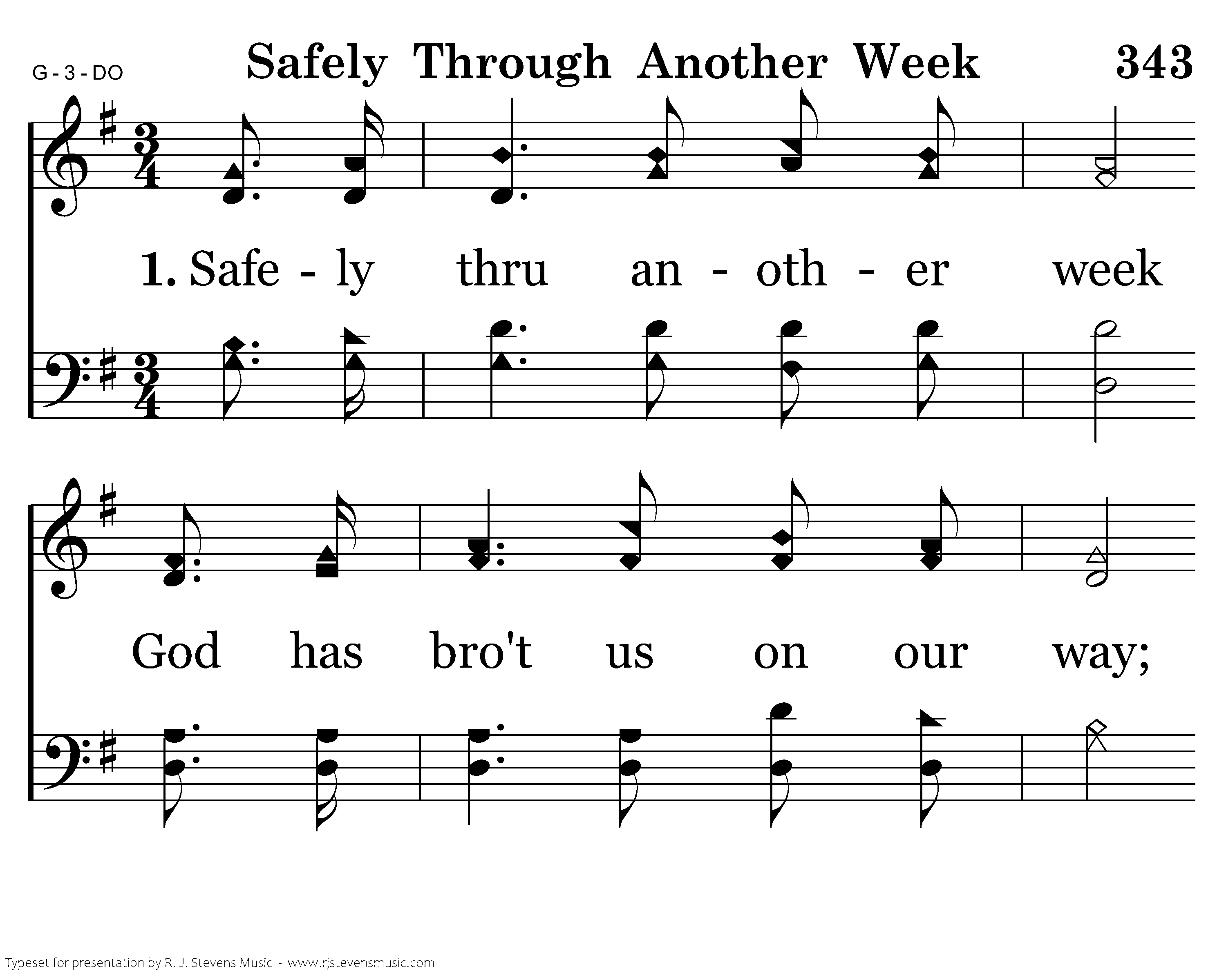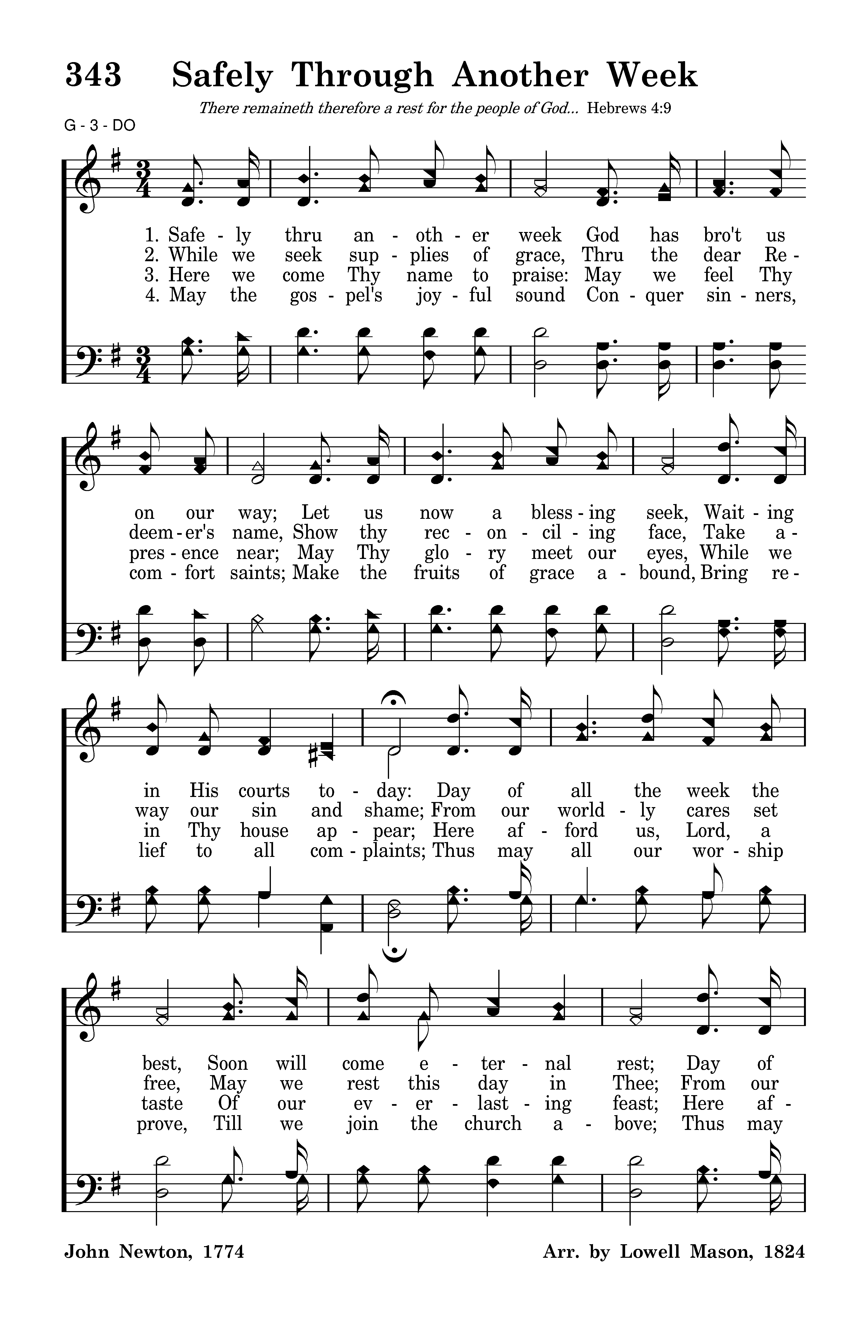 Safely thru another week, God has bro't us on our way; Let us now a blessing seek, Wait-ing in His courts today: Day of all the week the best, Soon will come eternal rest; Day of all the week the best, Soon will come eternal rest.