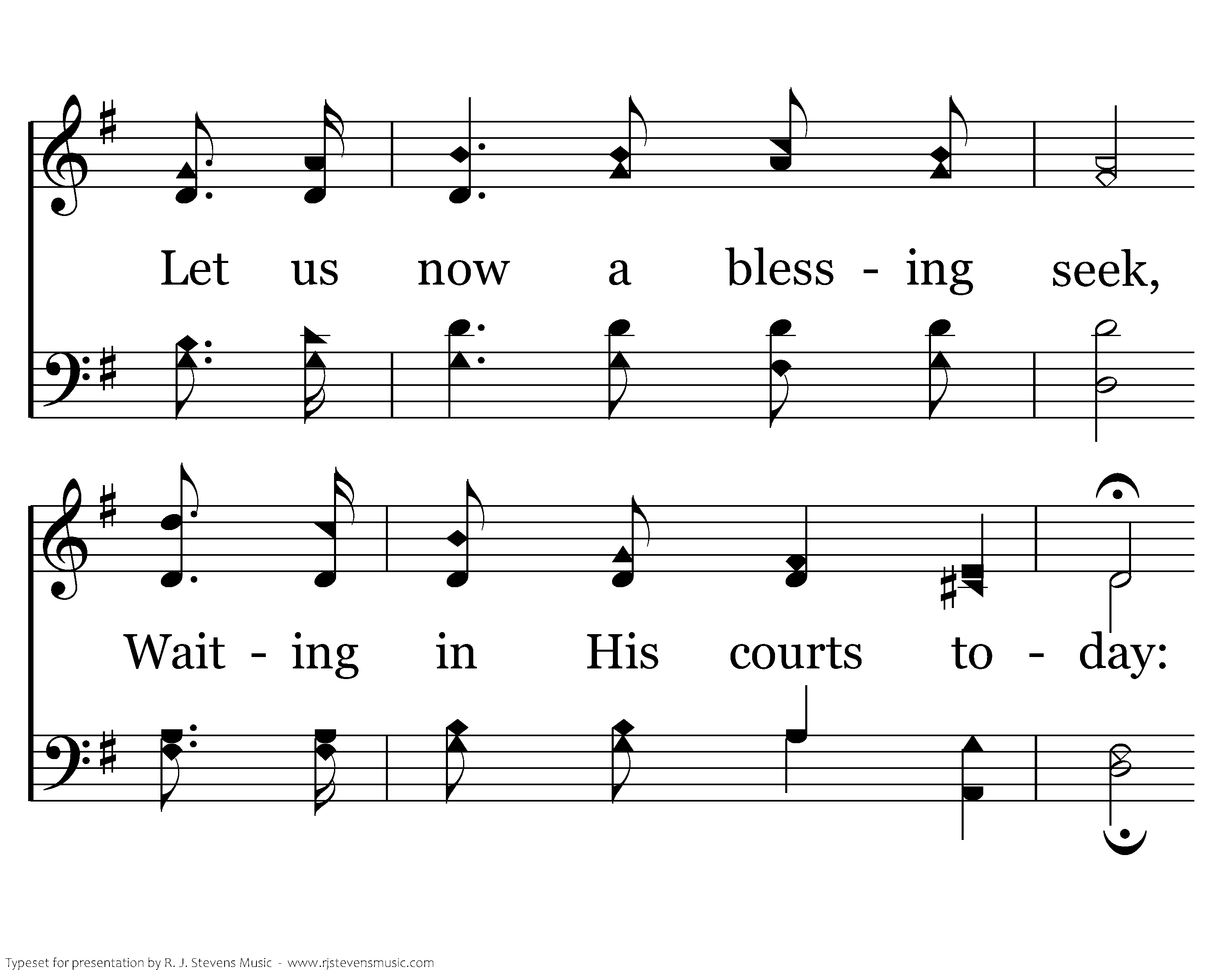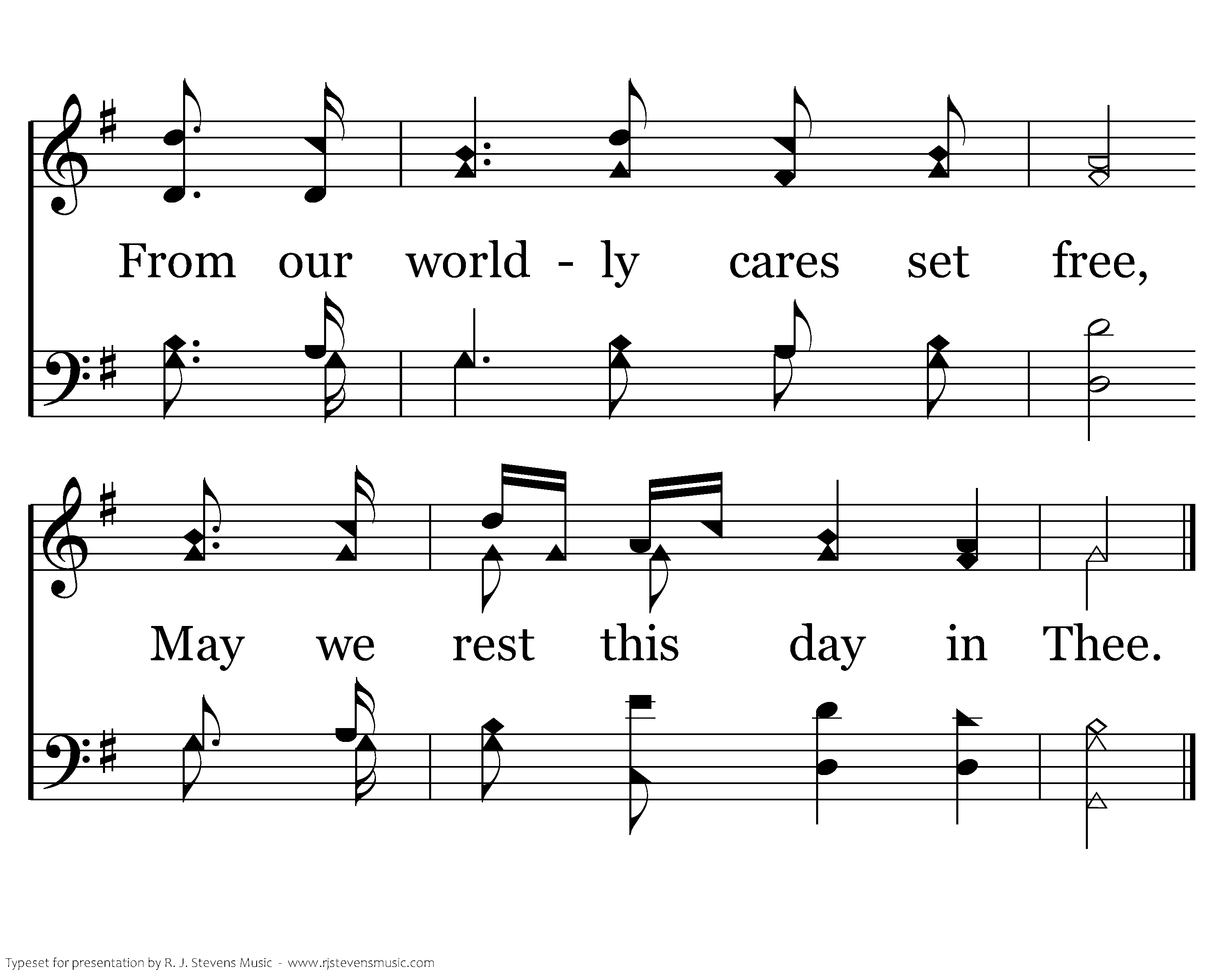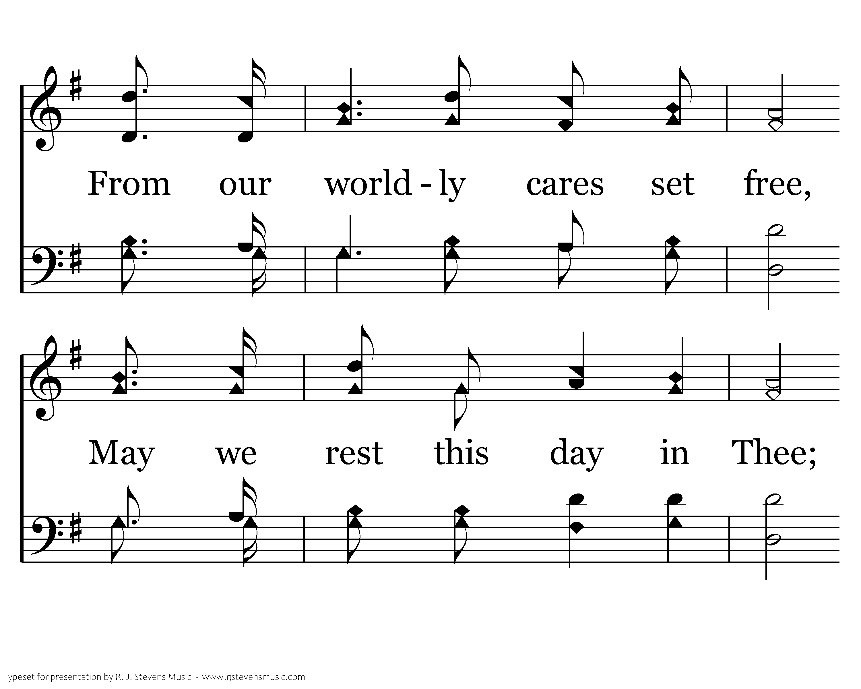 While we seek supplies of grace, Thru the dear Redeemer's name, Show thy reconciling face, Take away our sin and shame; From our worldly cares set free, May we rest this day in Thee; From our worldly cares set free, May we rest this day in Thee.