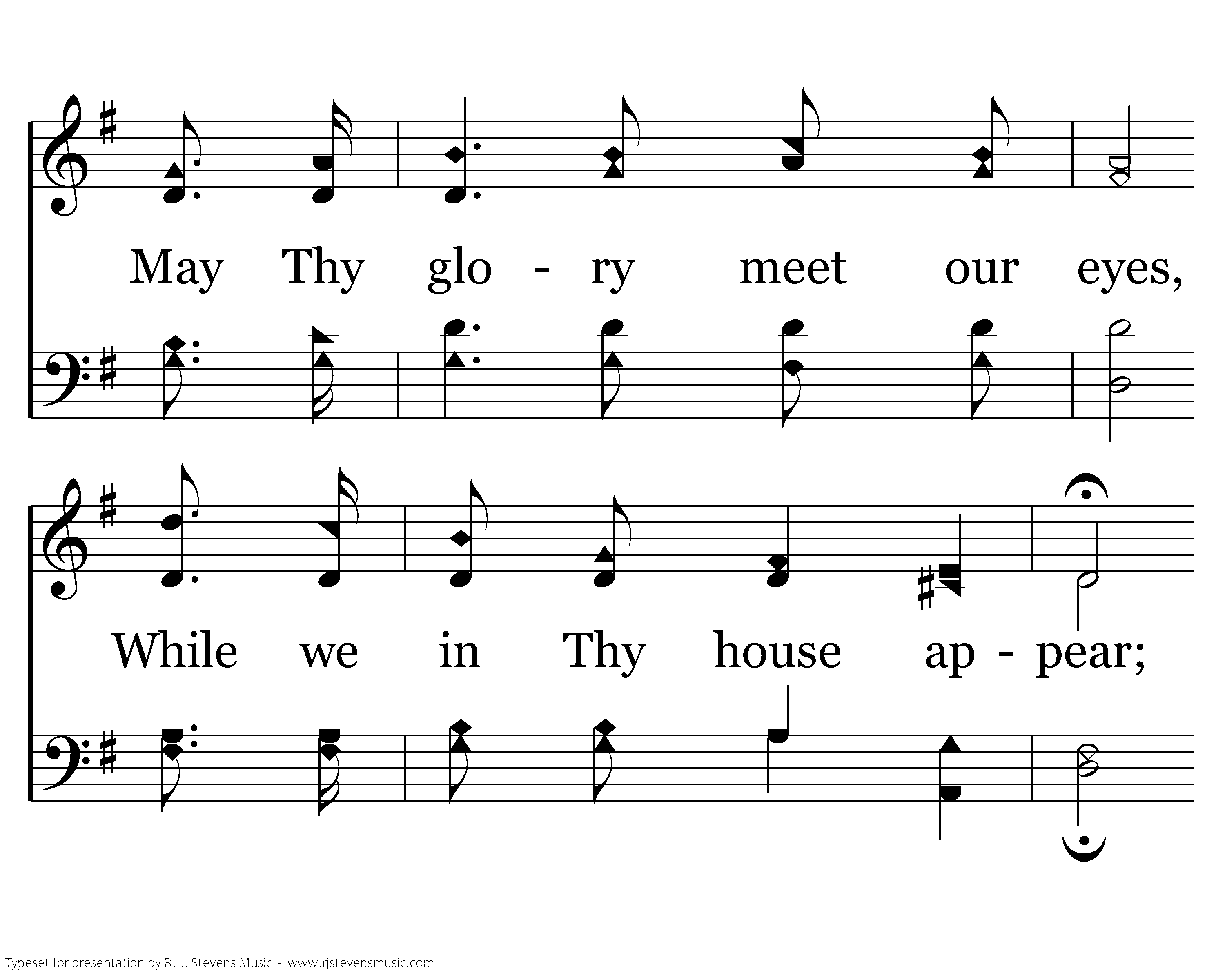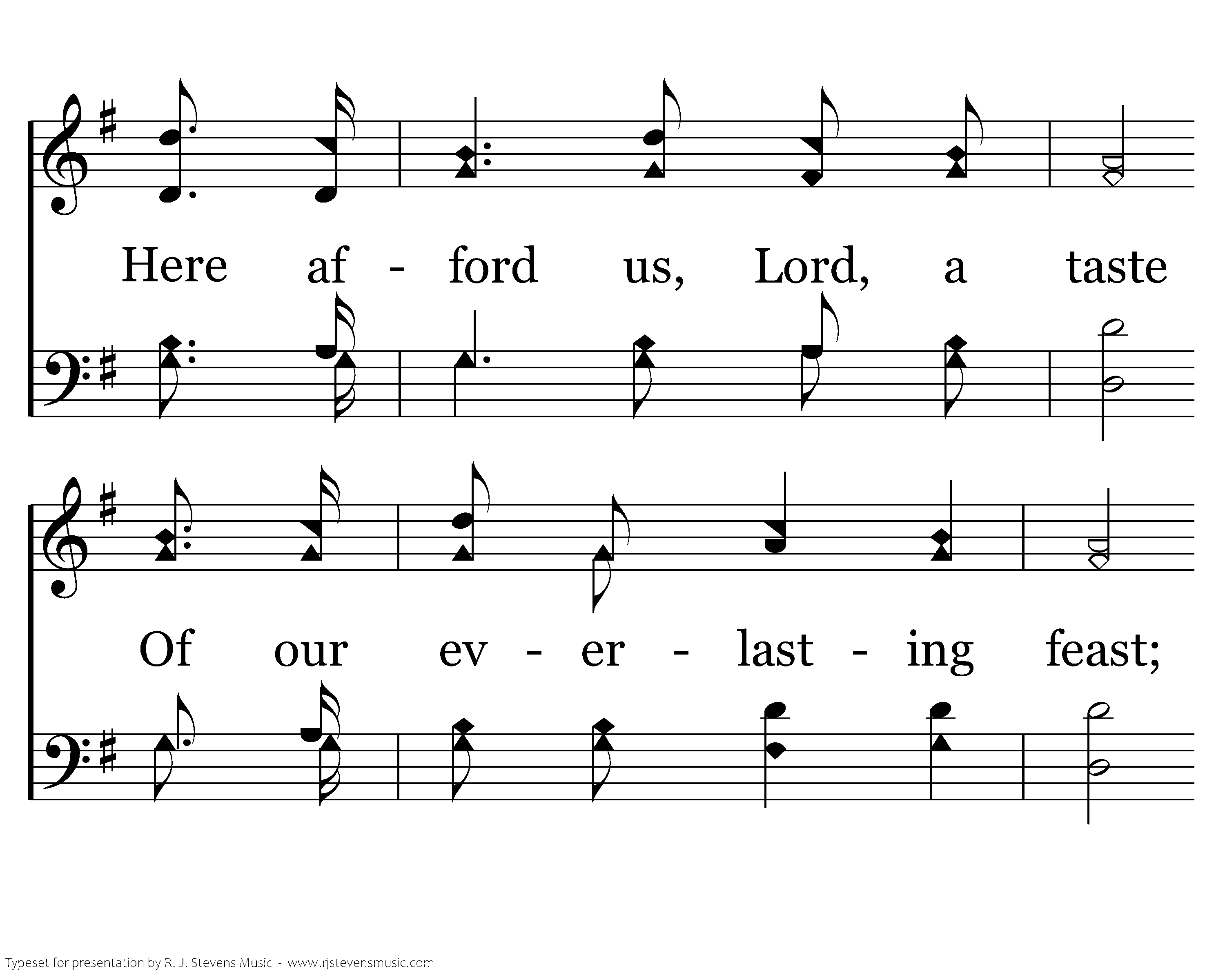 Here we come Thy name to praise: May we feel Thy presence near; May Thy glory meet our eyes, While we in Thy house appear; Here afford us, Lord, a taste of our everlasting feast; Here afford us, Lord, a taste of our everlasting feast.
