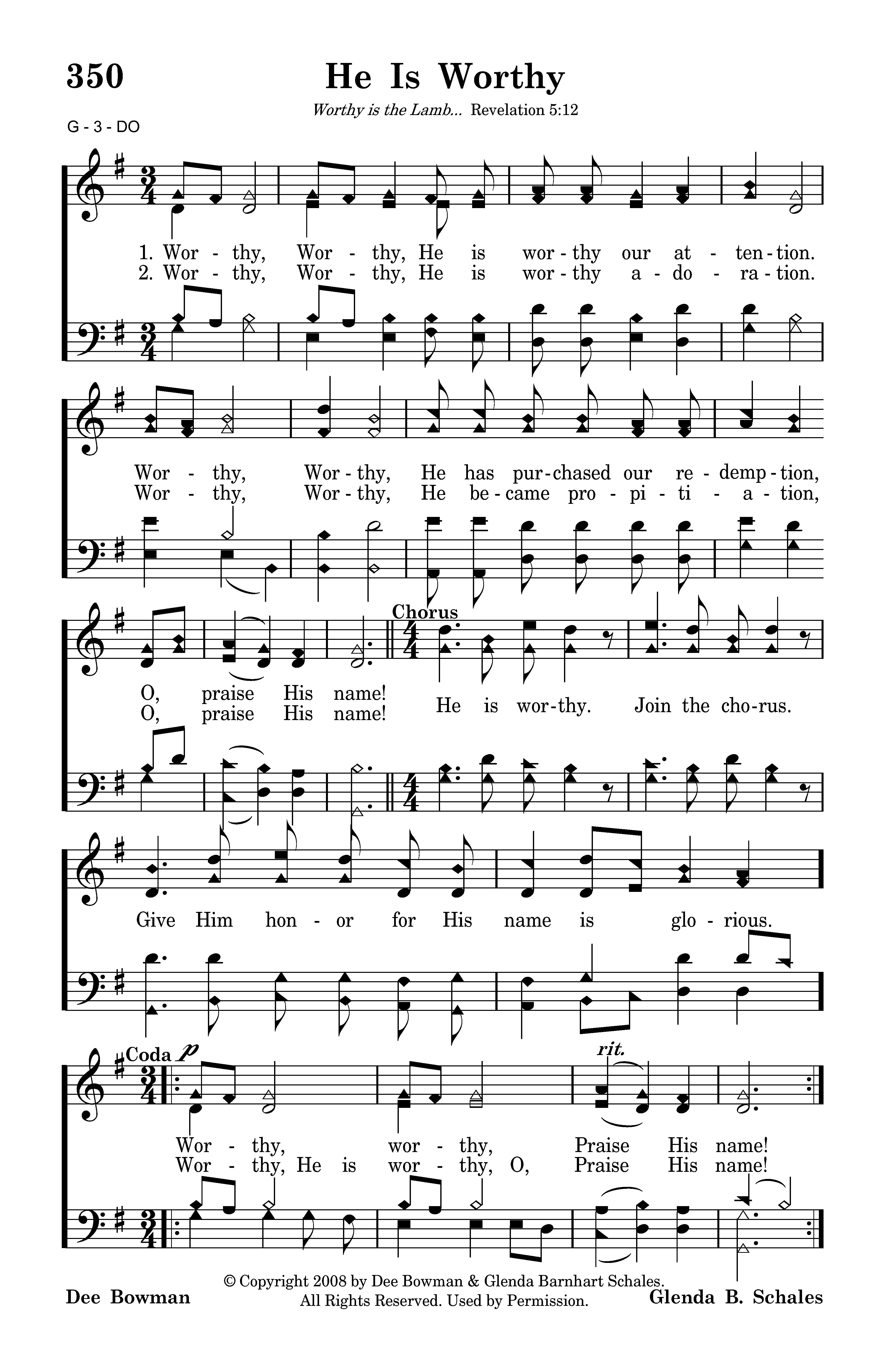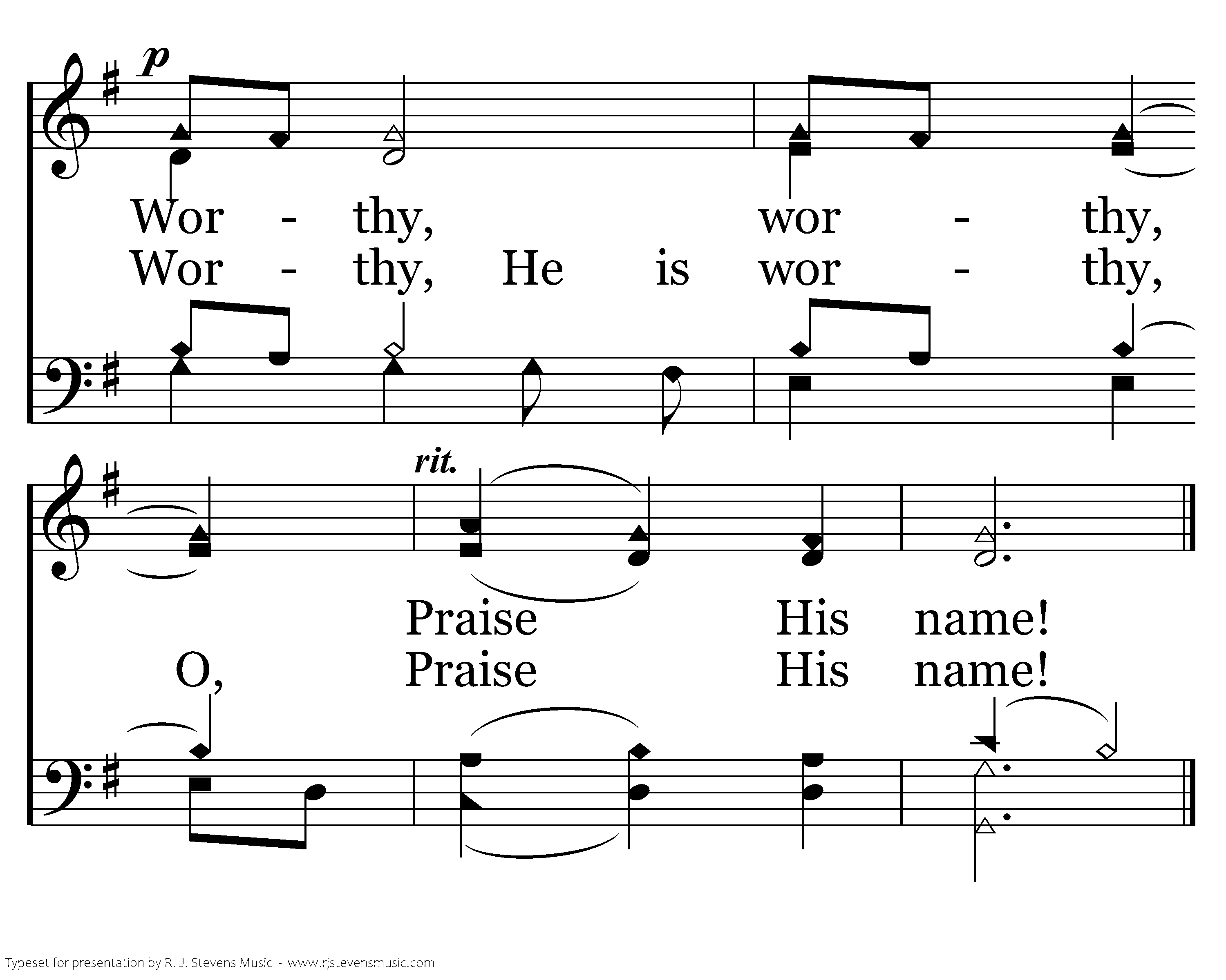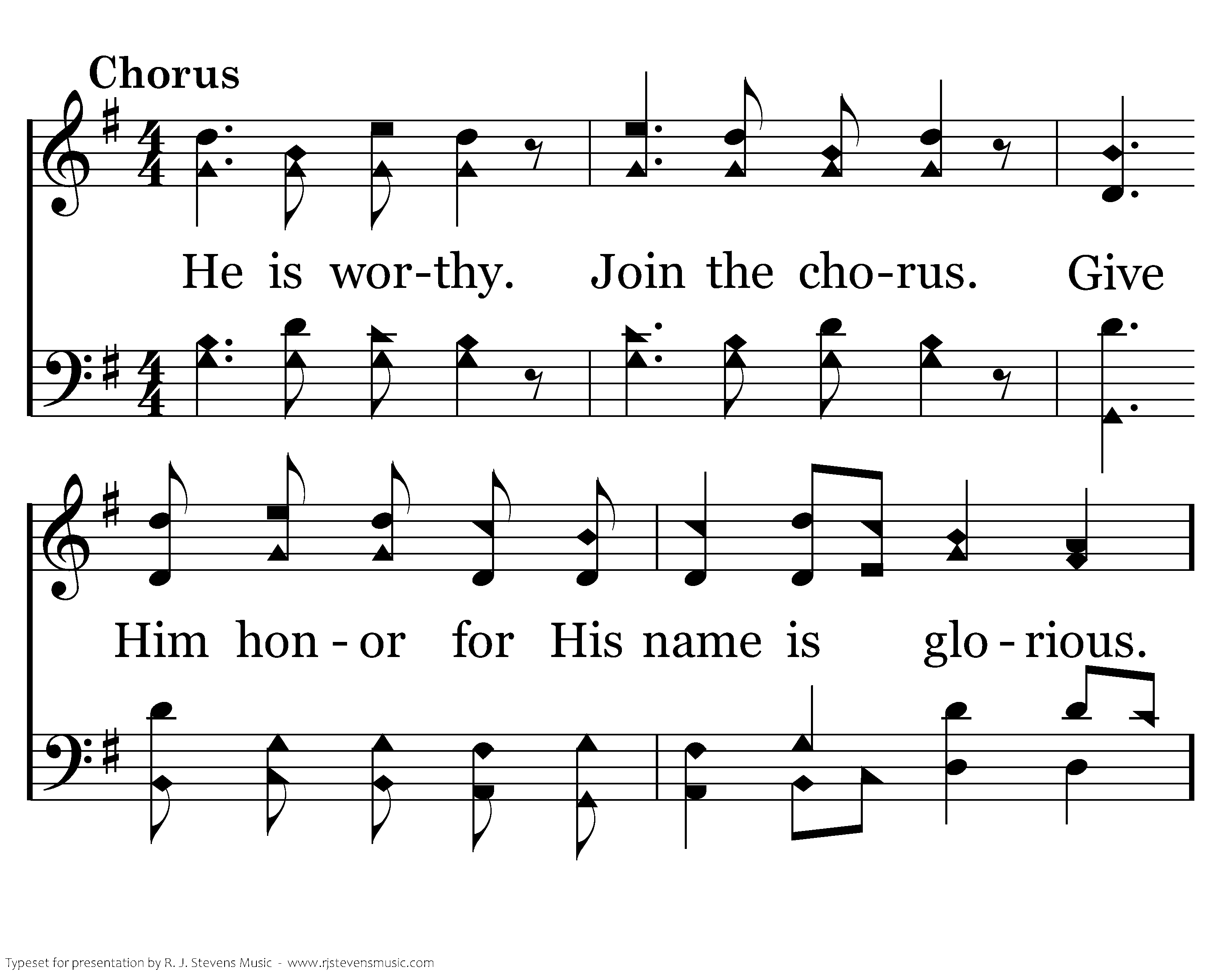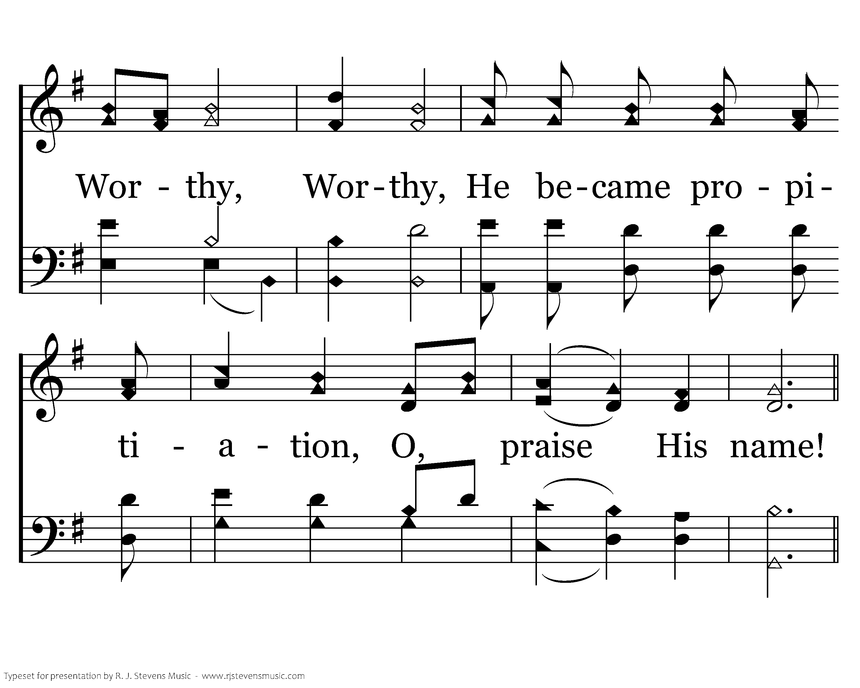 Worthy, Worthy, He is worthy adoration. Worthy, Worthy, He became propitiation, O, praise His name! He is worthy. Join the chorus. Give Him honor for His name is glorious. Worthy, worthy, Praise His name!