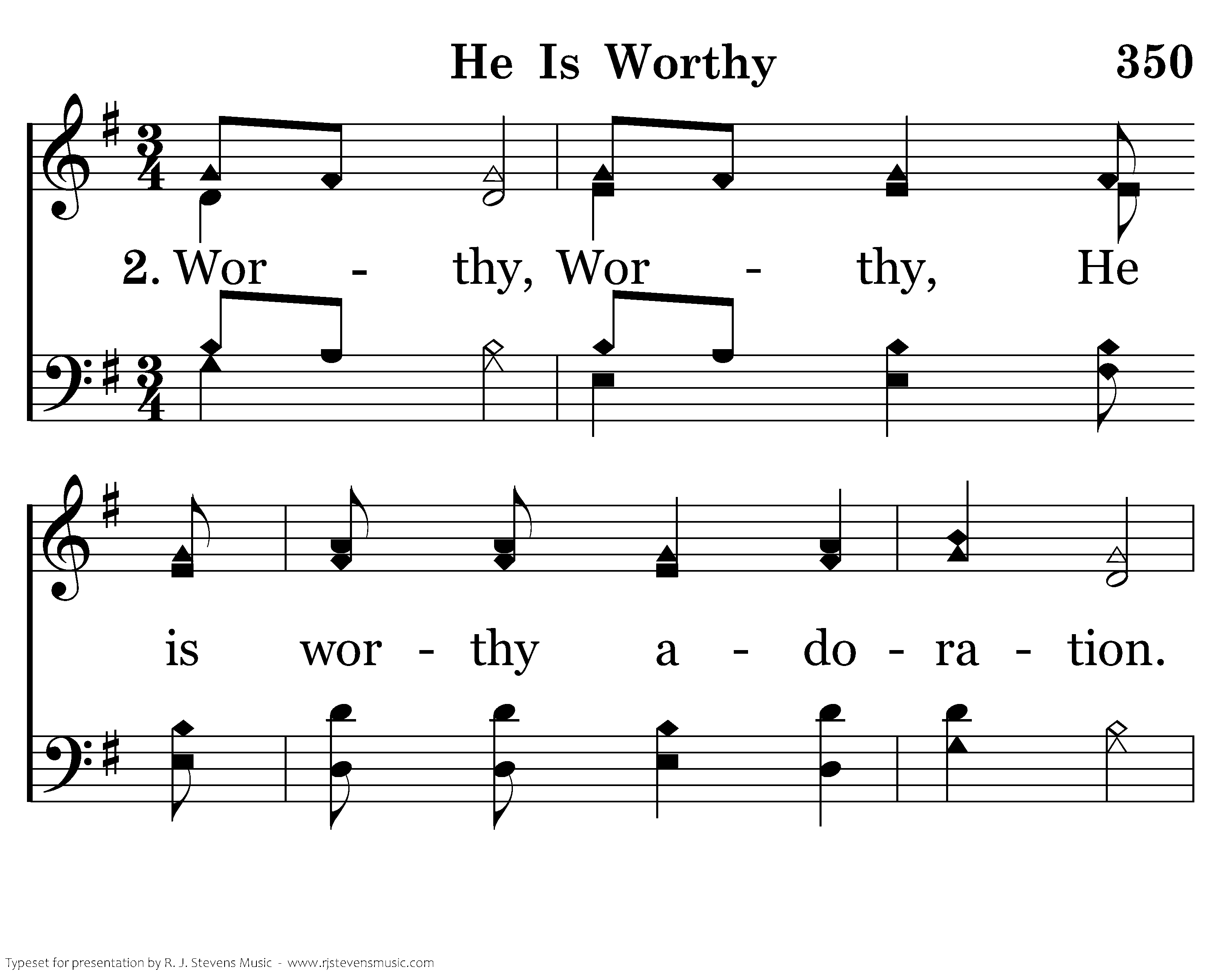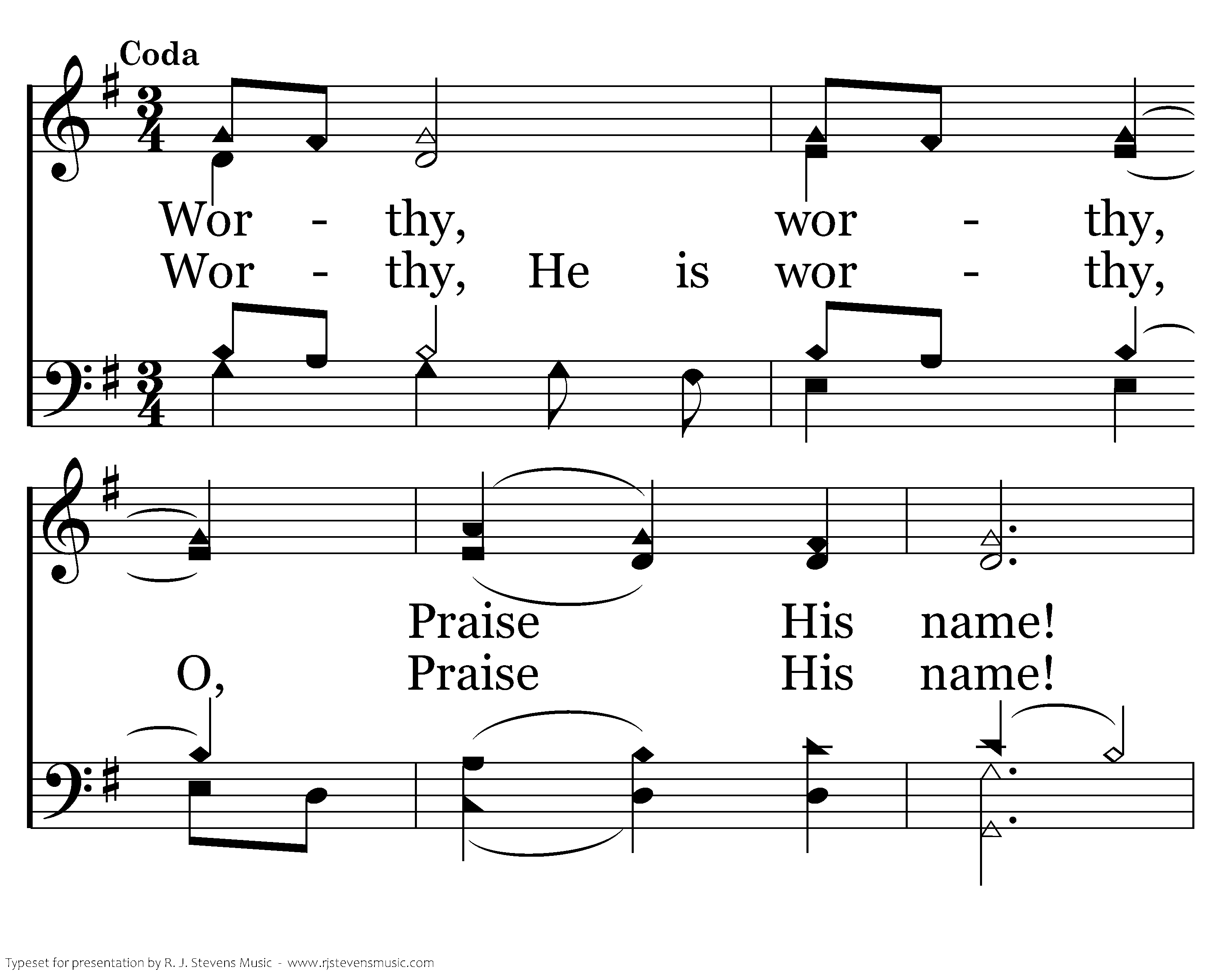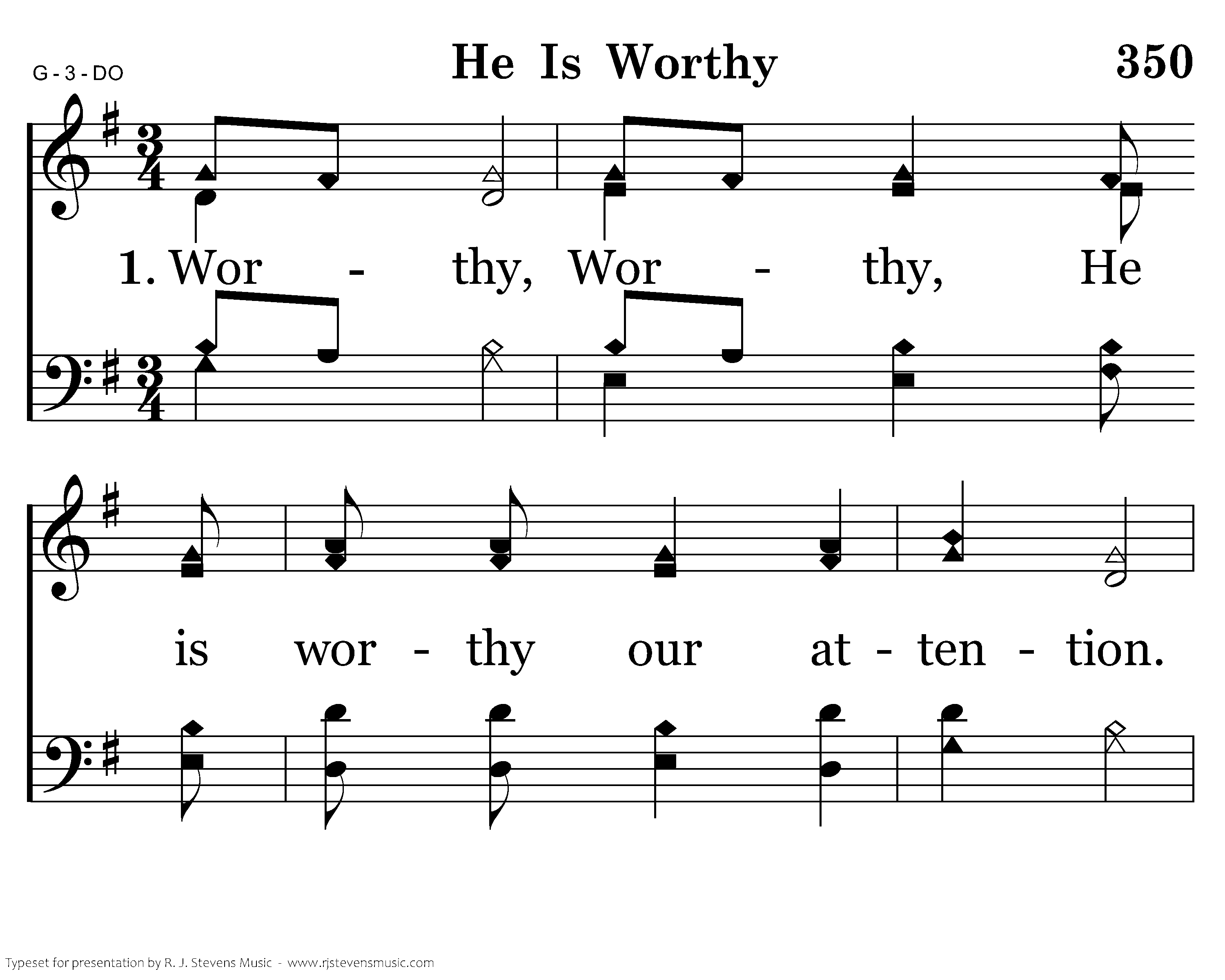 Worthy, Worthy, He is worthy our attention. Worthy, Worthy, He has purchased our redemption, O, praise His name! He is worthy. Join the chorus. Give Him honor for His name is glorious.