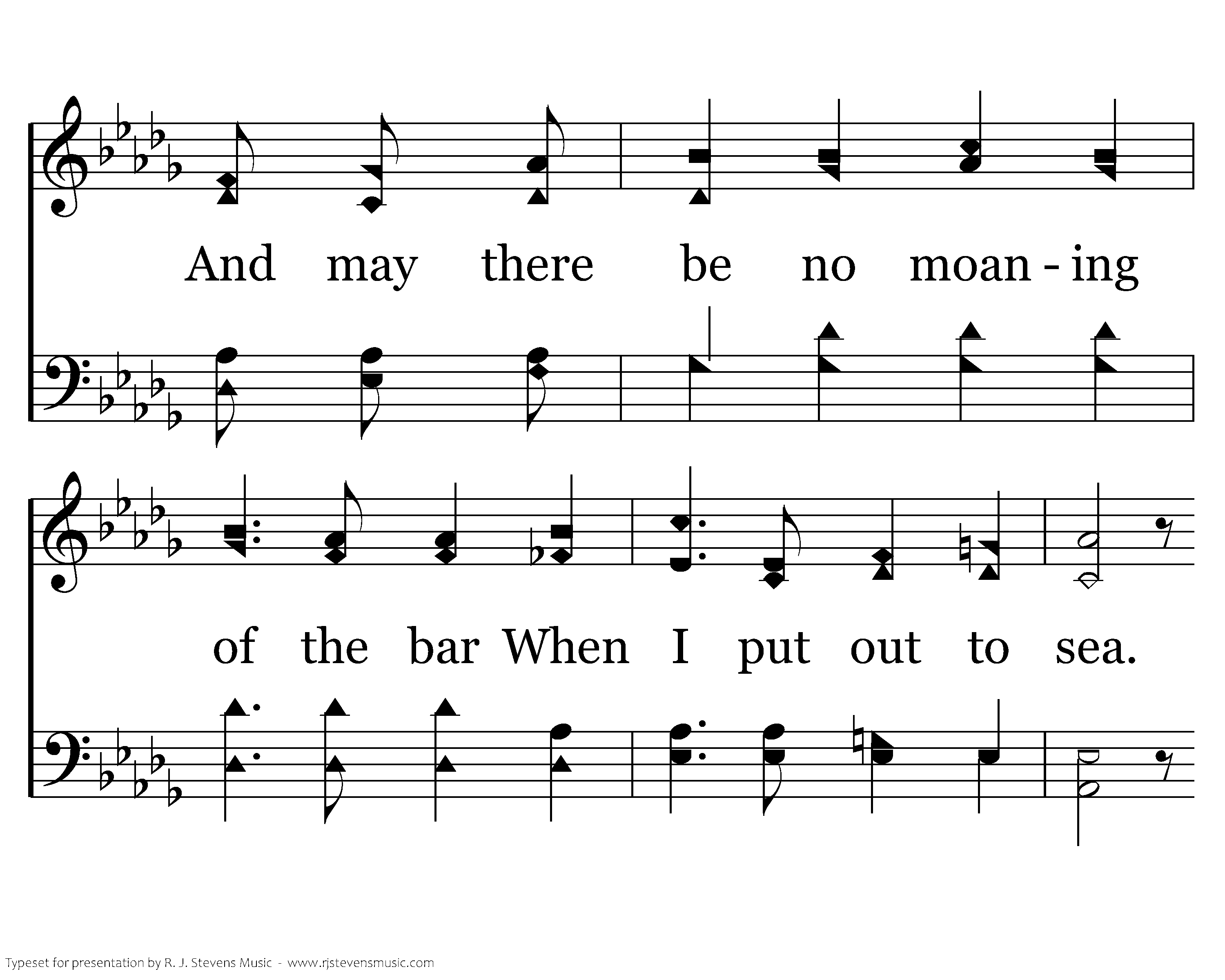 Twilight and evening bell, And after that the dark! And may there be no sadness of farewell When I, when I embark; For, tho' from out our bourne of time and place The flood may bear me far, I hope to see my Pilot face to face When I have crossed the bar.