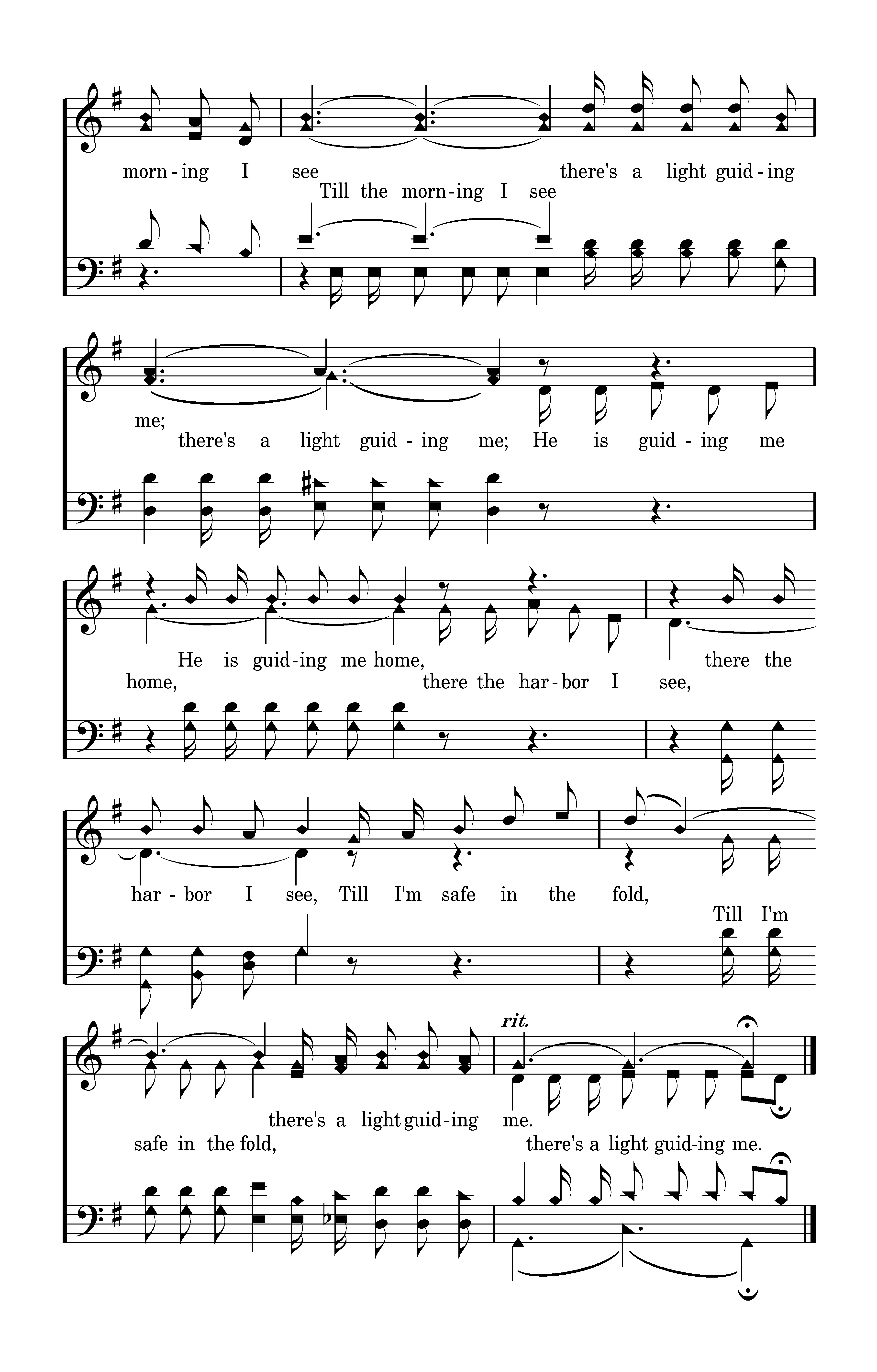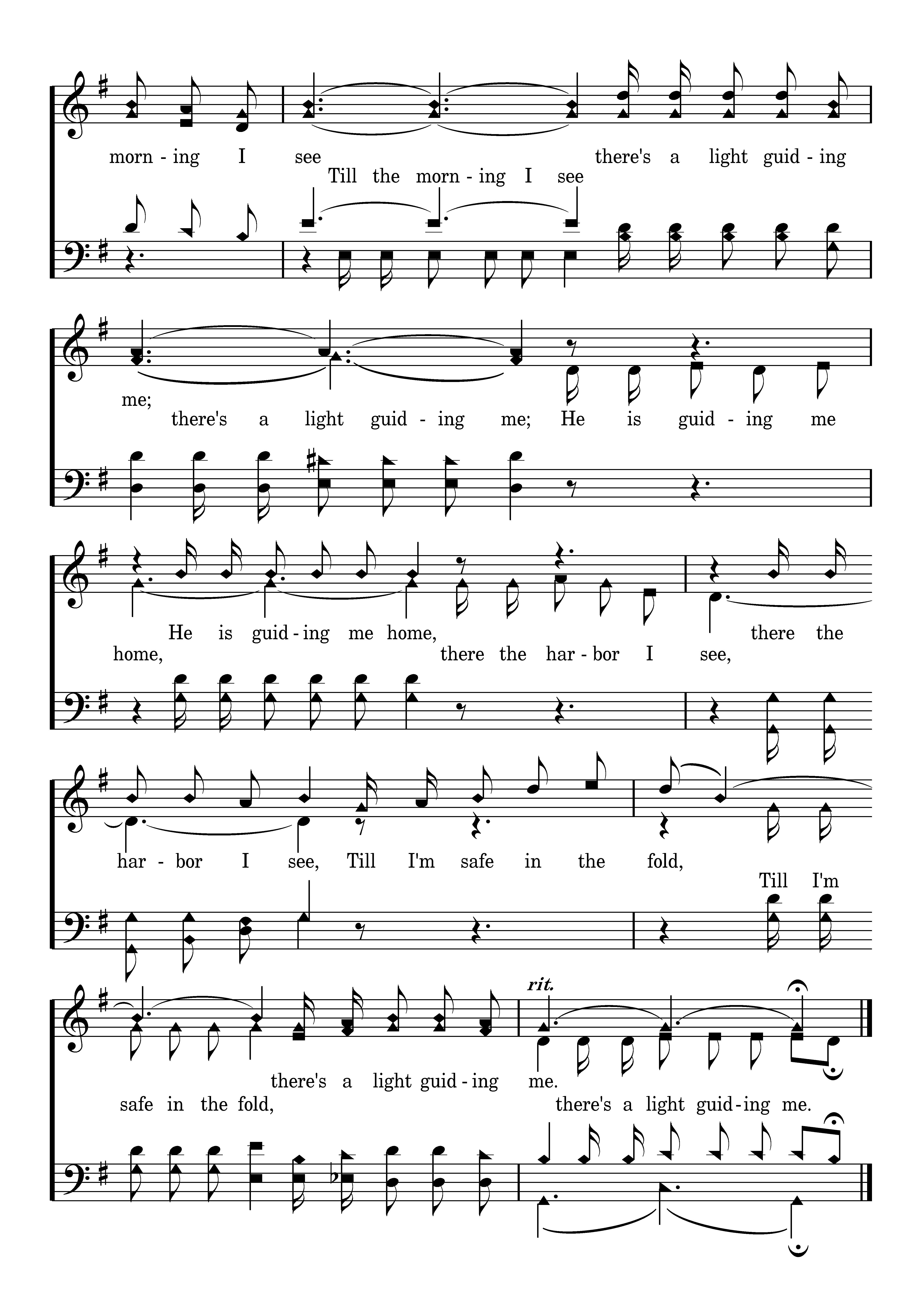 There's a light guiding me thru the darkness of midnight, 'Til the morning I see there's a light guiding me; He is guiding me home, there the harbor I see, 'Til I'm safe in the fold, there's a light guiding me.