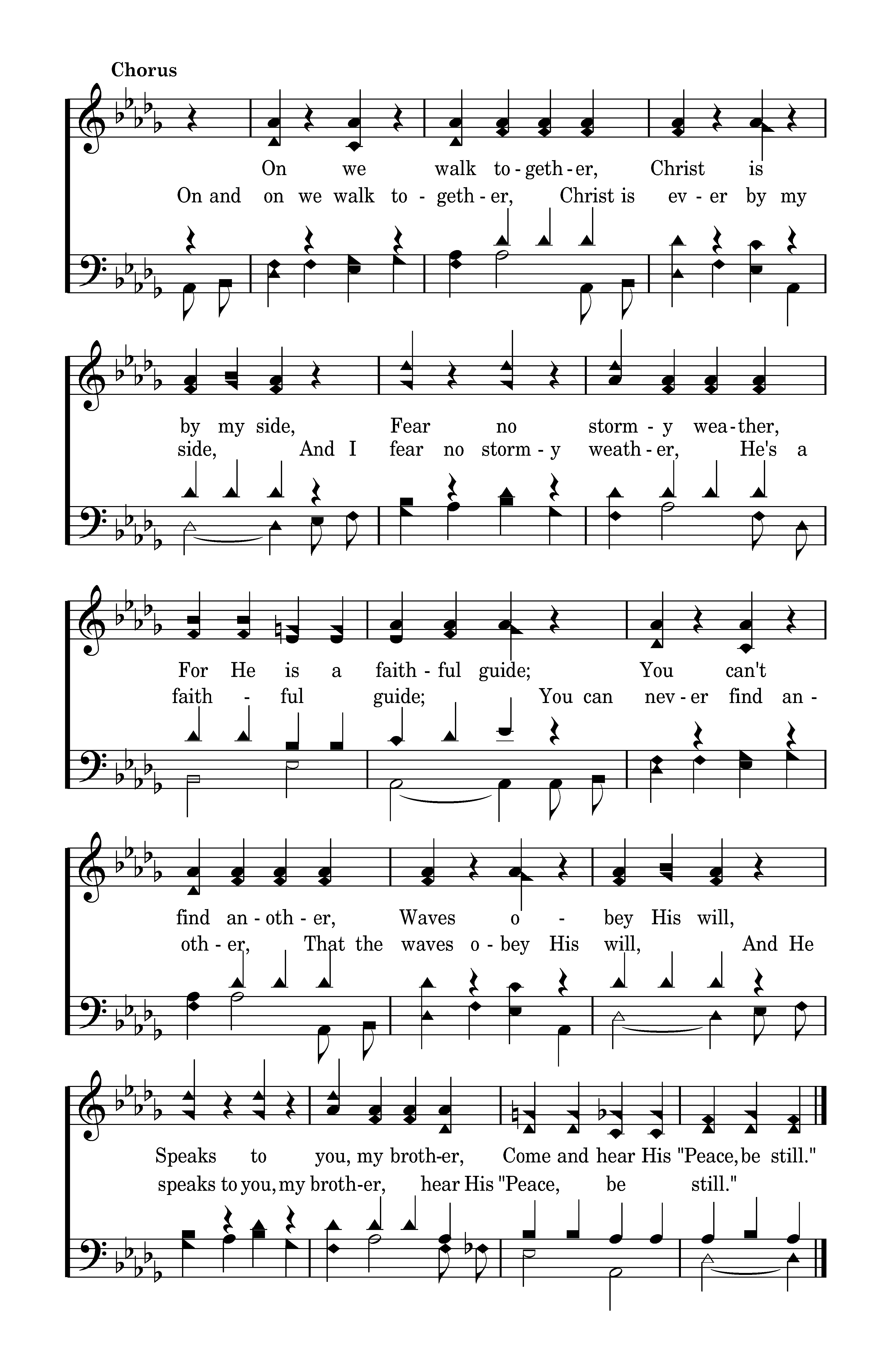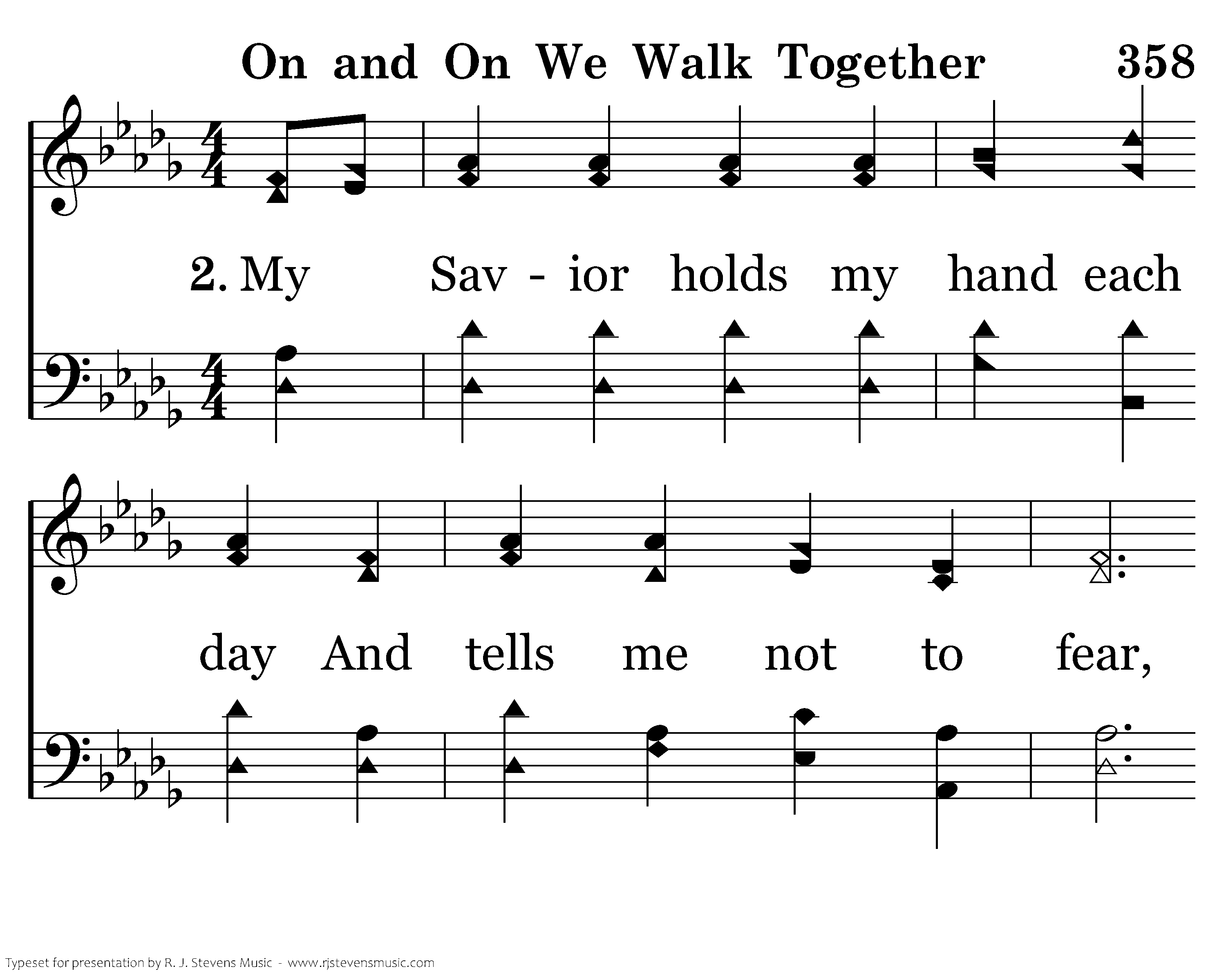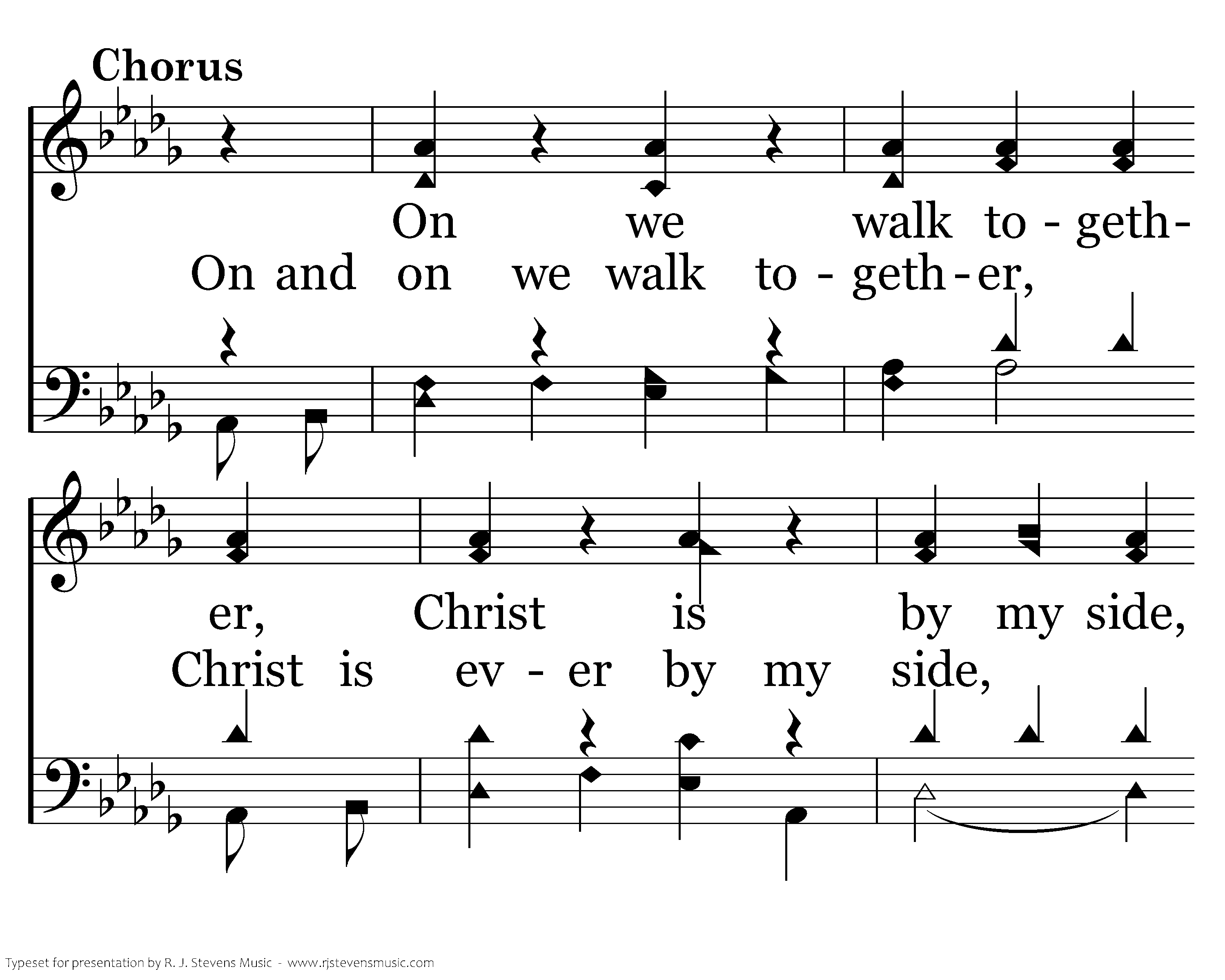 On we walk together, Christ is by my side, Fear no stormy weather, For He is a faithful guide; You can't find another, Waves obey His will, Speaks to you, my brother Come and hear His "Peace be still".
