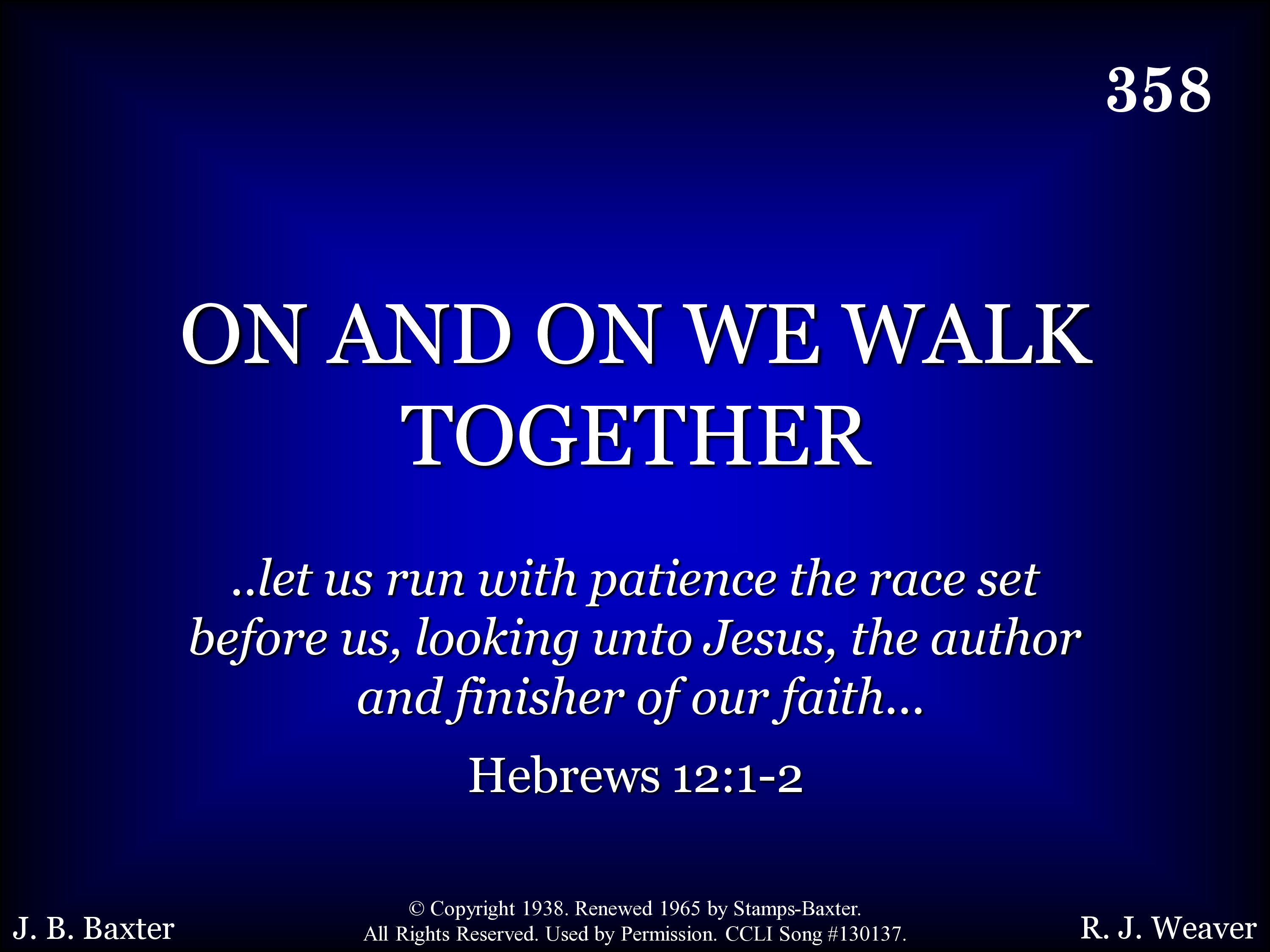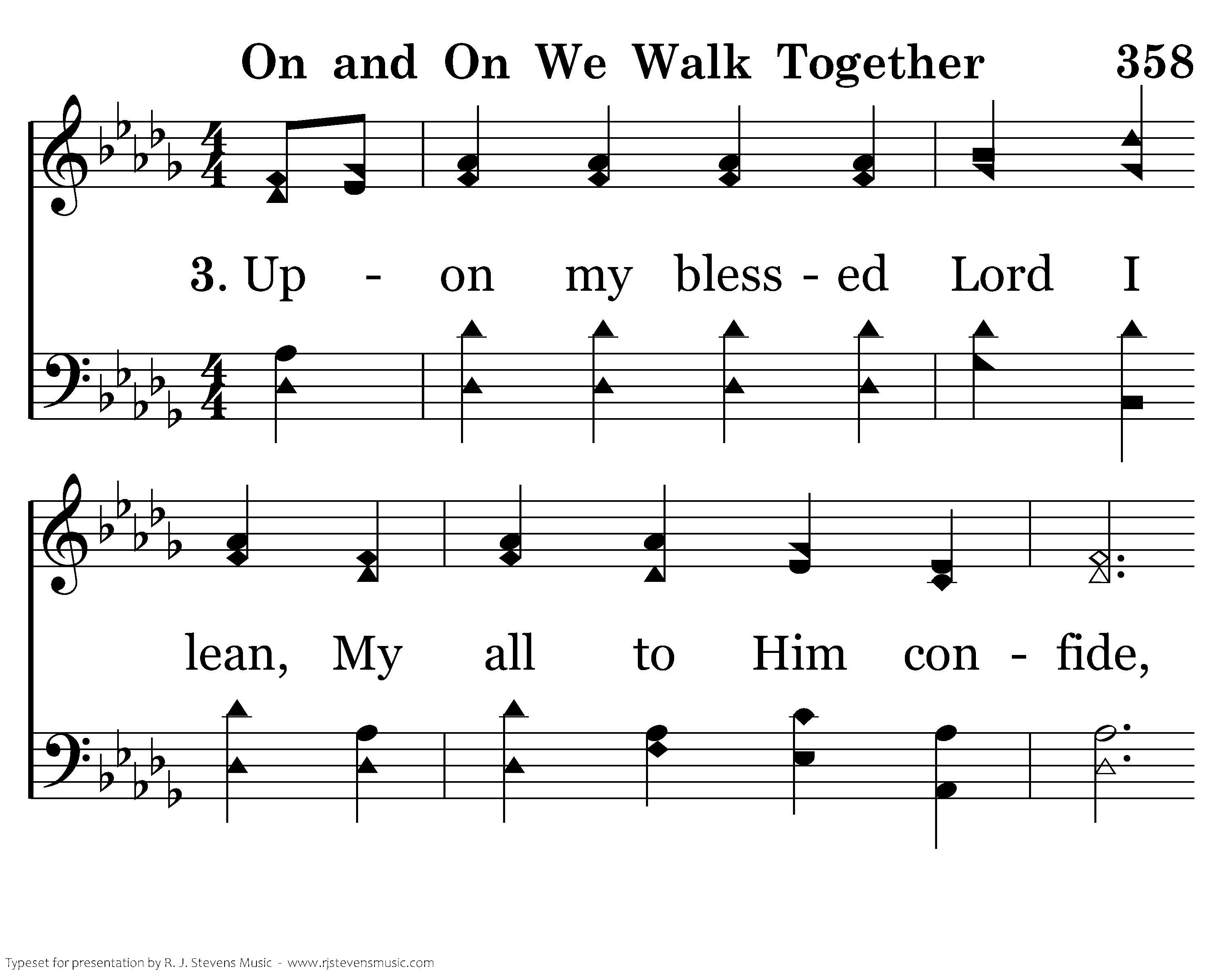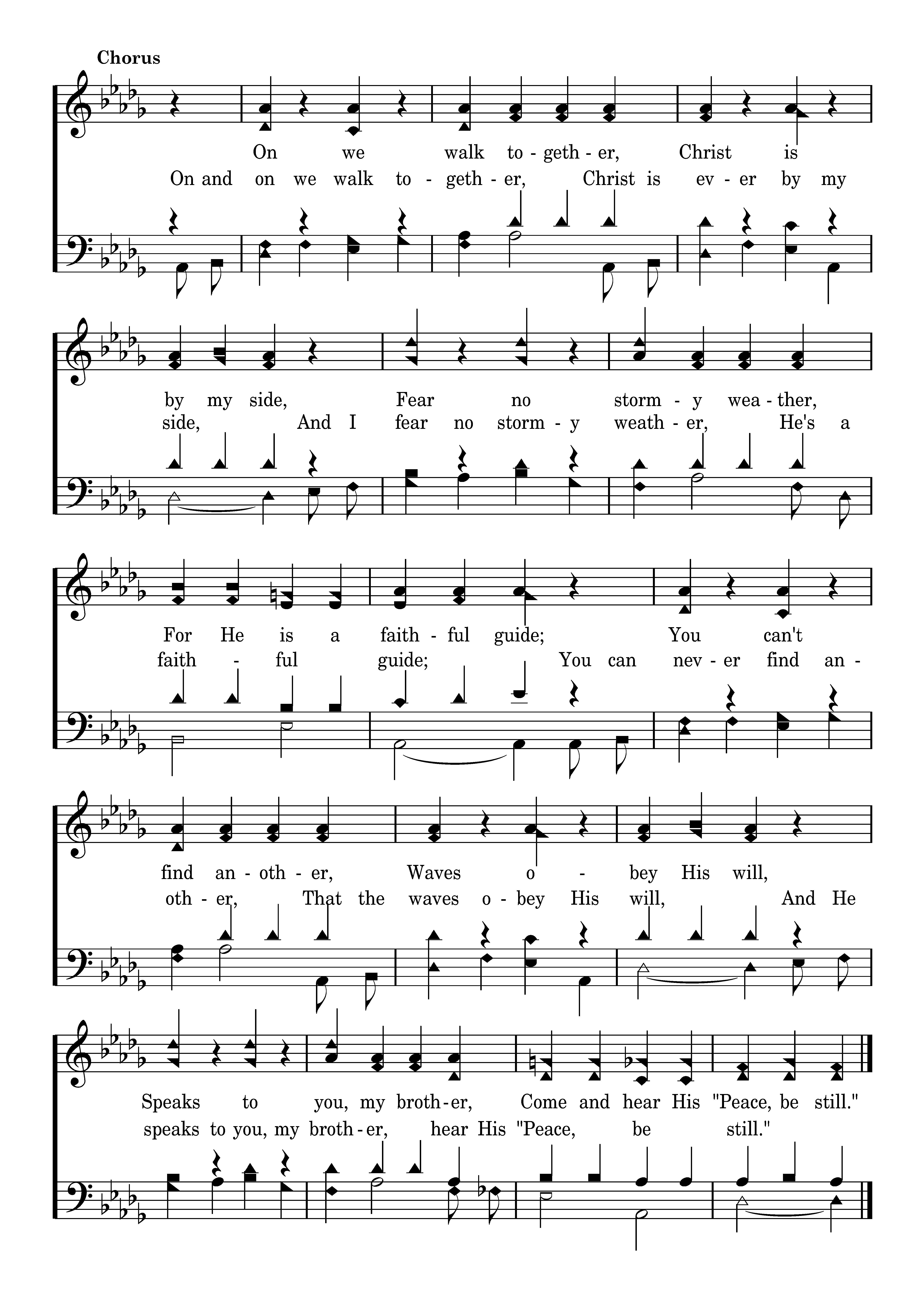 On we walk together, Christ is by my side, Fear no stormy weather, For He is a faithful guide; You can't find another, Waves obey His will, Speaks to you, my brother Come and hear His "Peace be still".