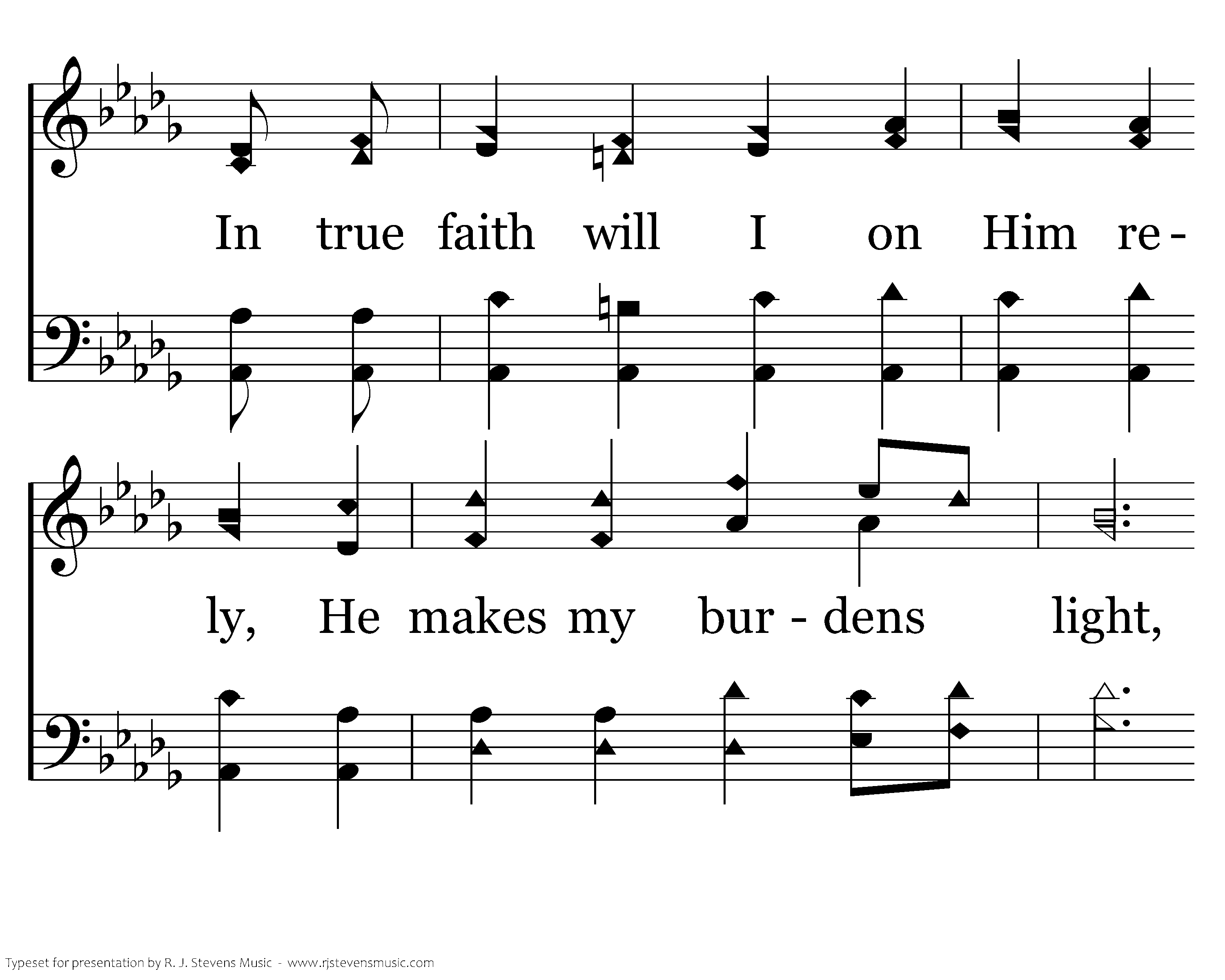 Upon my blessed Lord I lean, My all to Him confide, No more the shadows come between, I'm walking by His side; In true faith will I on Him rely, He makes my burdens light,