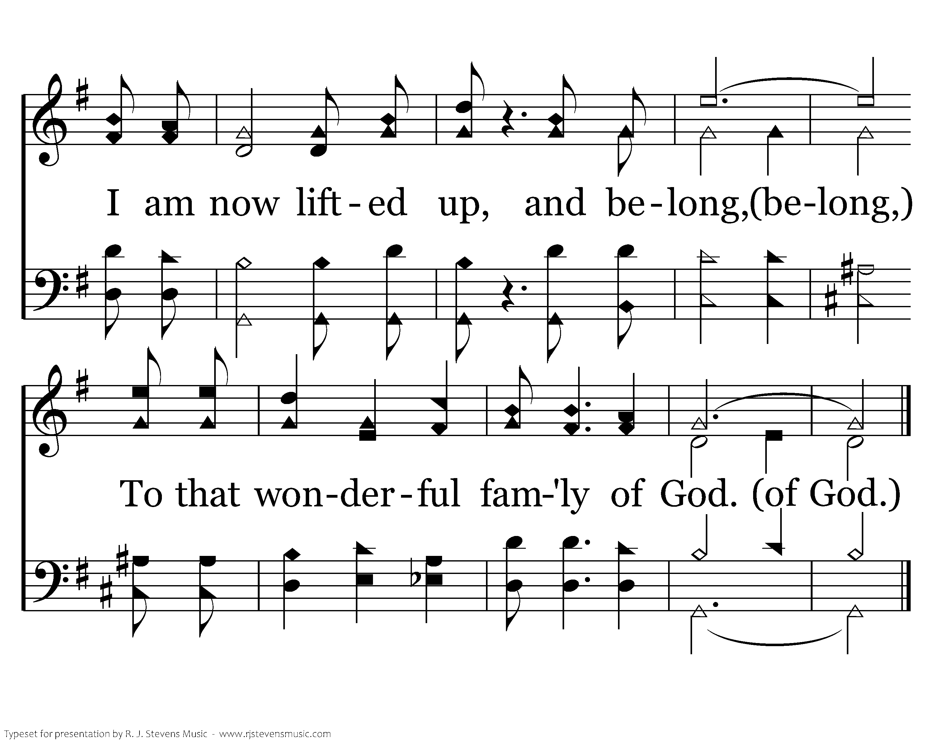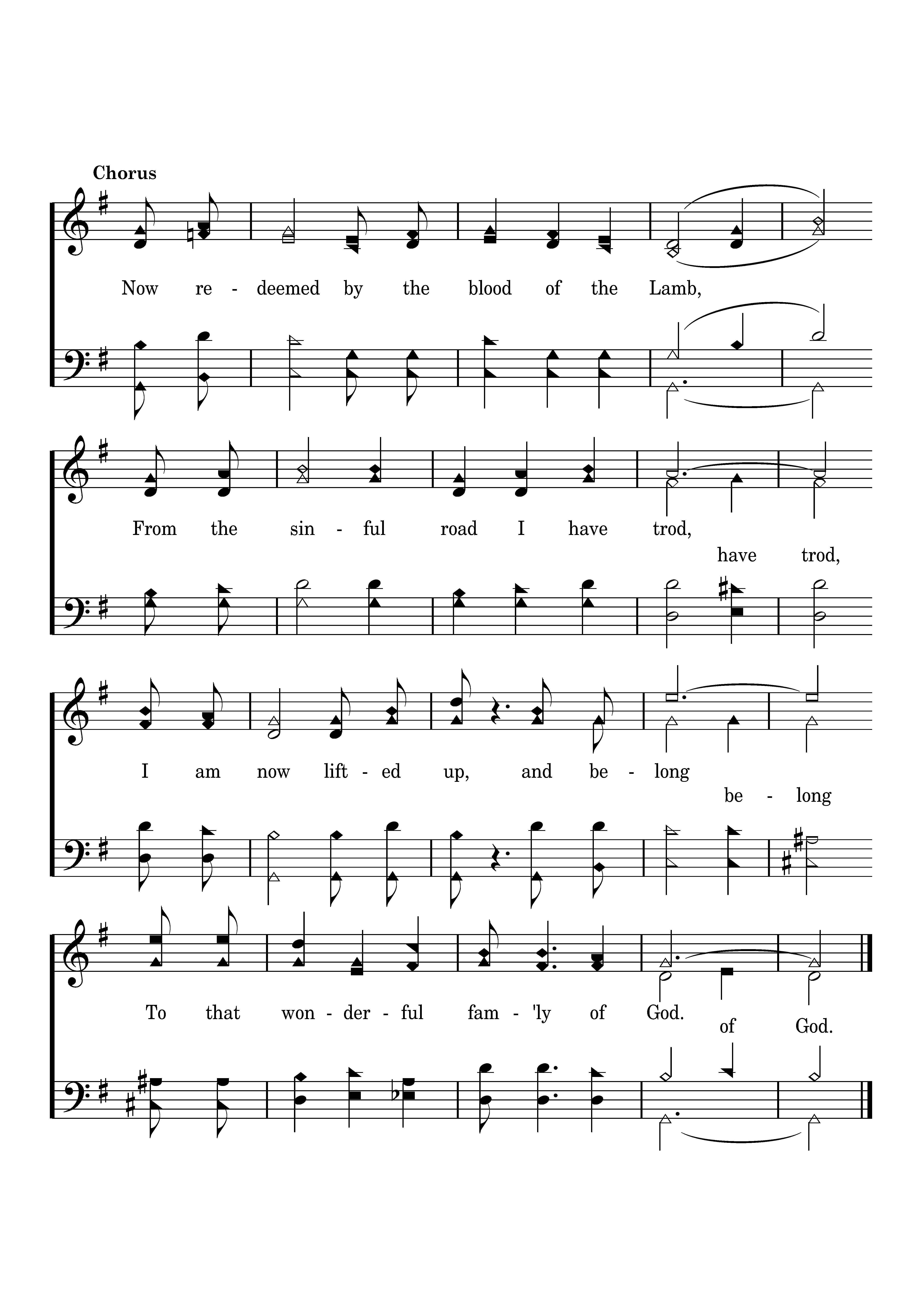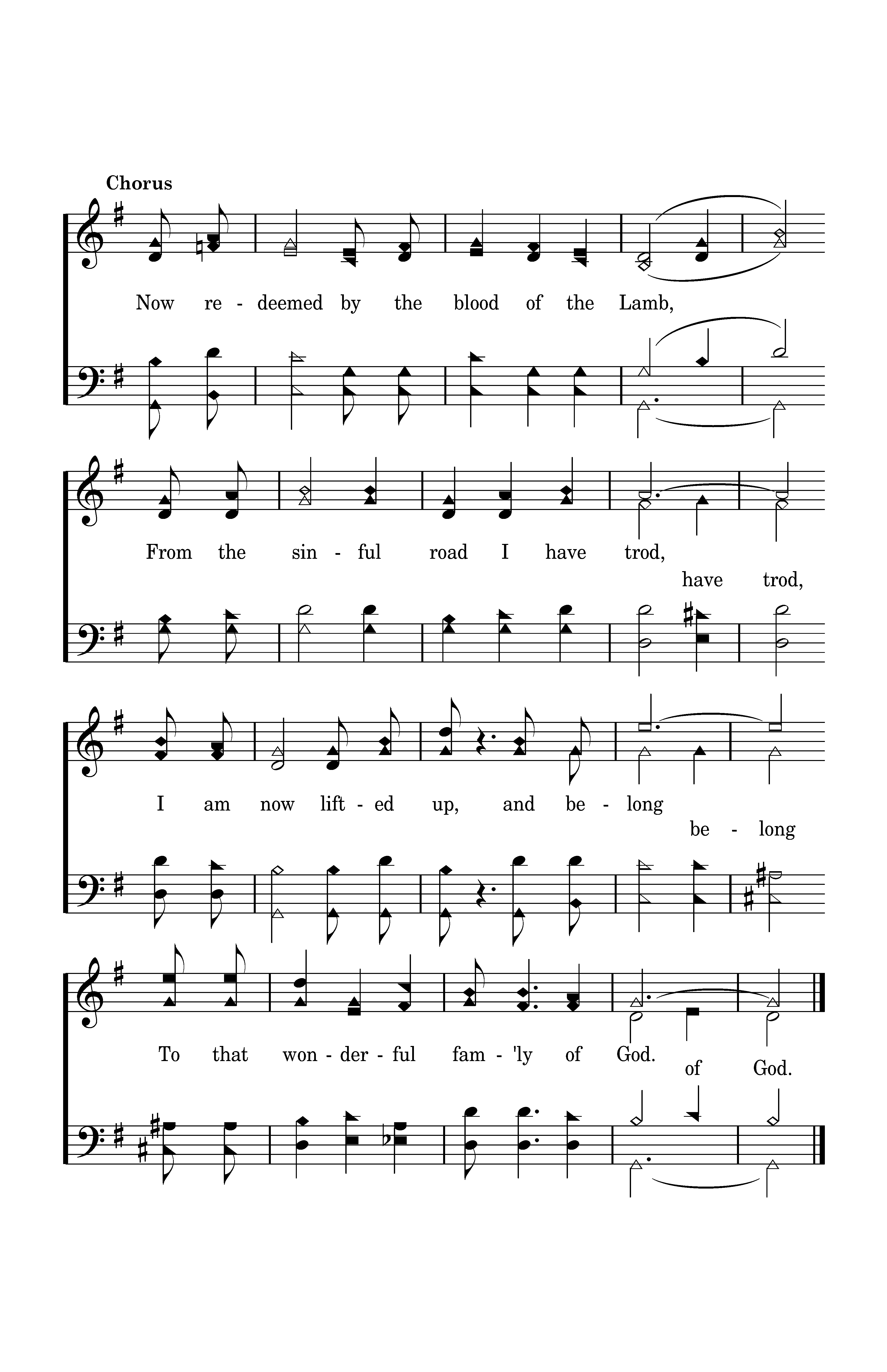 Now redeemed by the blood of the Lamb, from the sinful road I have trod, I am now lifted up, And belong, To that wonderful fam'ly of God.