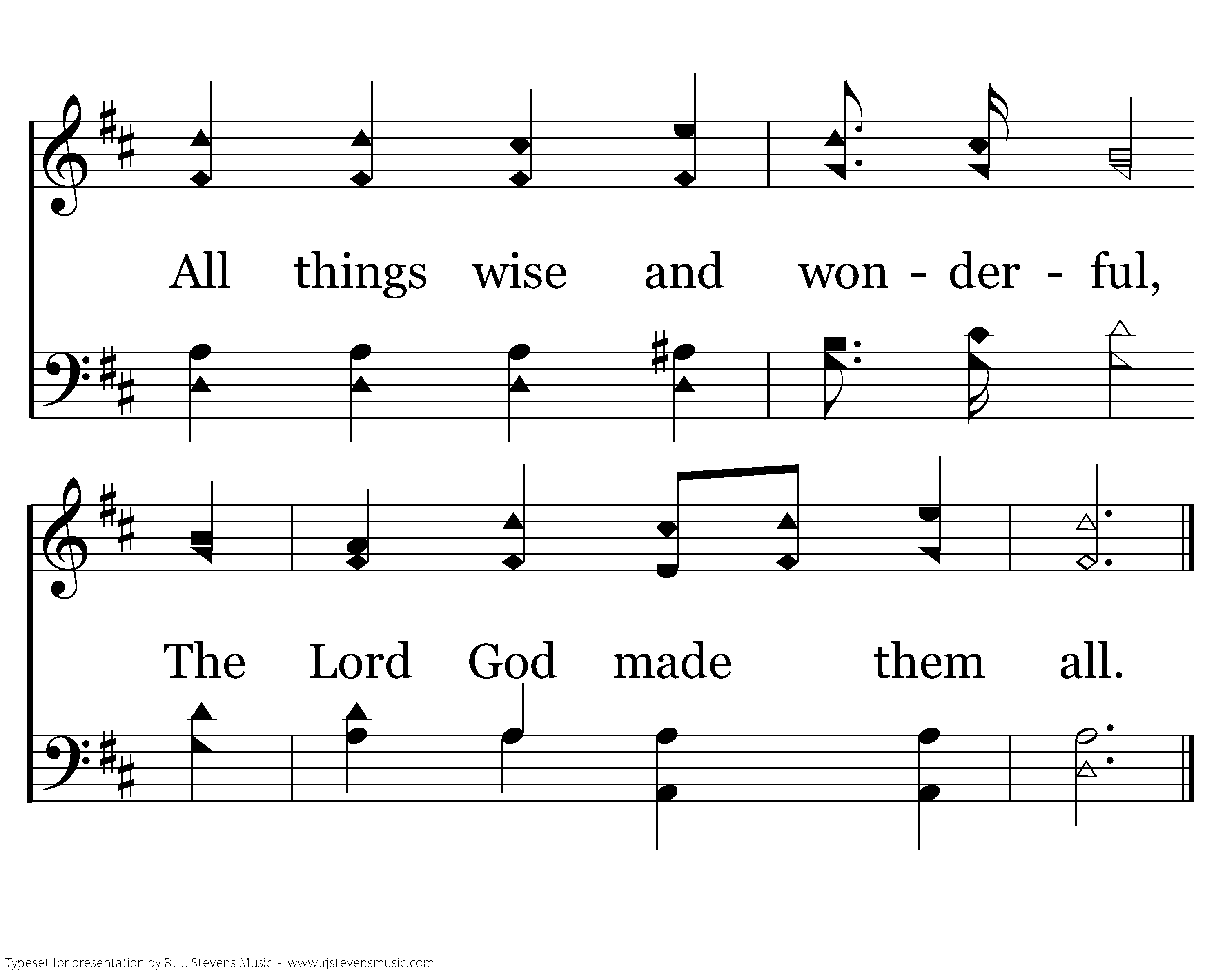 All things bright and beautiful, Creatures great and small, All things wise and wonderful, The Lord God made them all.