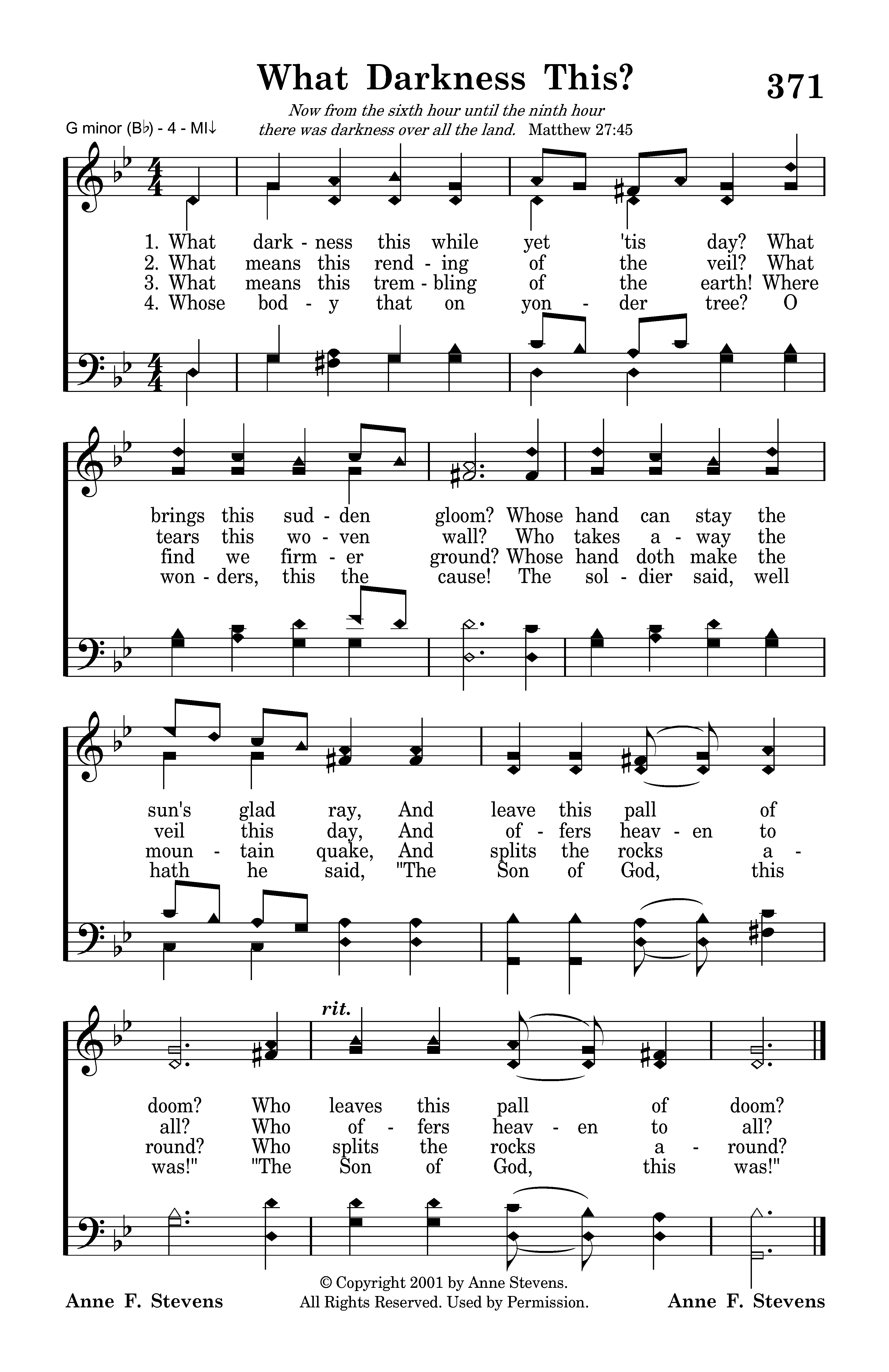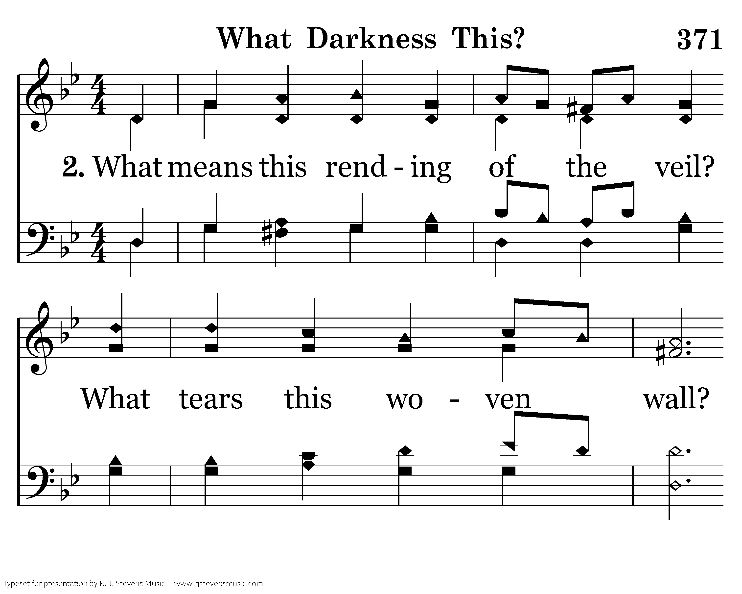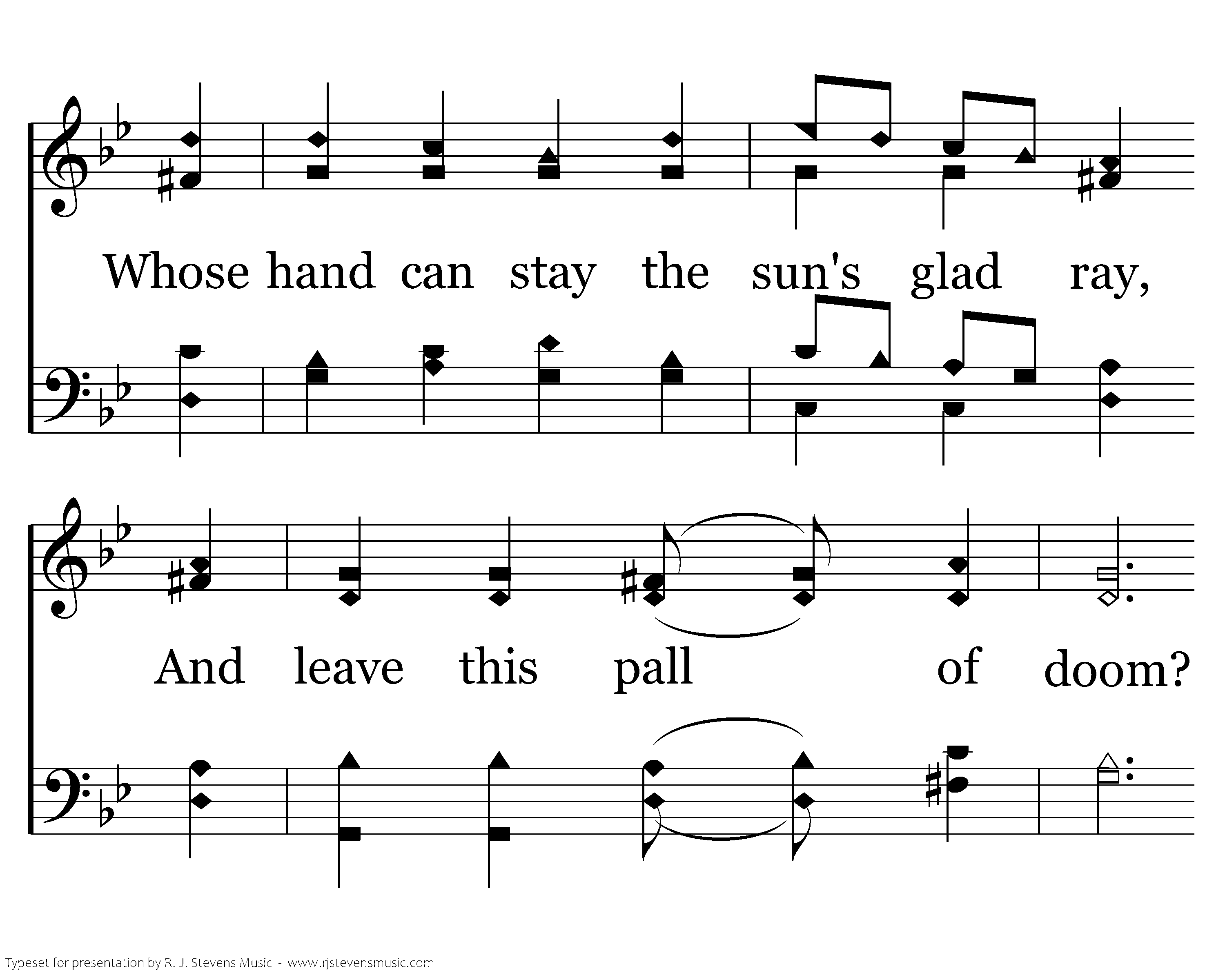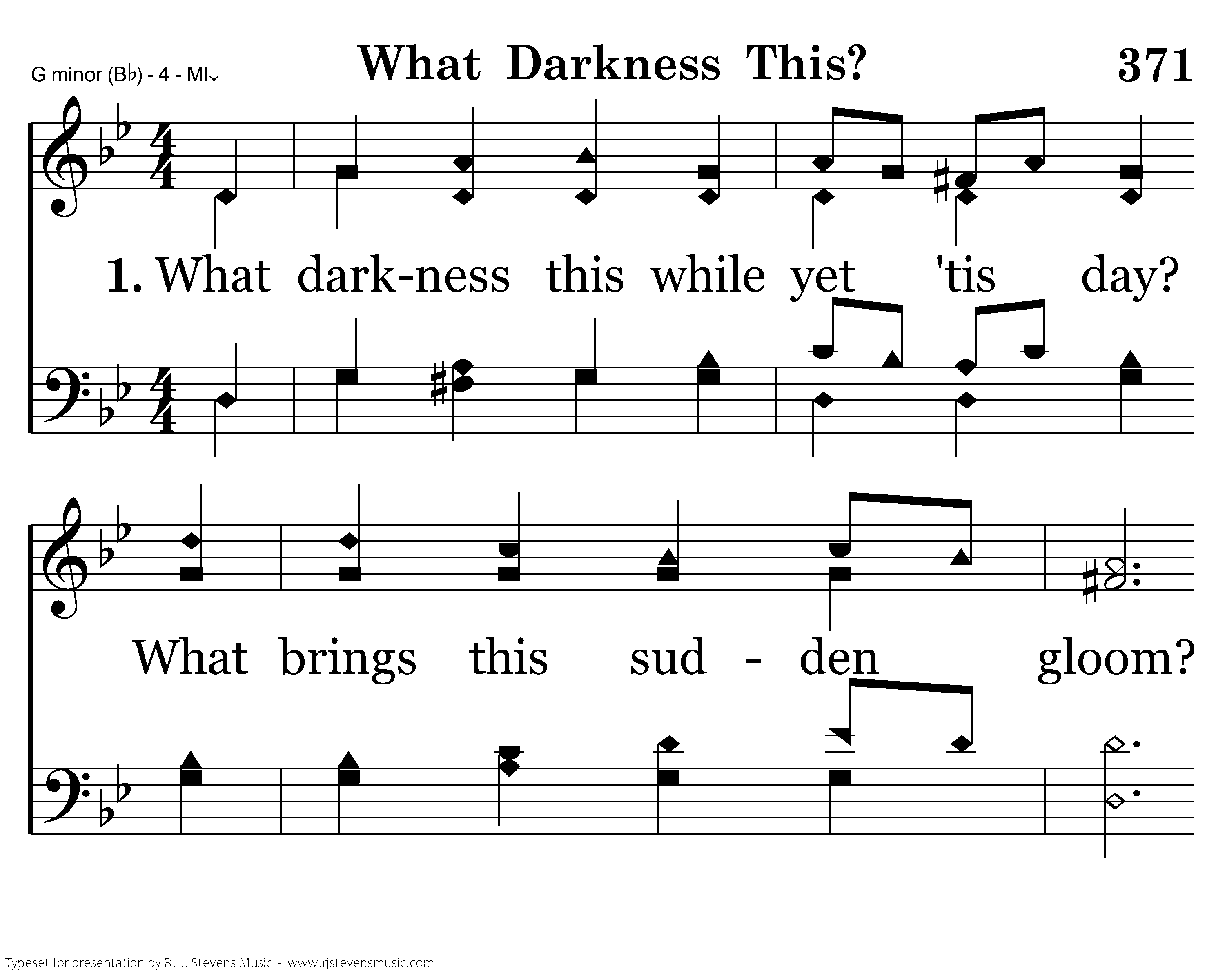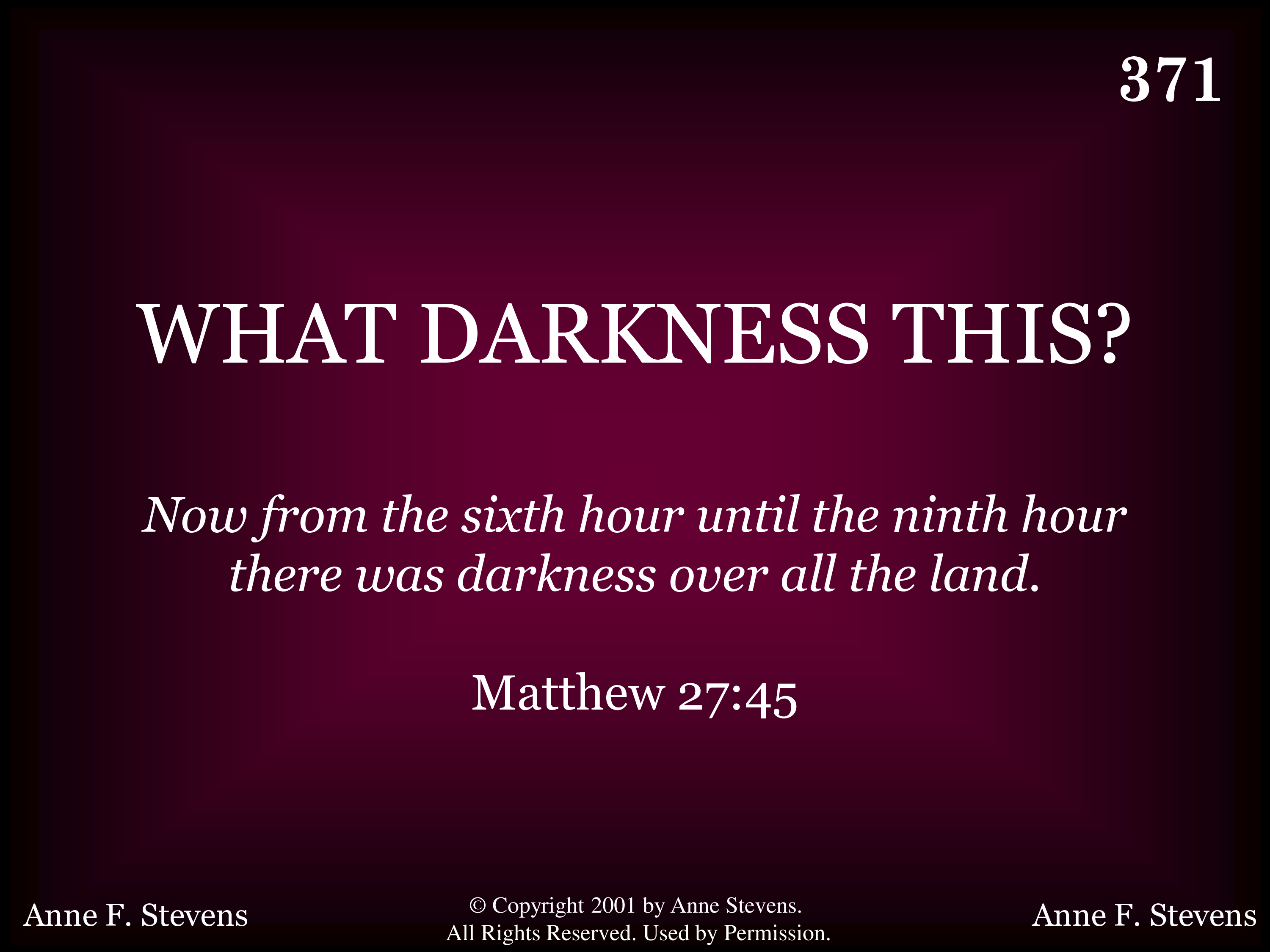 What darkness this while yet 'tis day? What brings this sudden gloom? Whose hand can stay the sun's glad ray, And leave this pall of doom? Who leaves this pall of doom?