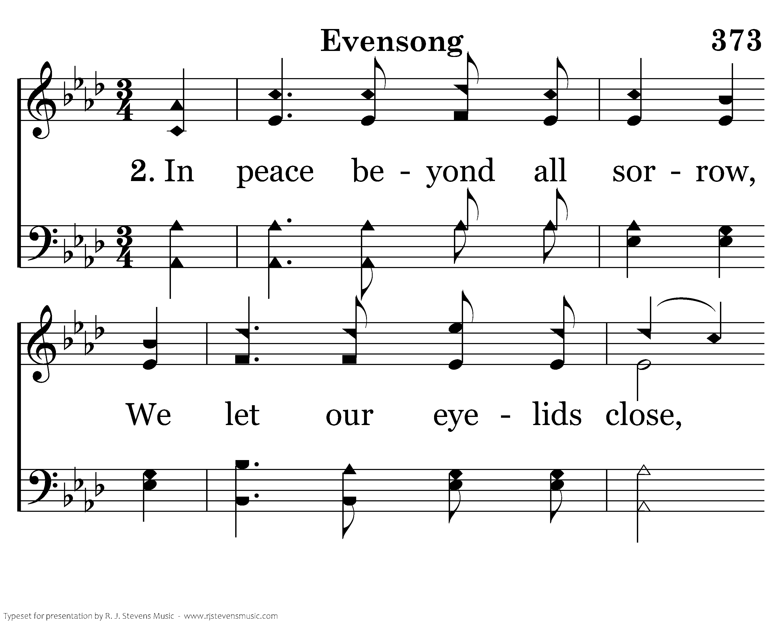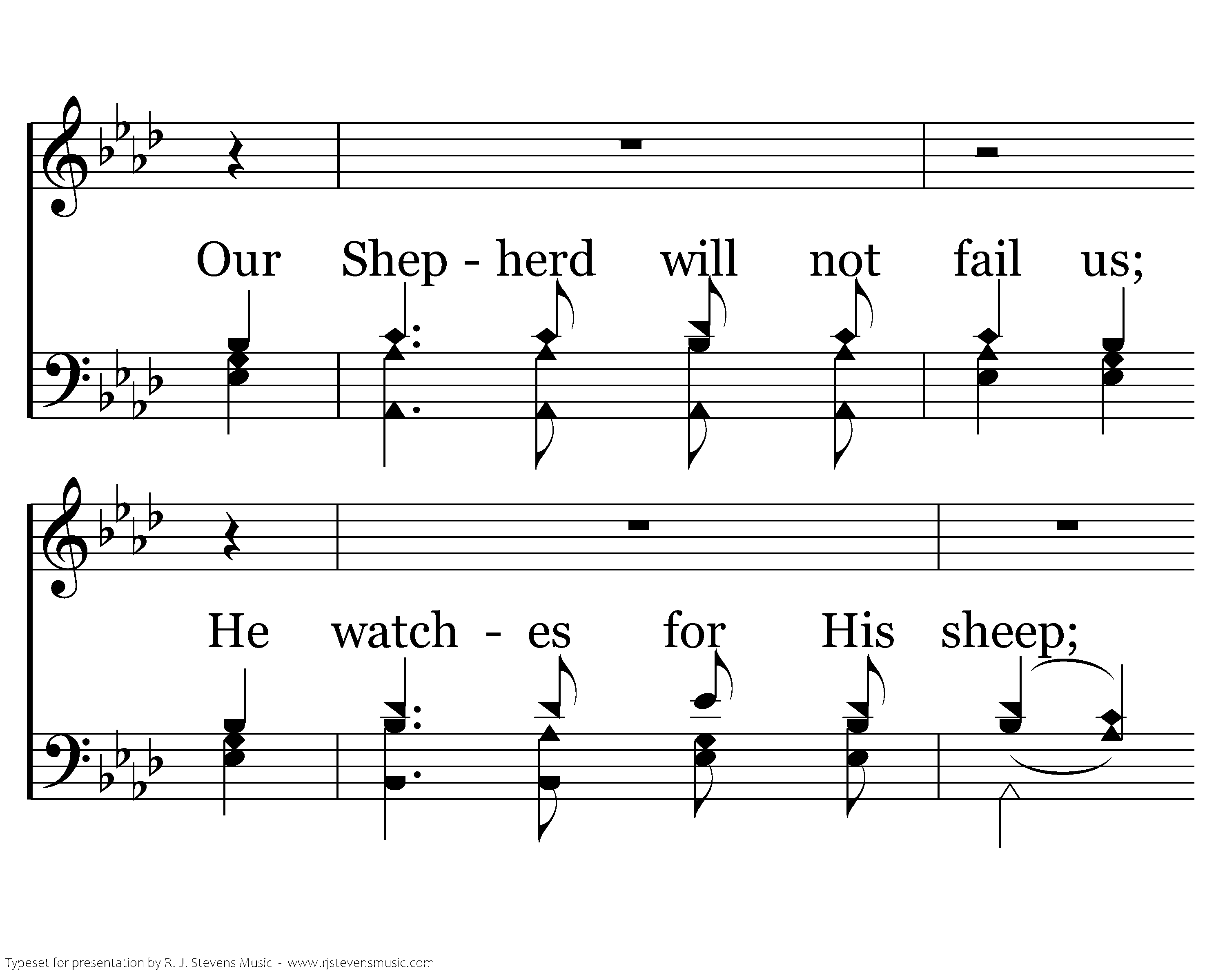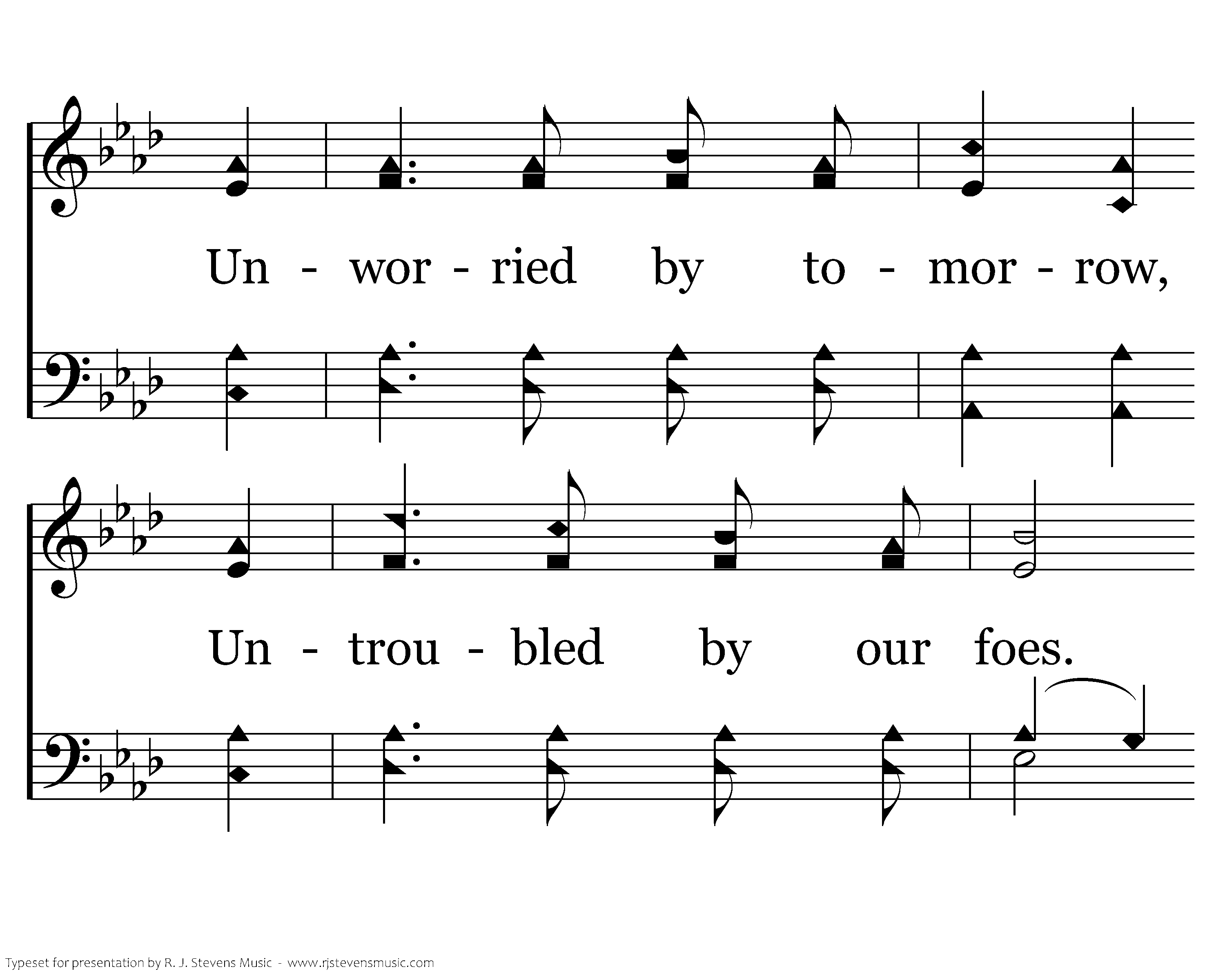 In peace beyond all sorrow, We let our eyelids close, Unworried by tomorrow, Untroubled by our foes. Our Shepherd will not fail us; He watches for His sheep; No evil will assail us, For He will never sleep.