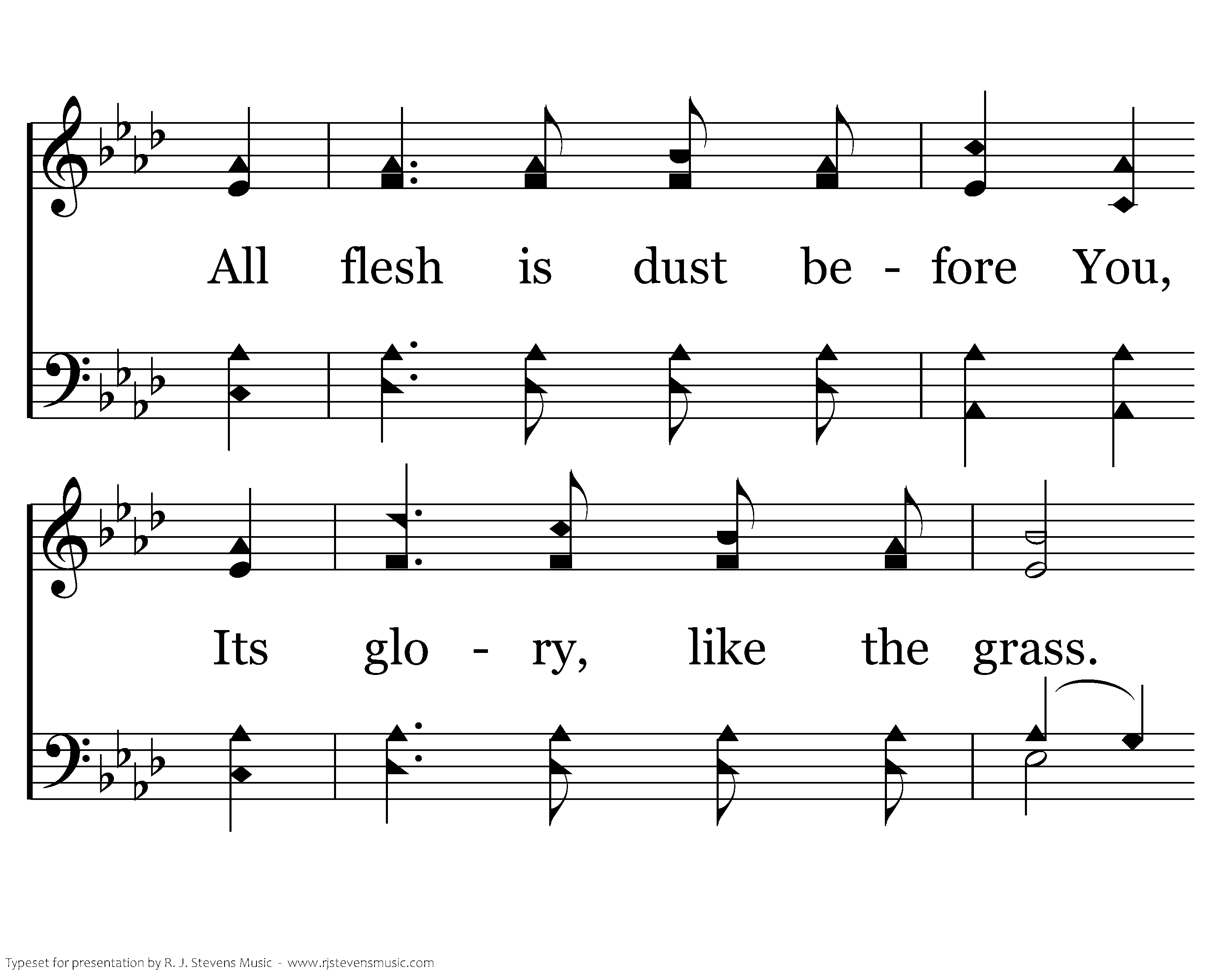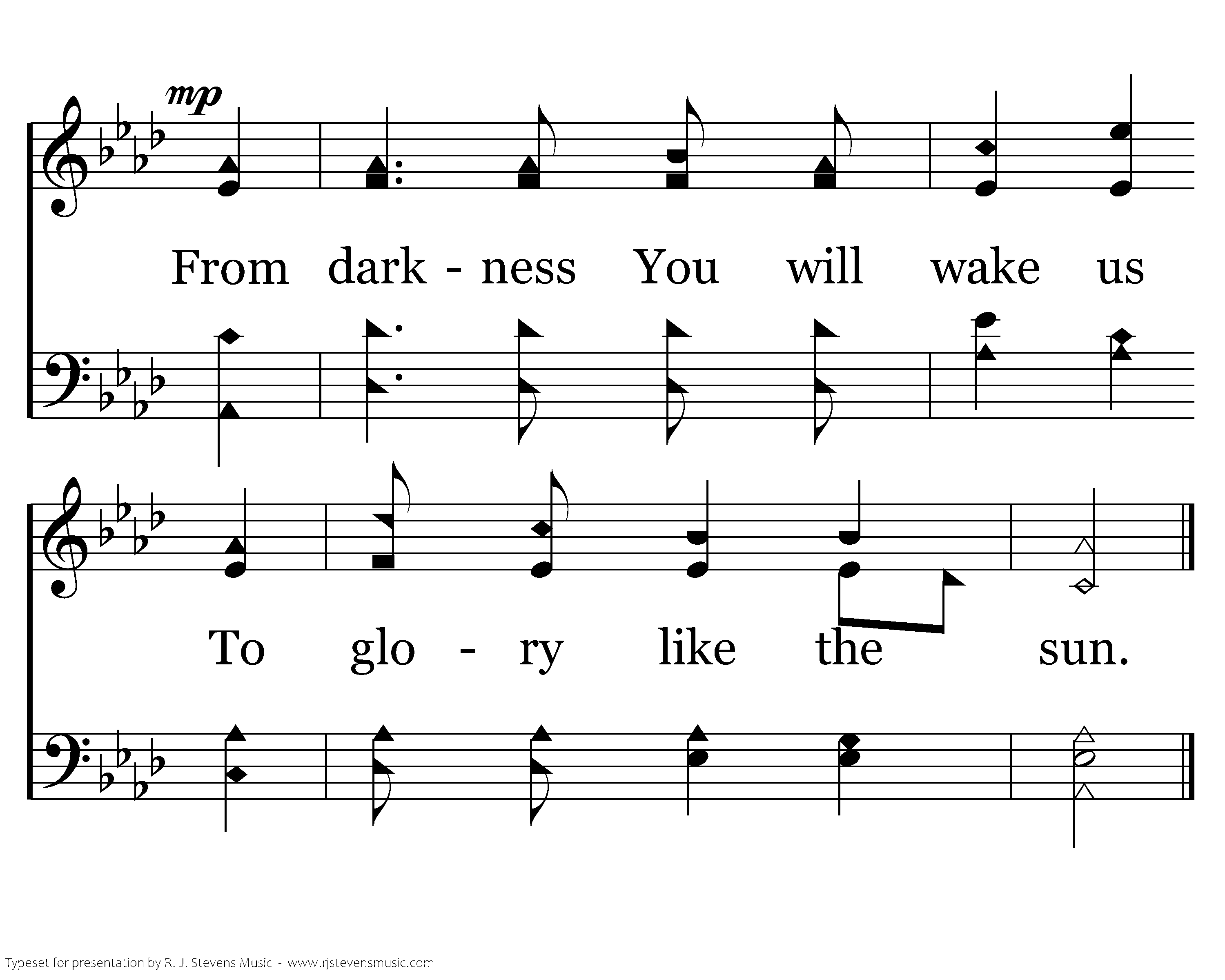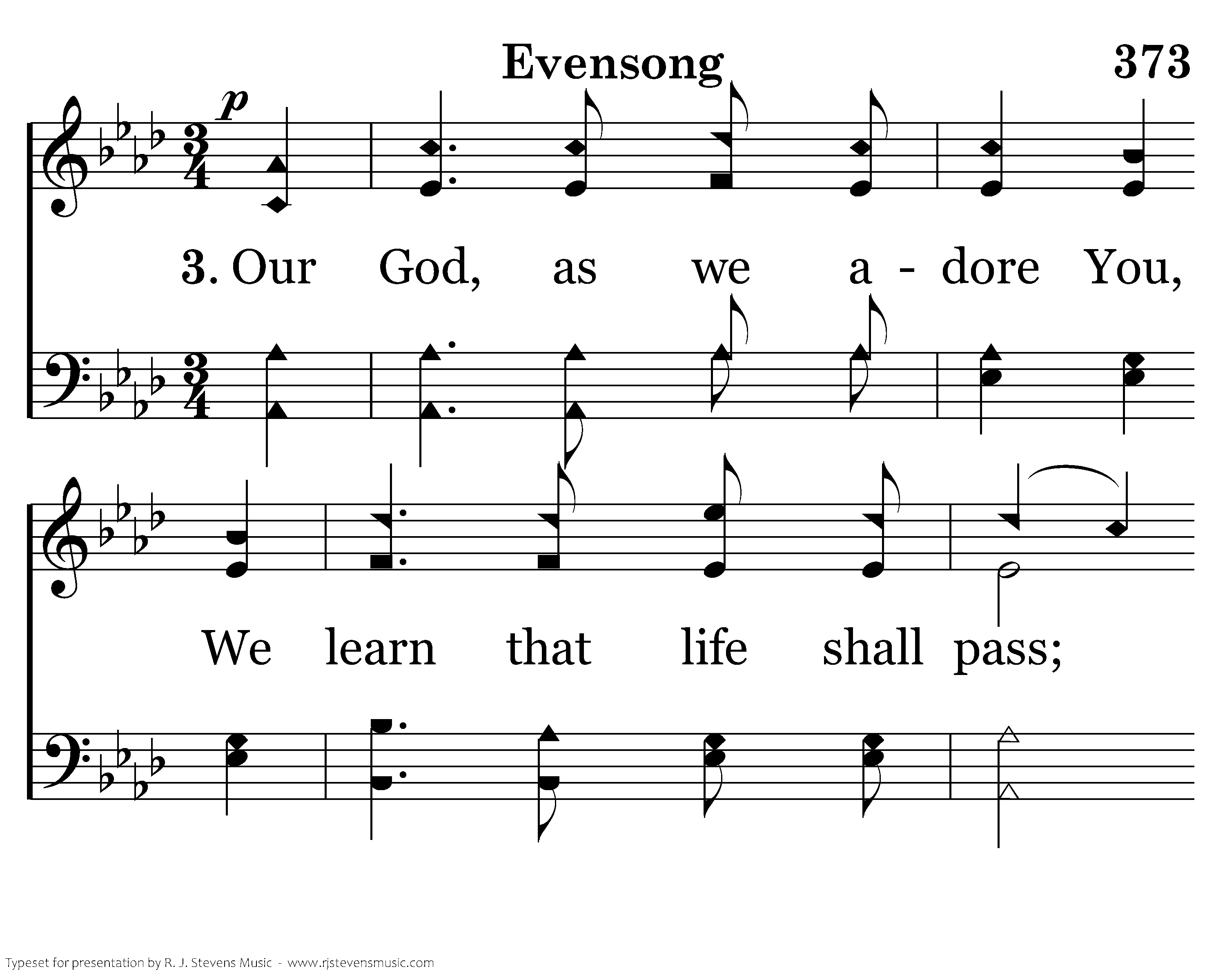 Our God, as we adore You, We learn that life shall pass; All flesh is dust before You, Its glory, like the grass. But You will not forsake us Nor leave Your word undone; From darkness You will wake us To glory like the sun.