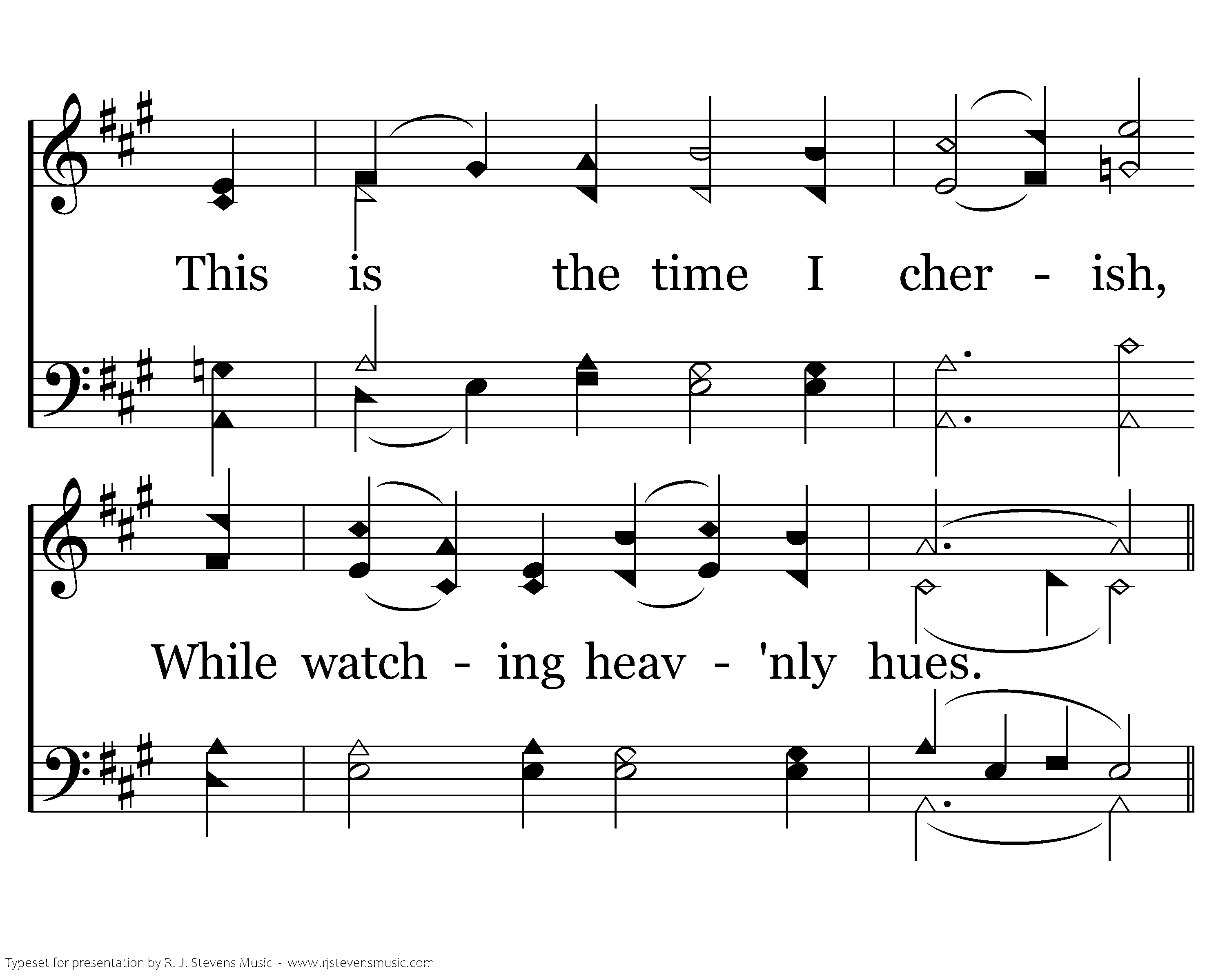 O, peaceful quiet of dawn, O gentle pinks and blues. This is the time I cherish, While watching heav'nly hues.