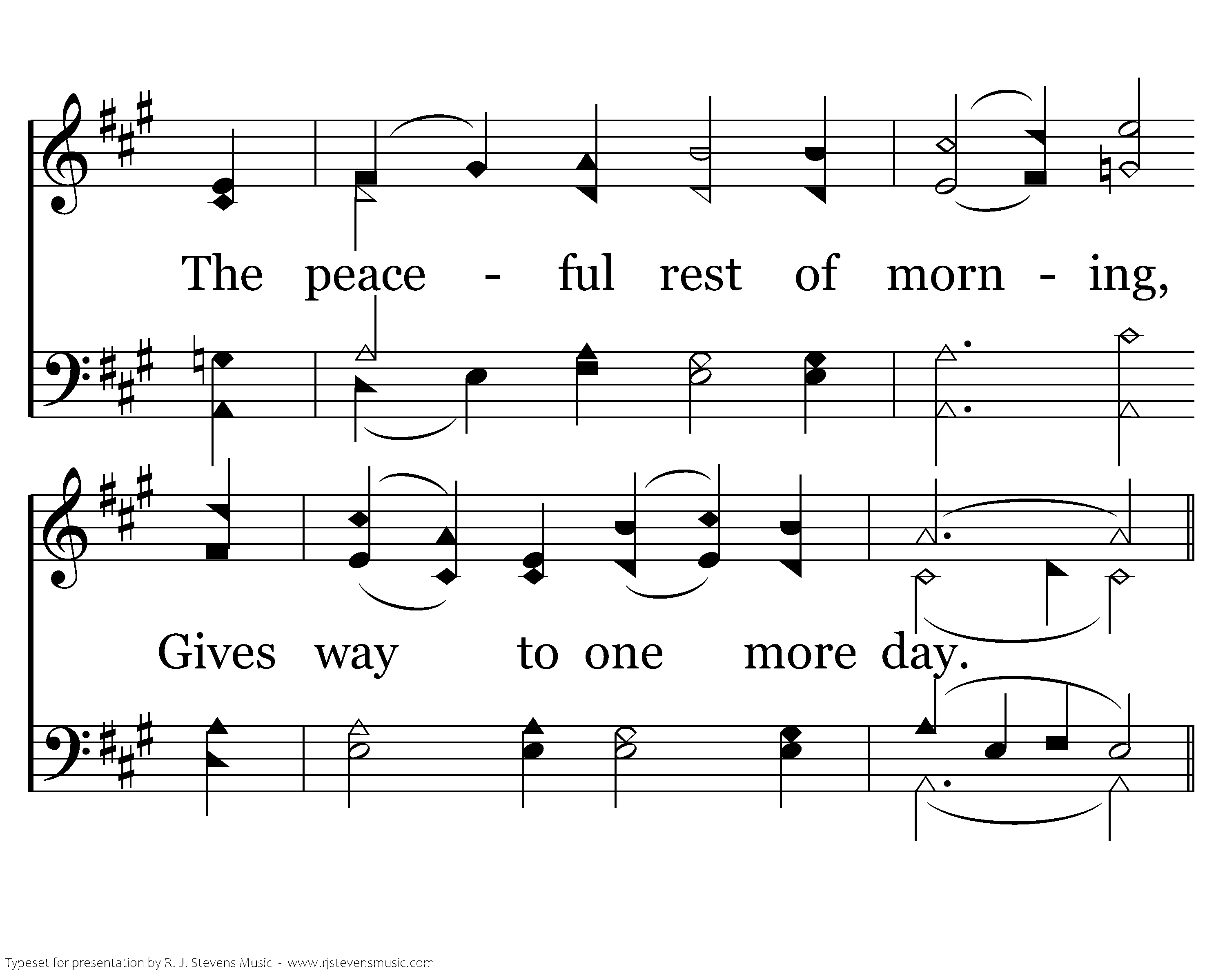 The birds' soft songs of morn, The moments passing by; The peaceful rest of morning, Gives way to one more day.