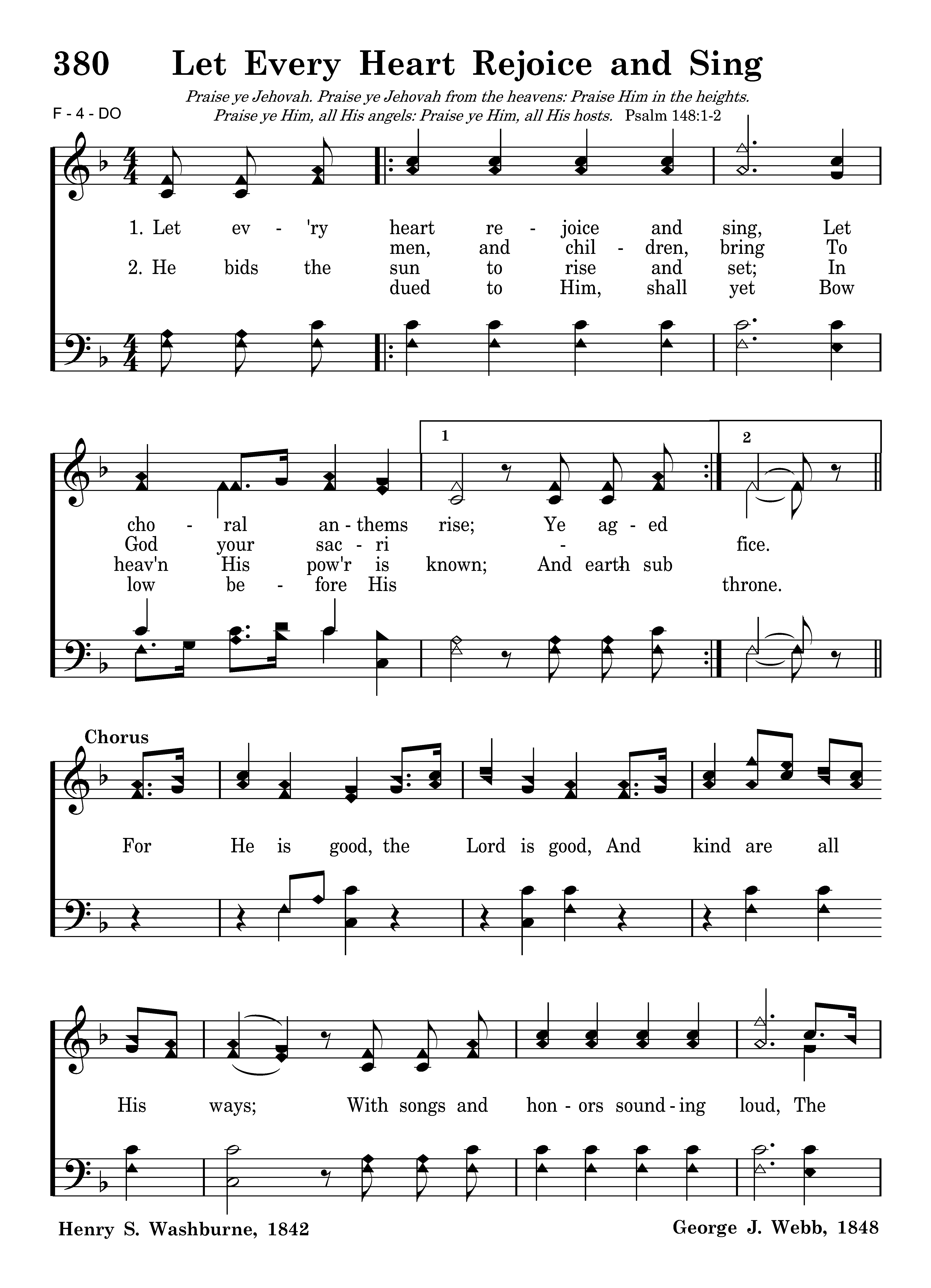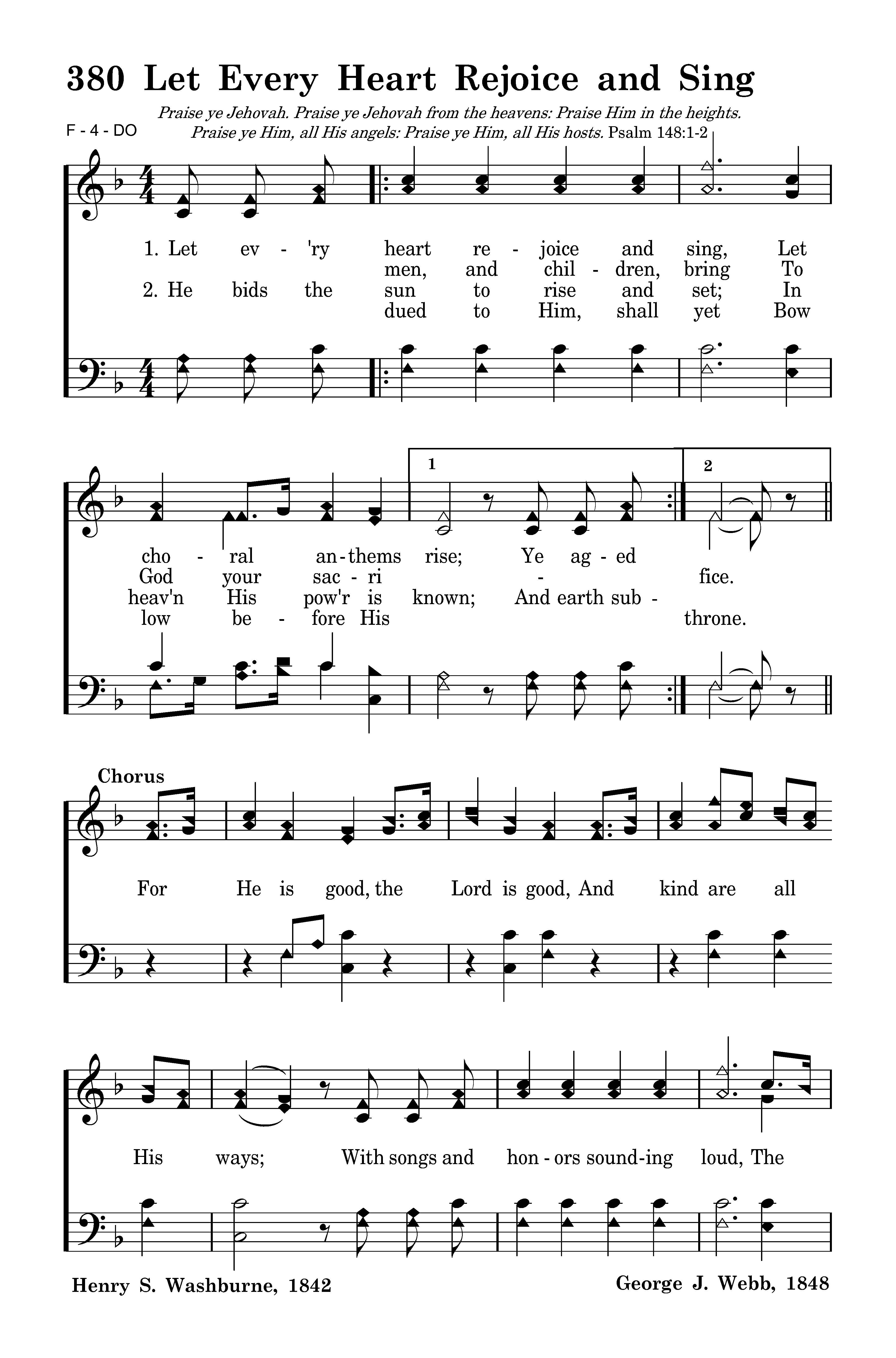 Let ev'ry heart rejoice and sing, Let choral anthems rise; Ye aged men, and children, bring To God your sacrifice.
