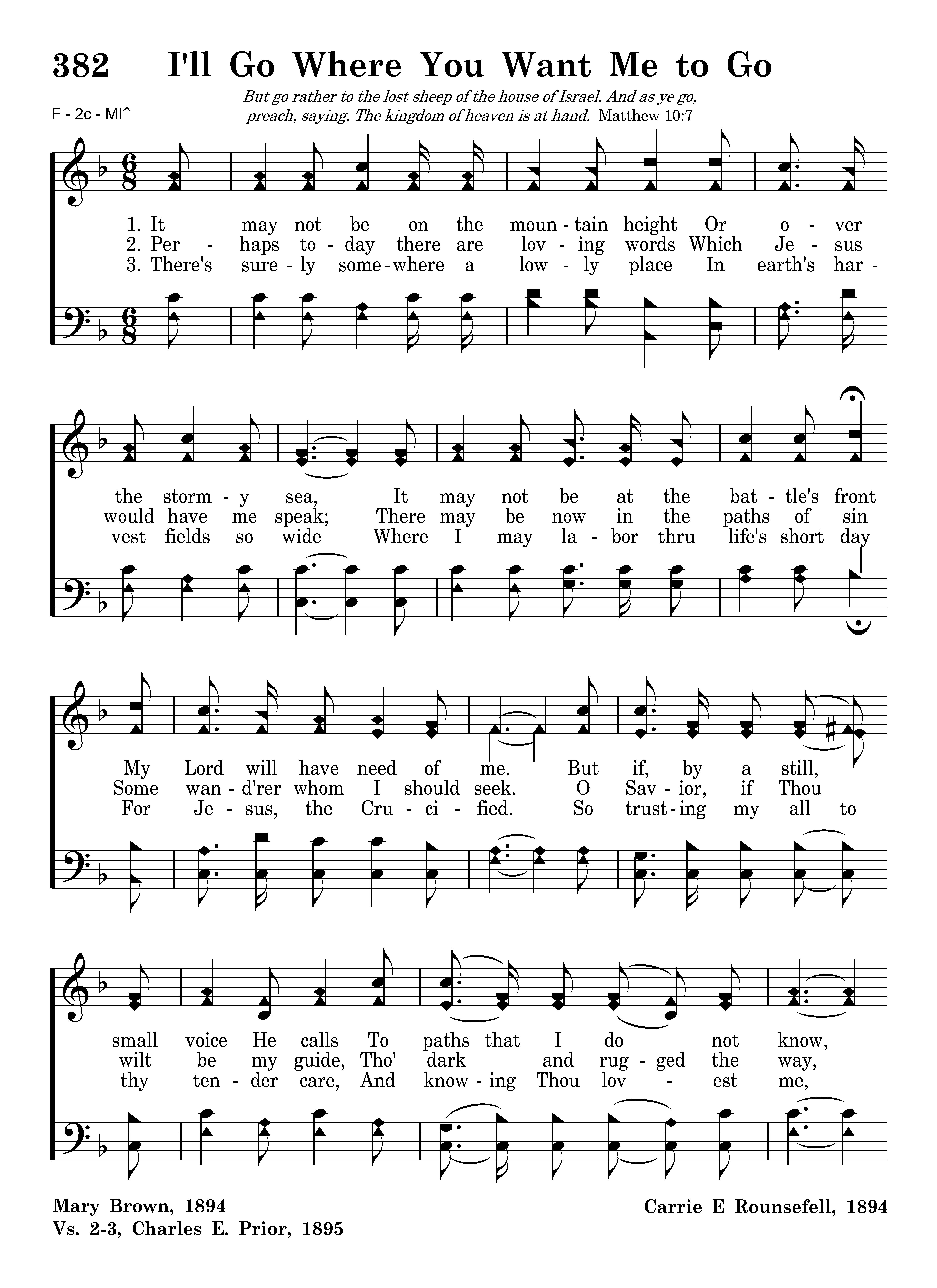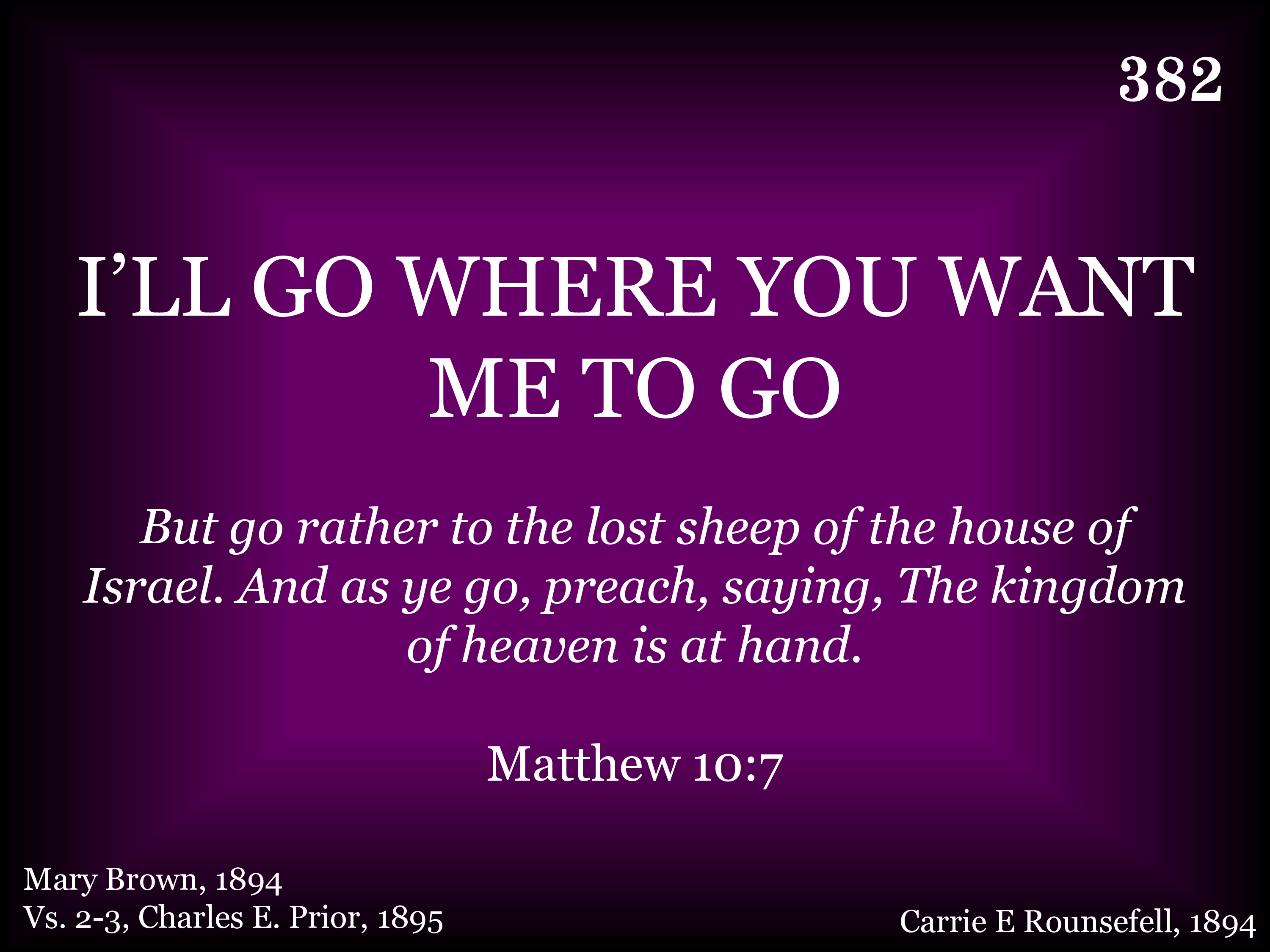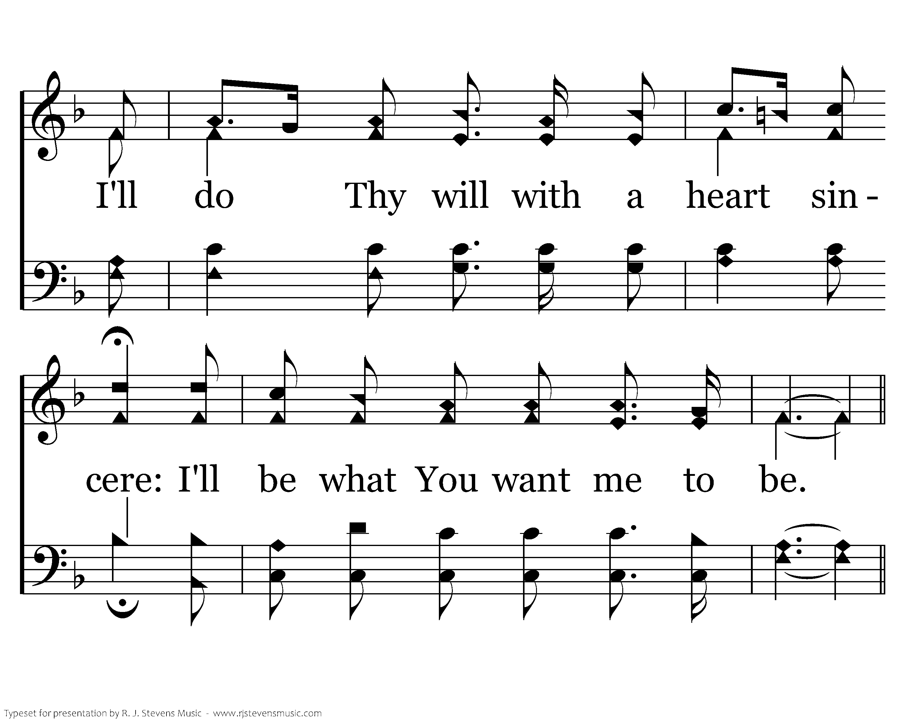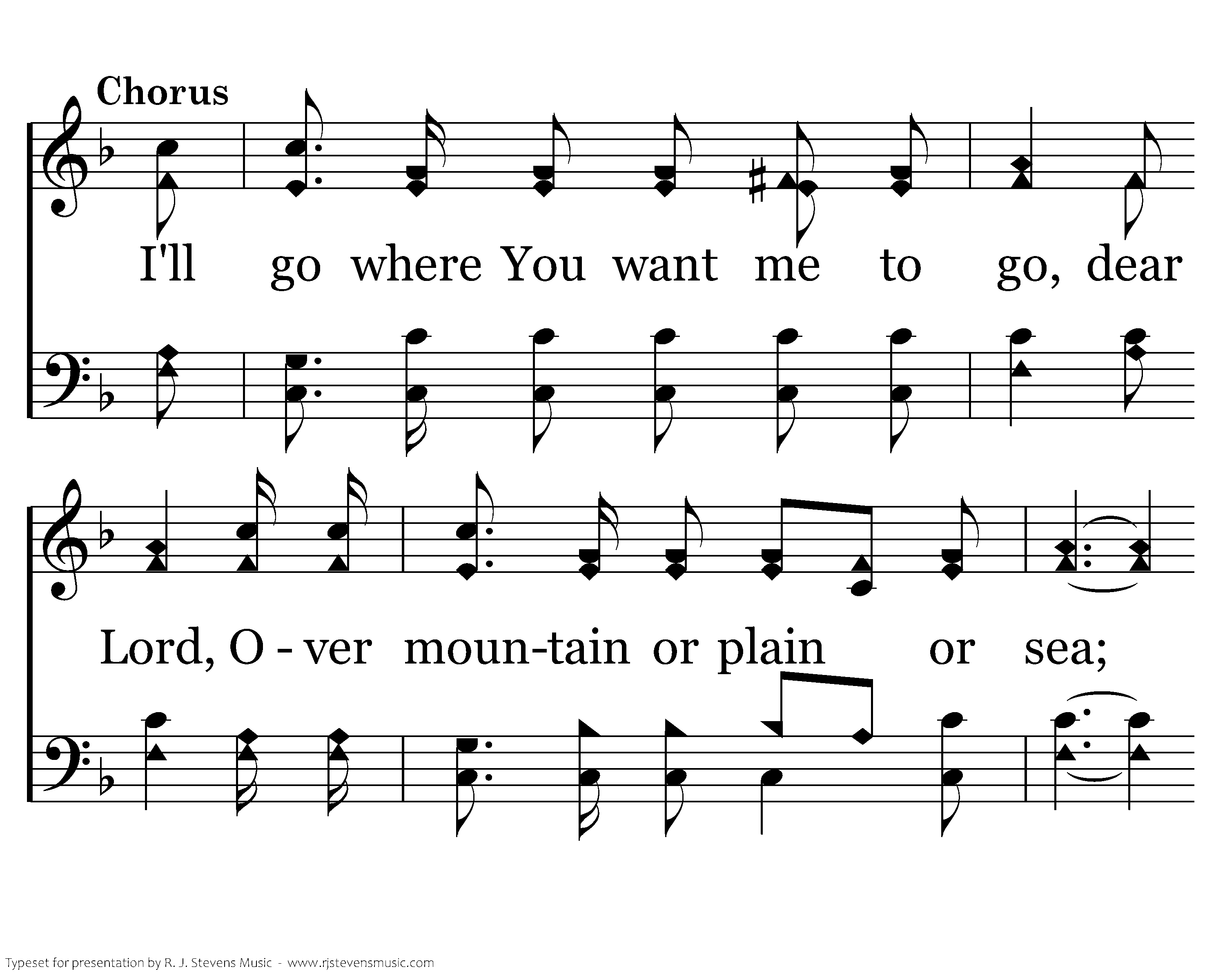 It may not be on the mountain height Or over the stormy sea It may not be at the battle's front My Lord will have need of me. But if, by a still, small voice He calls To paths that I do not know, I'll answer, dear Lord, with my hand in thine: I'll go where You want me to go.