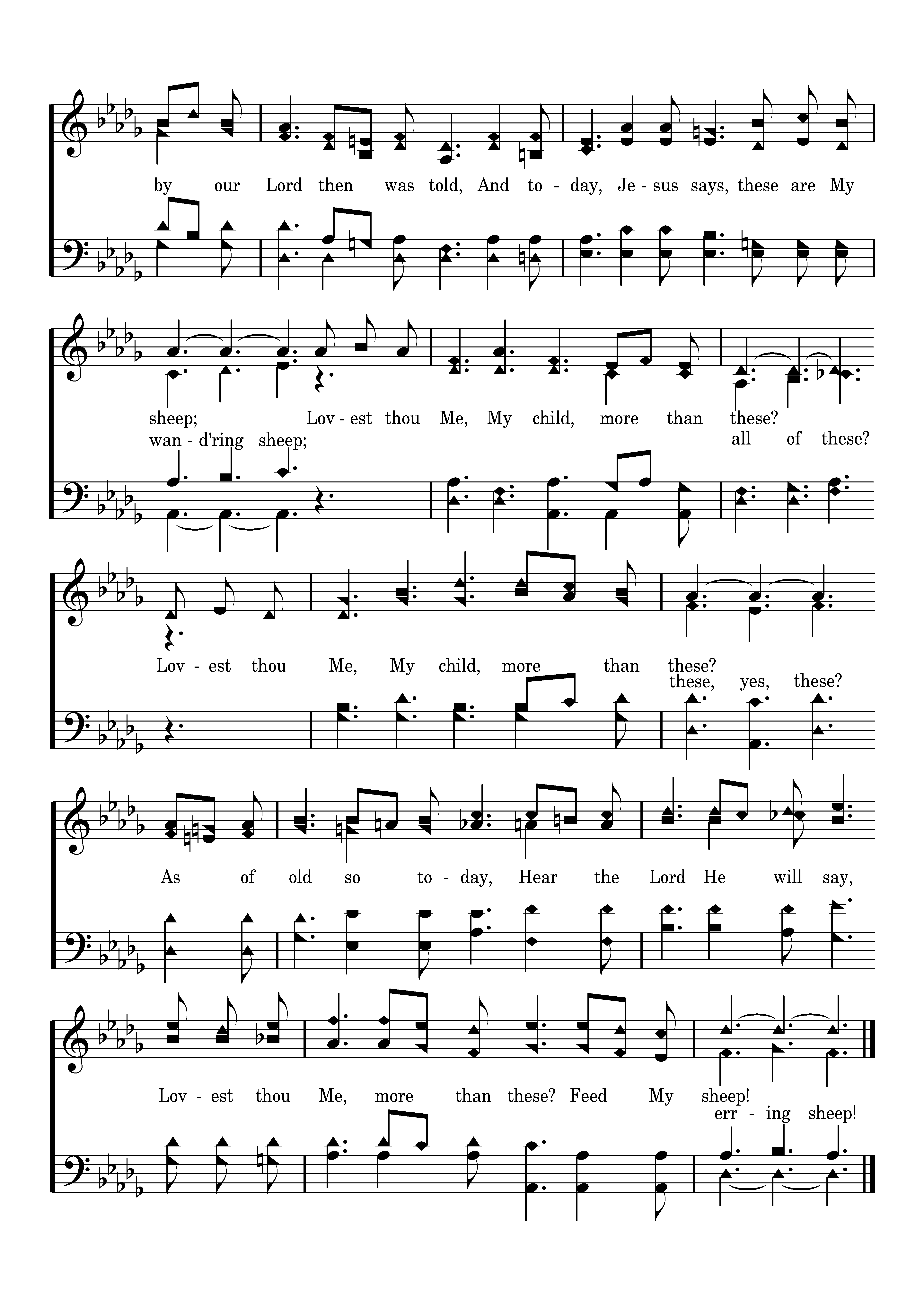 Lovest thou Me, My child, more than these? Lovest thou Me, My child more than these? These are the words Peter of old by our Lord then was told, And today, Jesus says, these are My sheep; Lovest thou Me, My child, more than these? Lovest thou Me, My child, more than these? As of old so today, Hear the Lord He will say, Lovest thou Me, more than these? Feed My sheep!