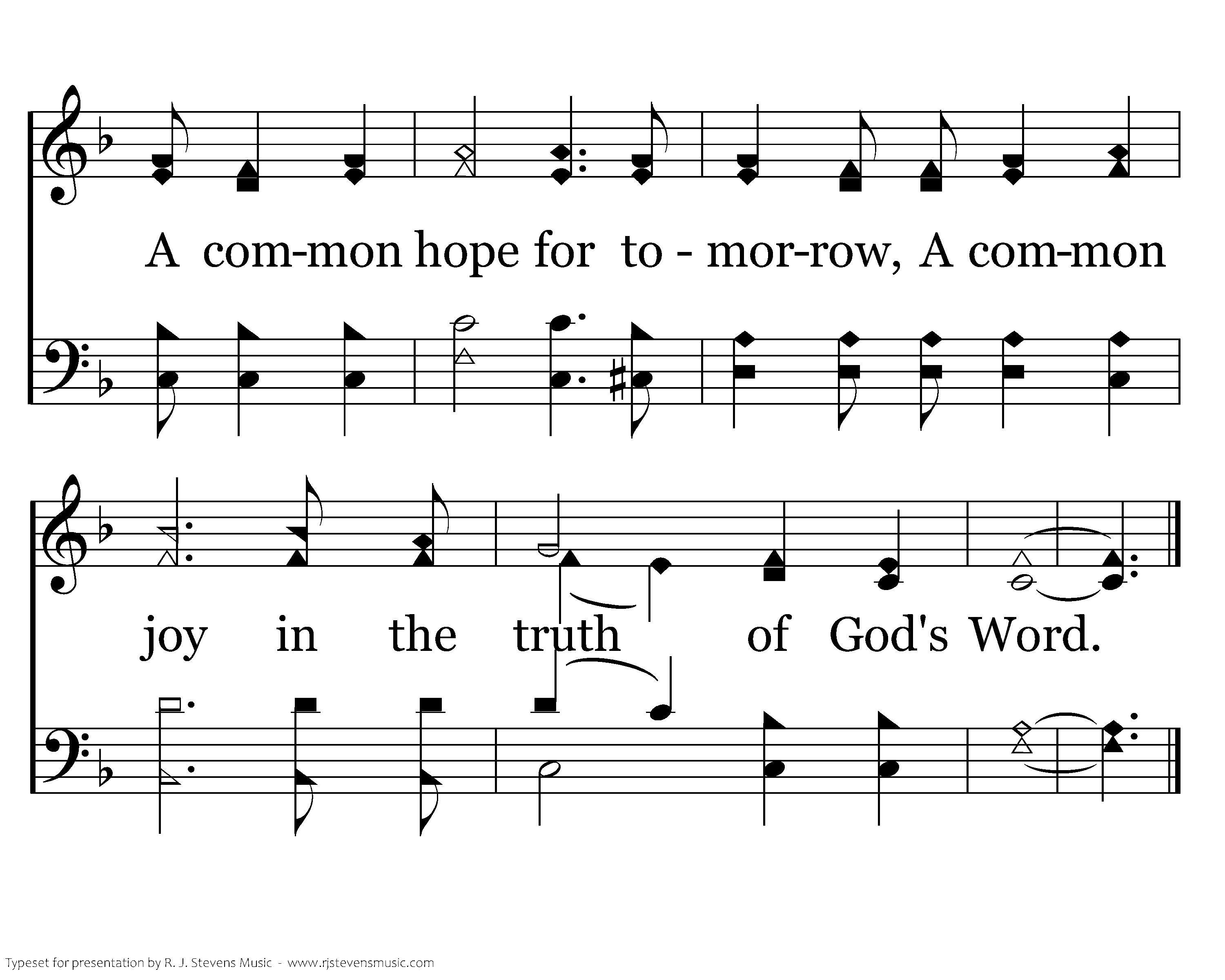 A common love for each other, A common gift to the Savior, A common bond holding us to the Lord; A common strength when we're weary, A common hope for tomorrow, A common joy in the truth of God's Word.