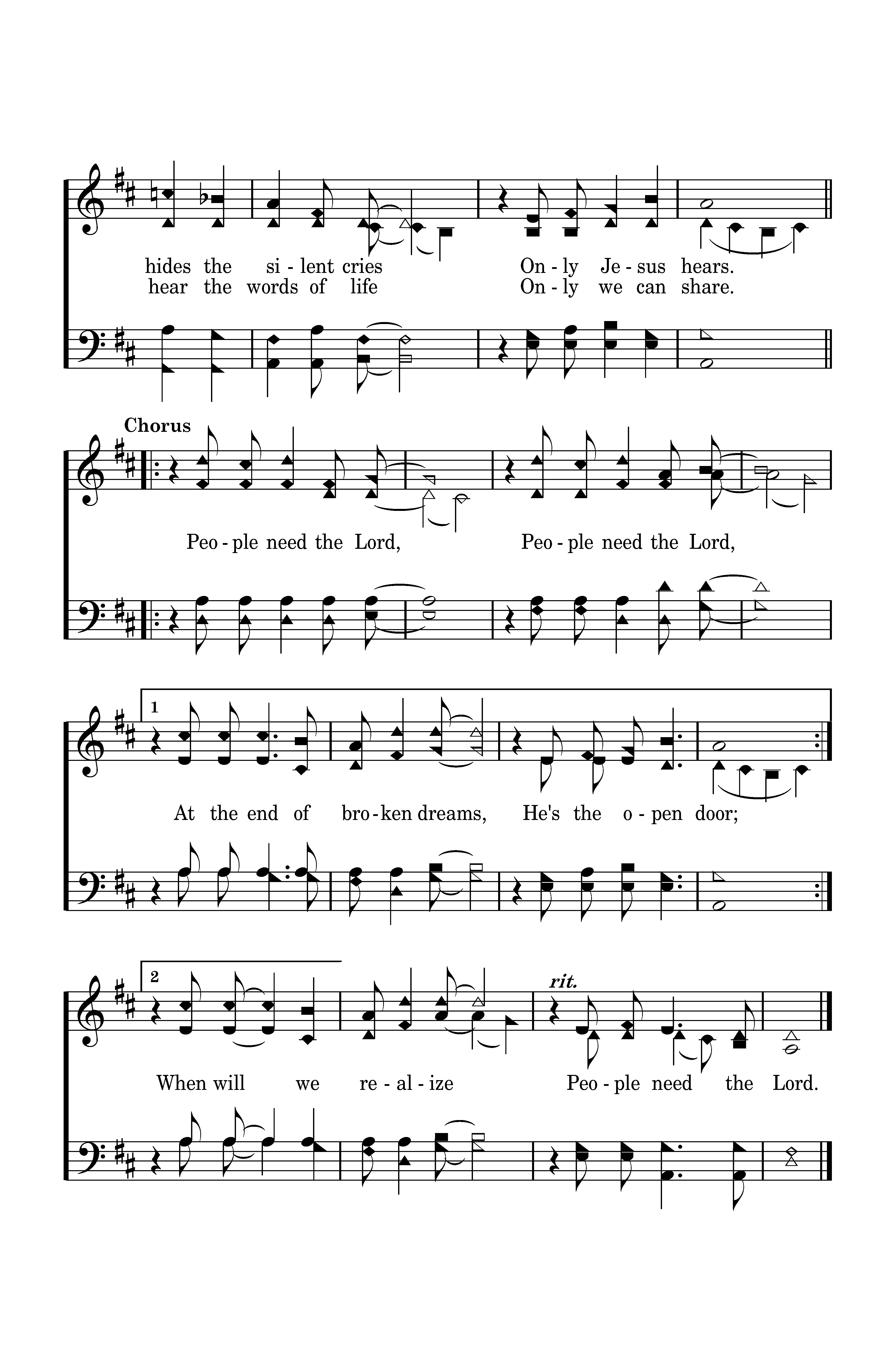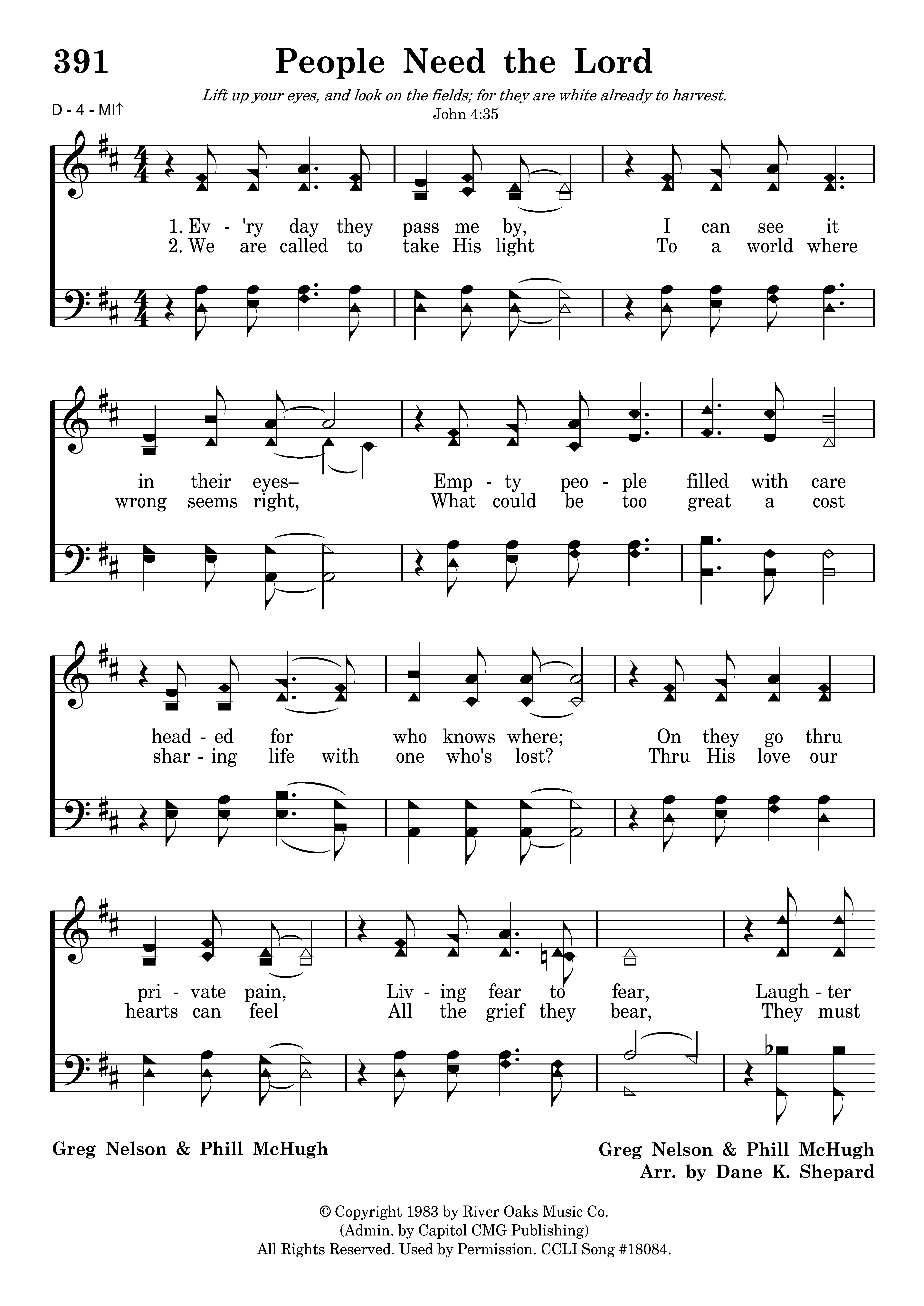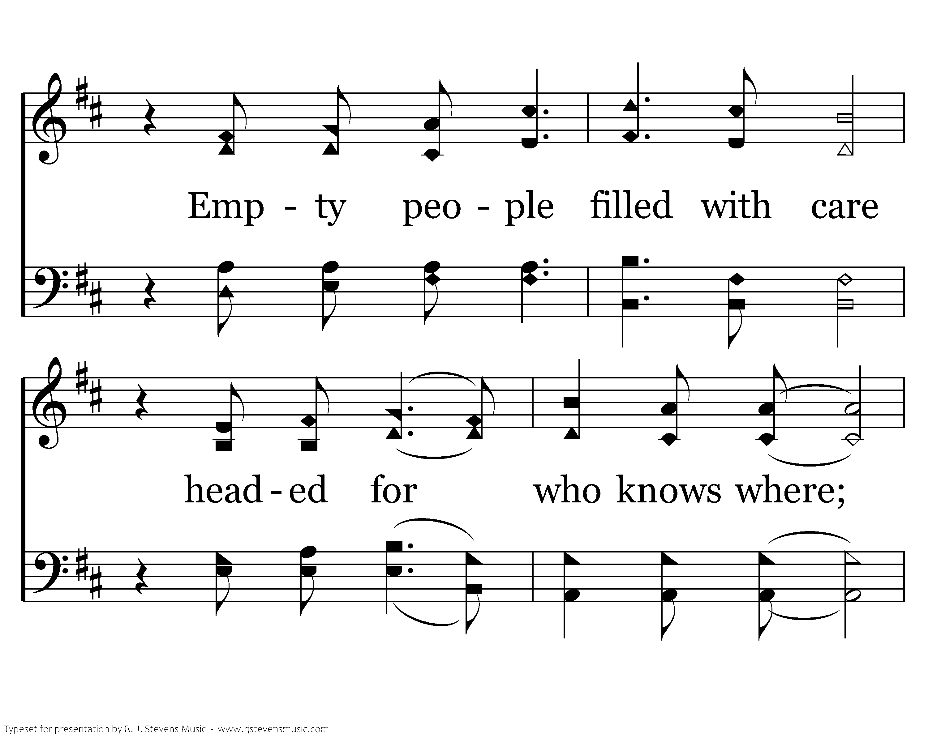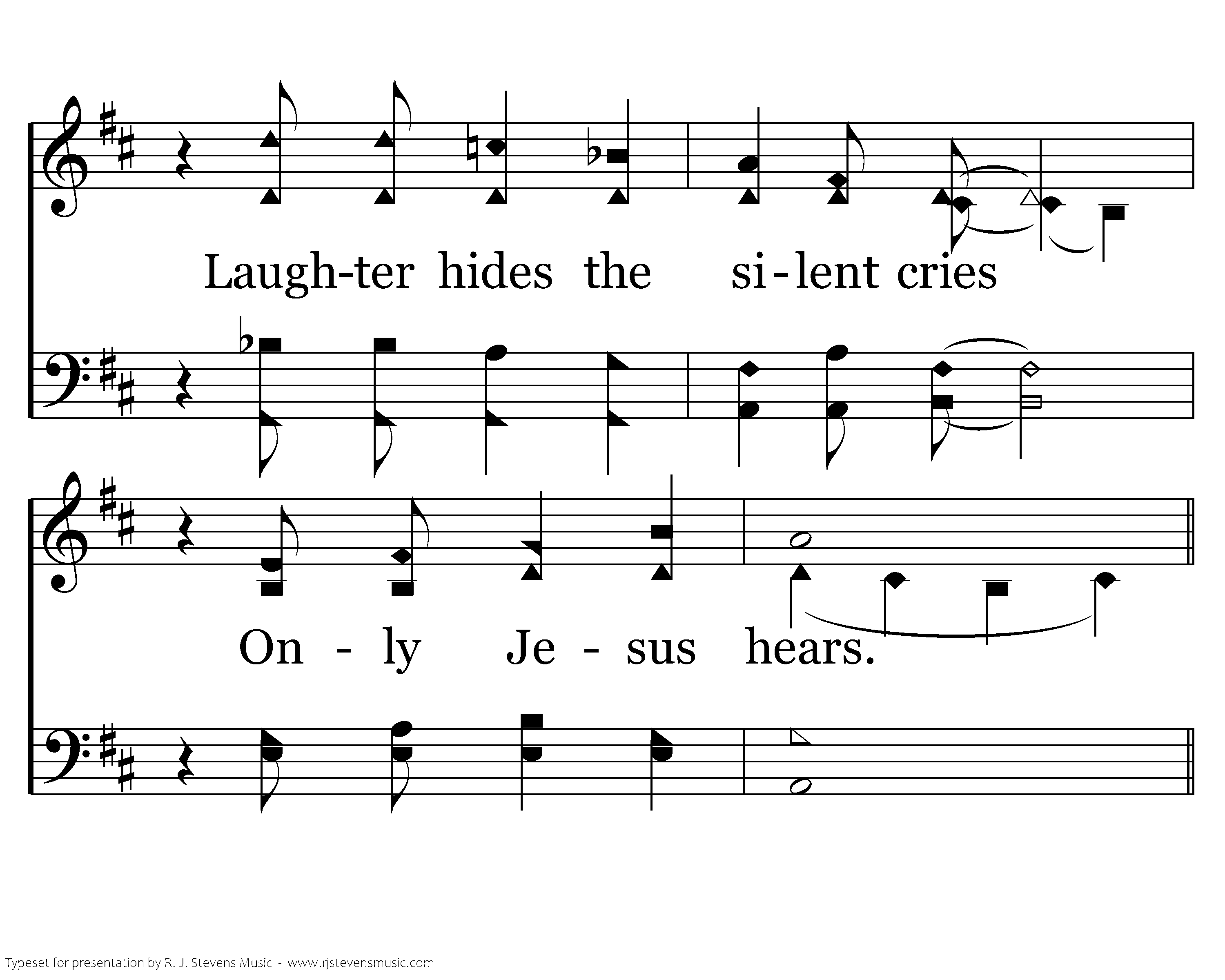 Ev'ry day they pass me by, I can see it in their eyes Empty people filled with care headed for who knows where; On they go thru private pain, Living fear to fear, Laughter hides the silent cries Only Jesus hears.