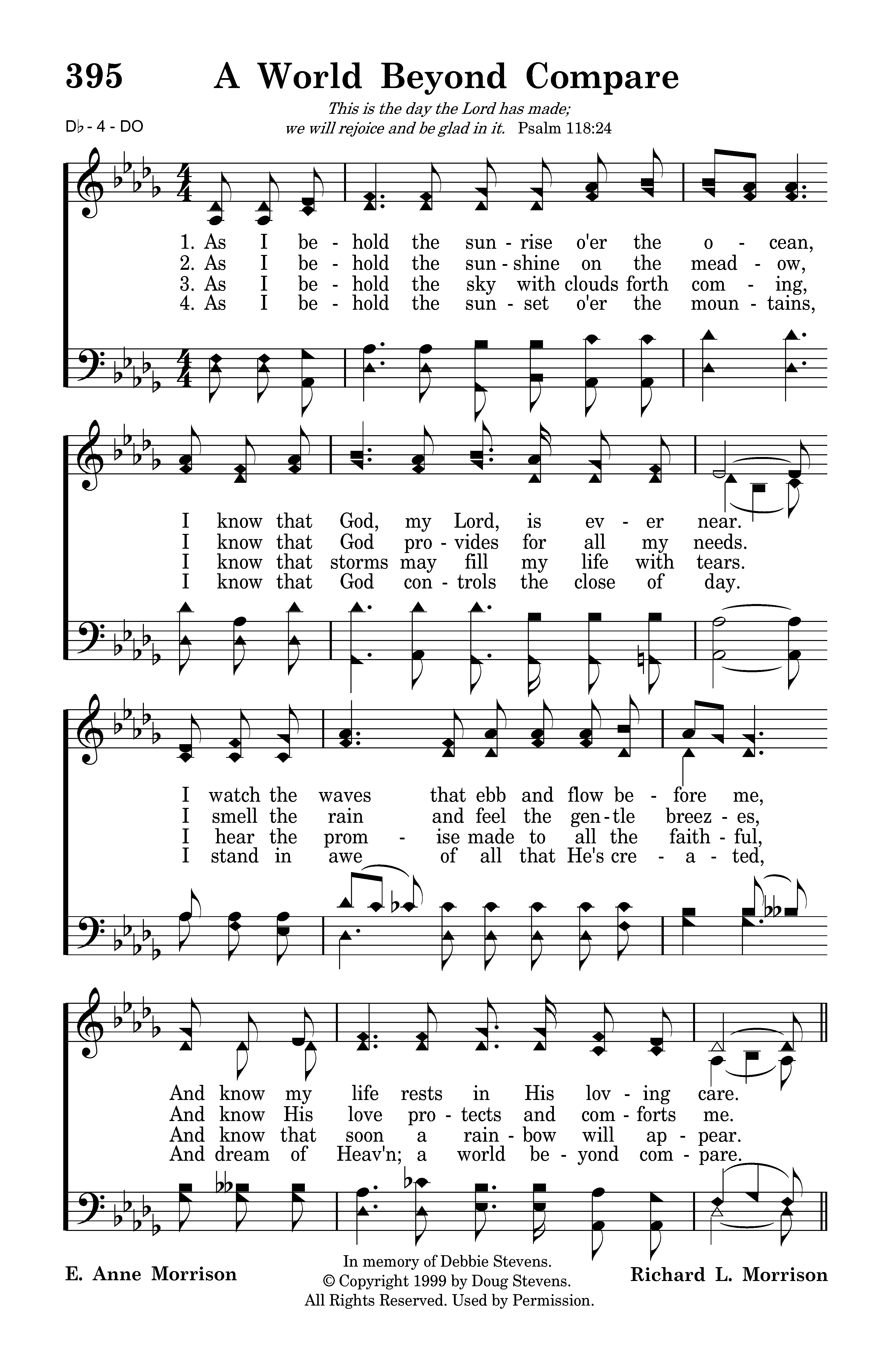 As I behold the sunshine on the meadow, I know that God provides for all my needs. I smell the rain and feel the gentle breezes, And know His love protects and comforts me.