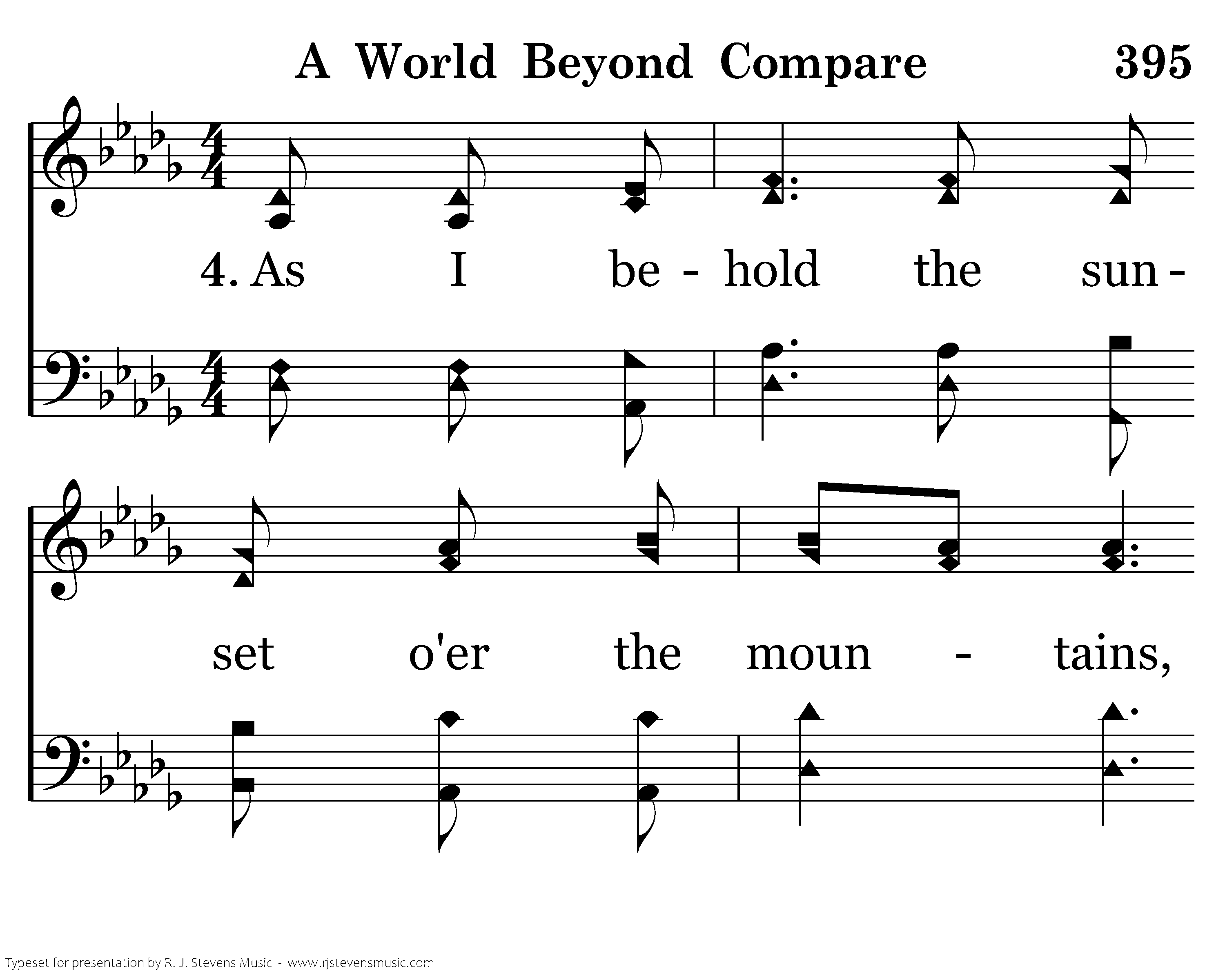 As I behold the sunset o'er the mountains, I know that God controls the close of day. I stand in awe of all that He's created, And dream of Heav'n; a world beyond compare.
