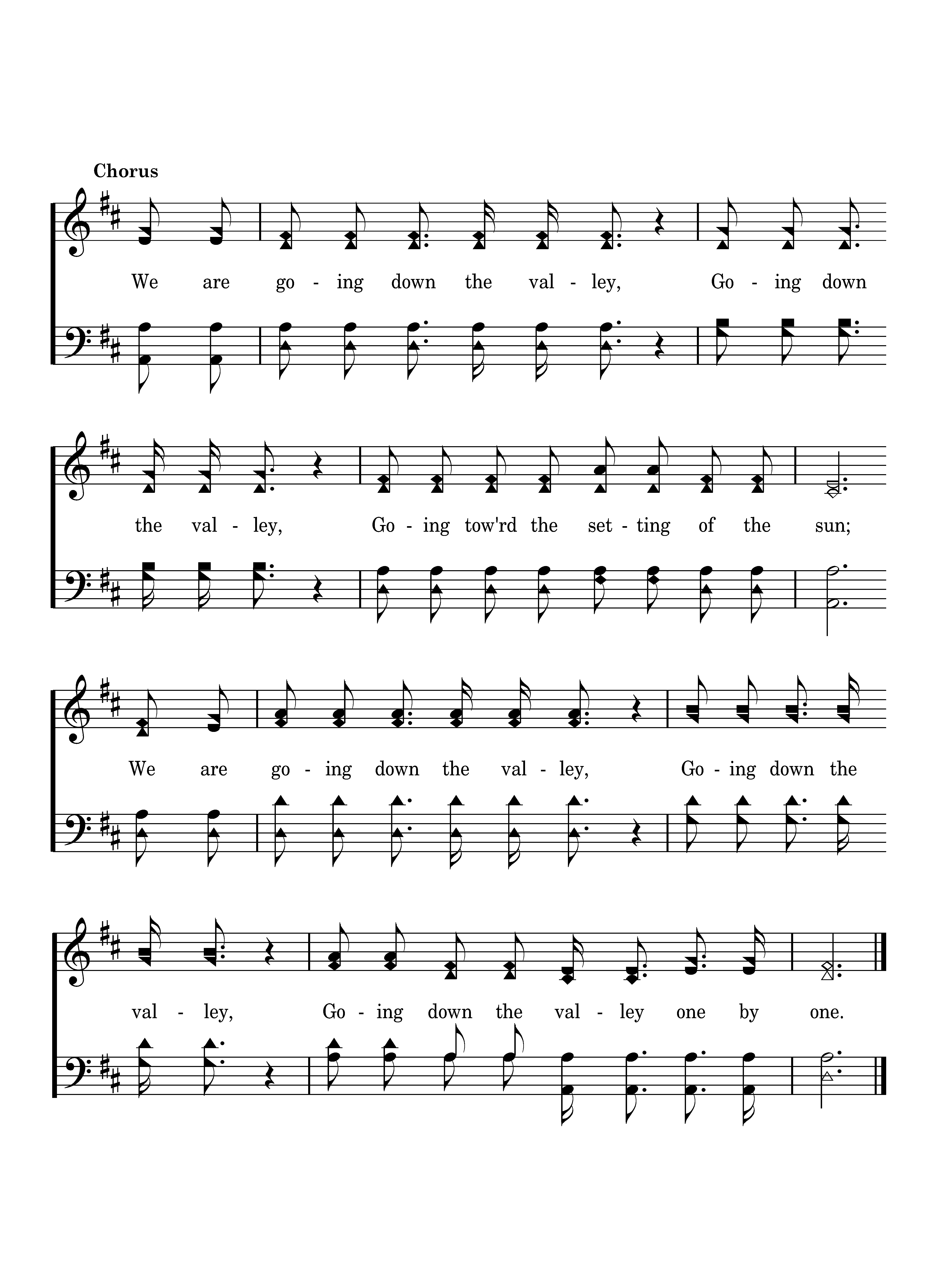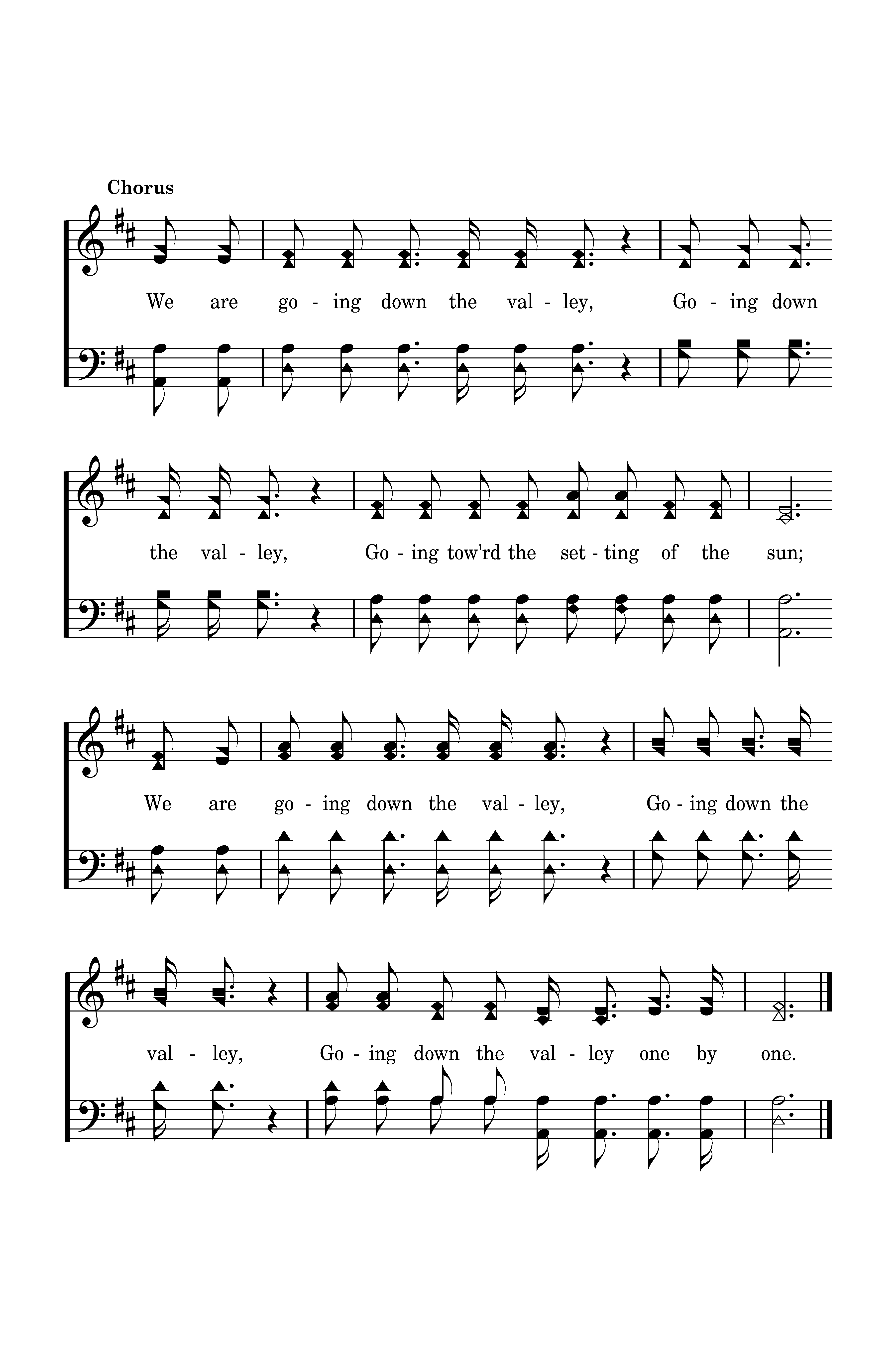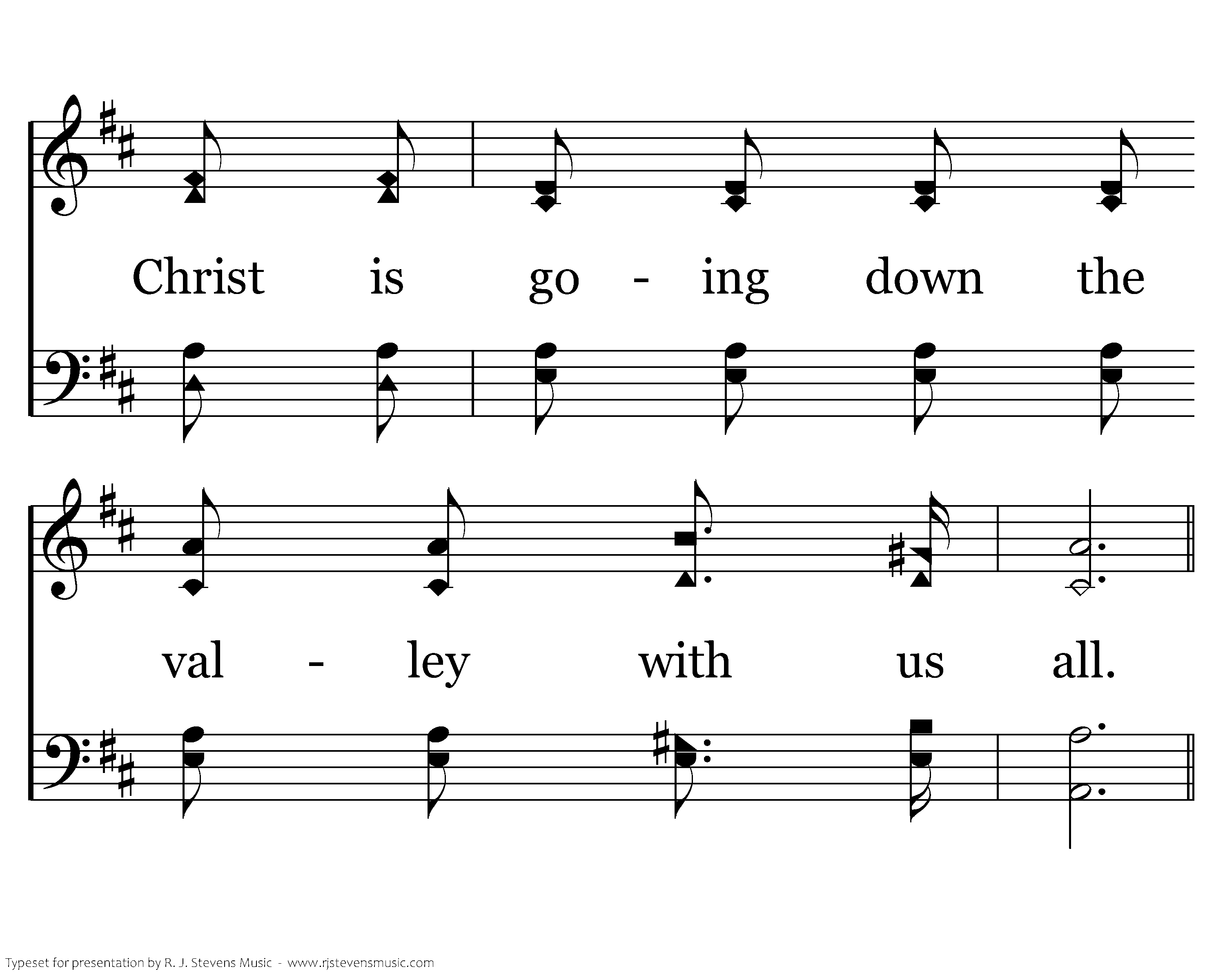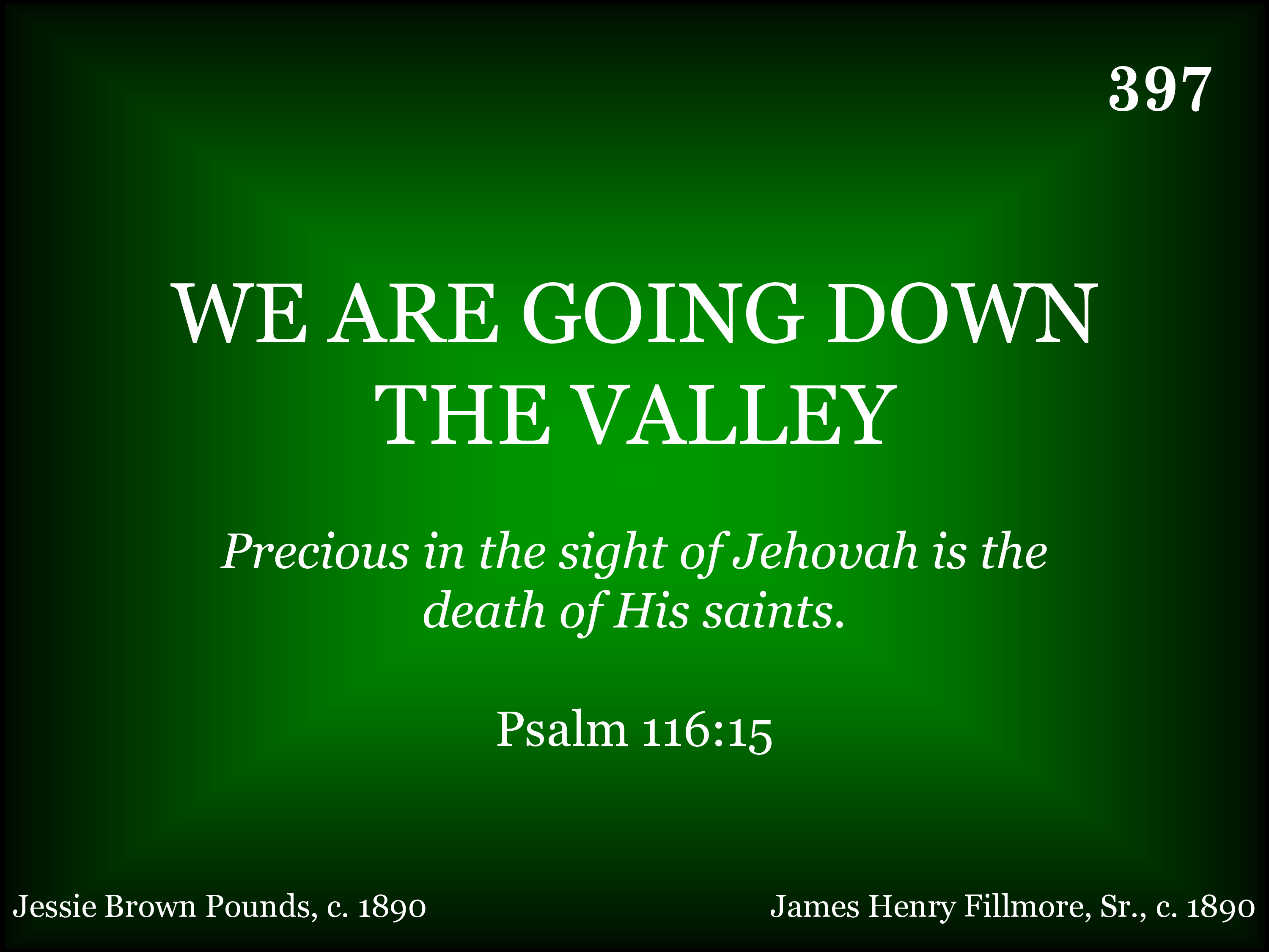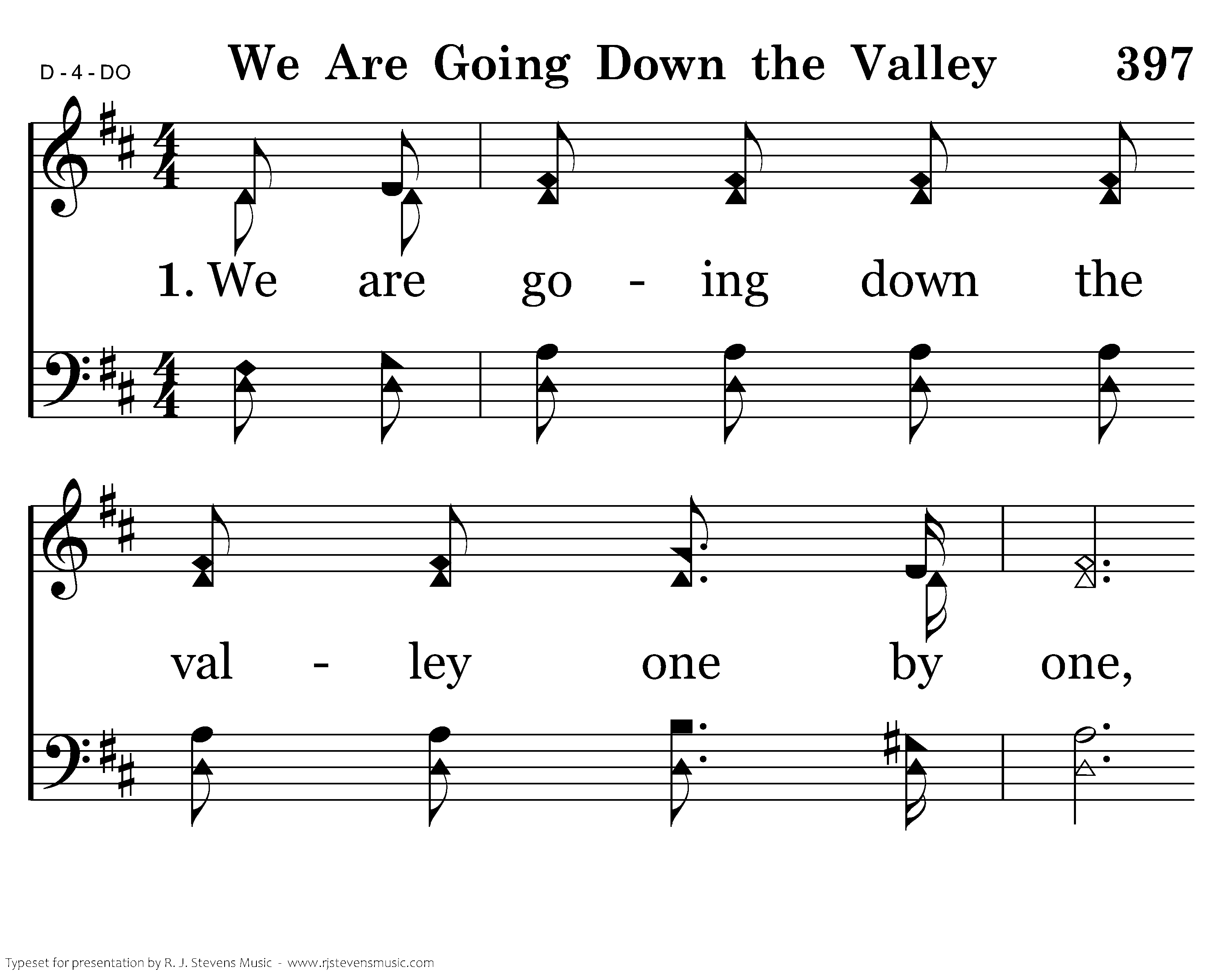 We are going down the valley, Going down the valley, Going tow'rd the setting of the sun; We are going down the valley, Going down the valley, Going down the valley one by one.