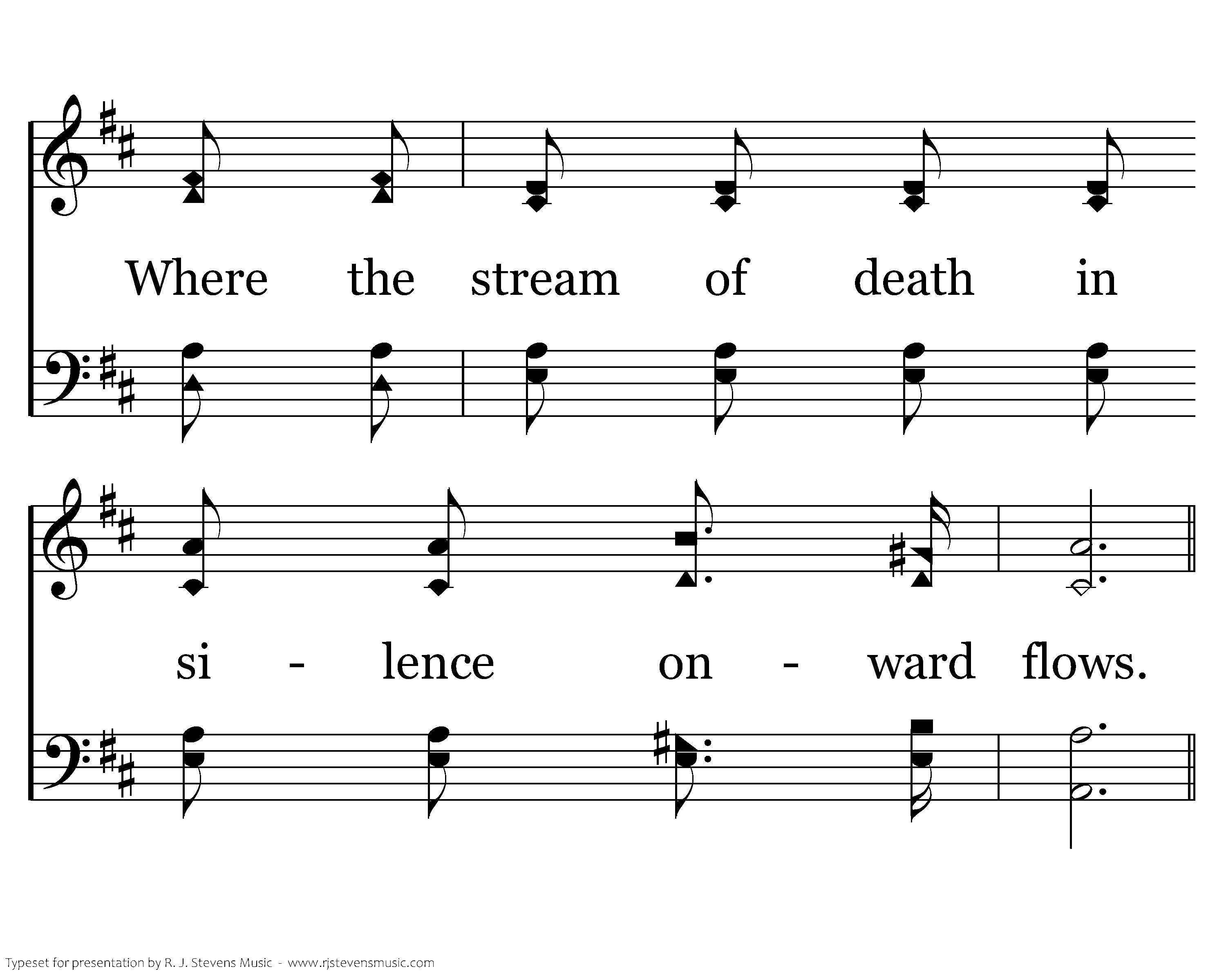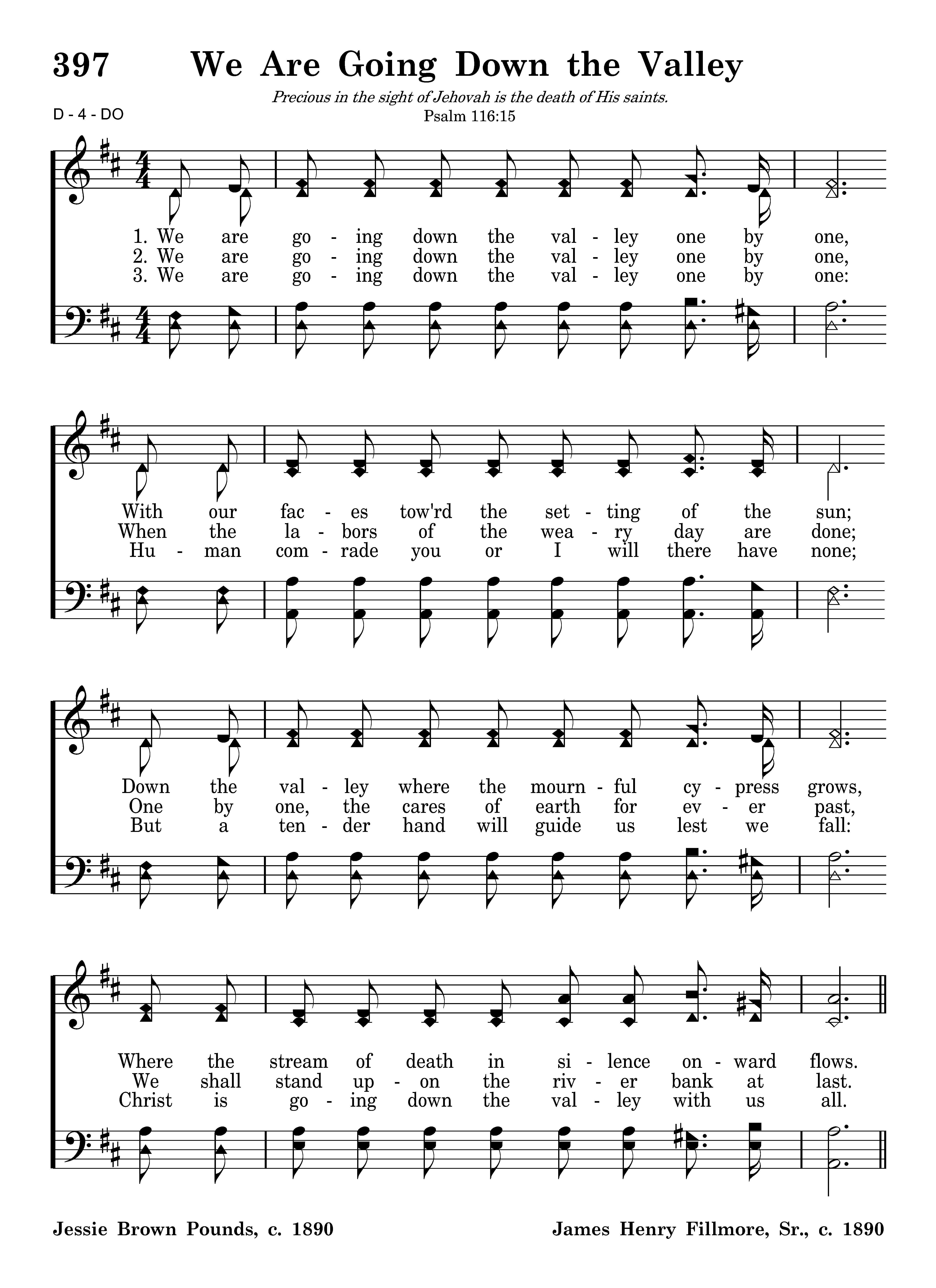 We are going down the valley one by one, With our faces tow'rd the setting of the sun; Down the valley where the mournful cypress grows, Where the stream of death in silence onward flows.
