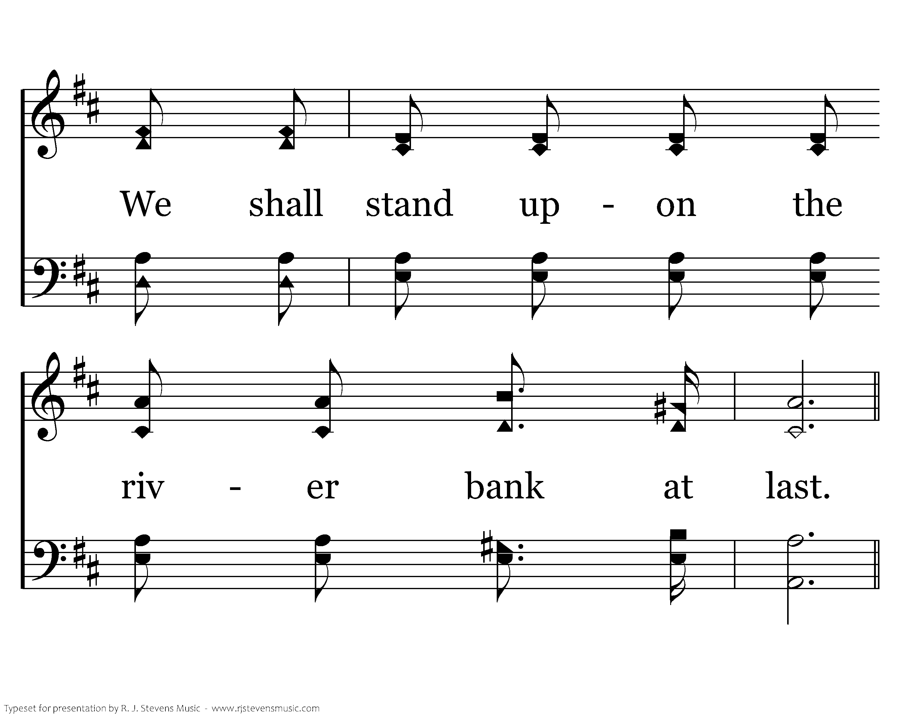 We are going down the valley one by one, When the labors of the weary day are done; One by one, the cares of earth for ever past, We shall stand upon the river bank at last.