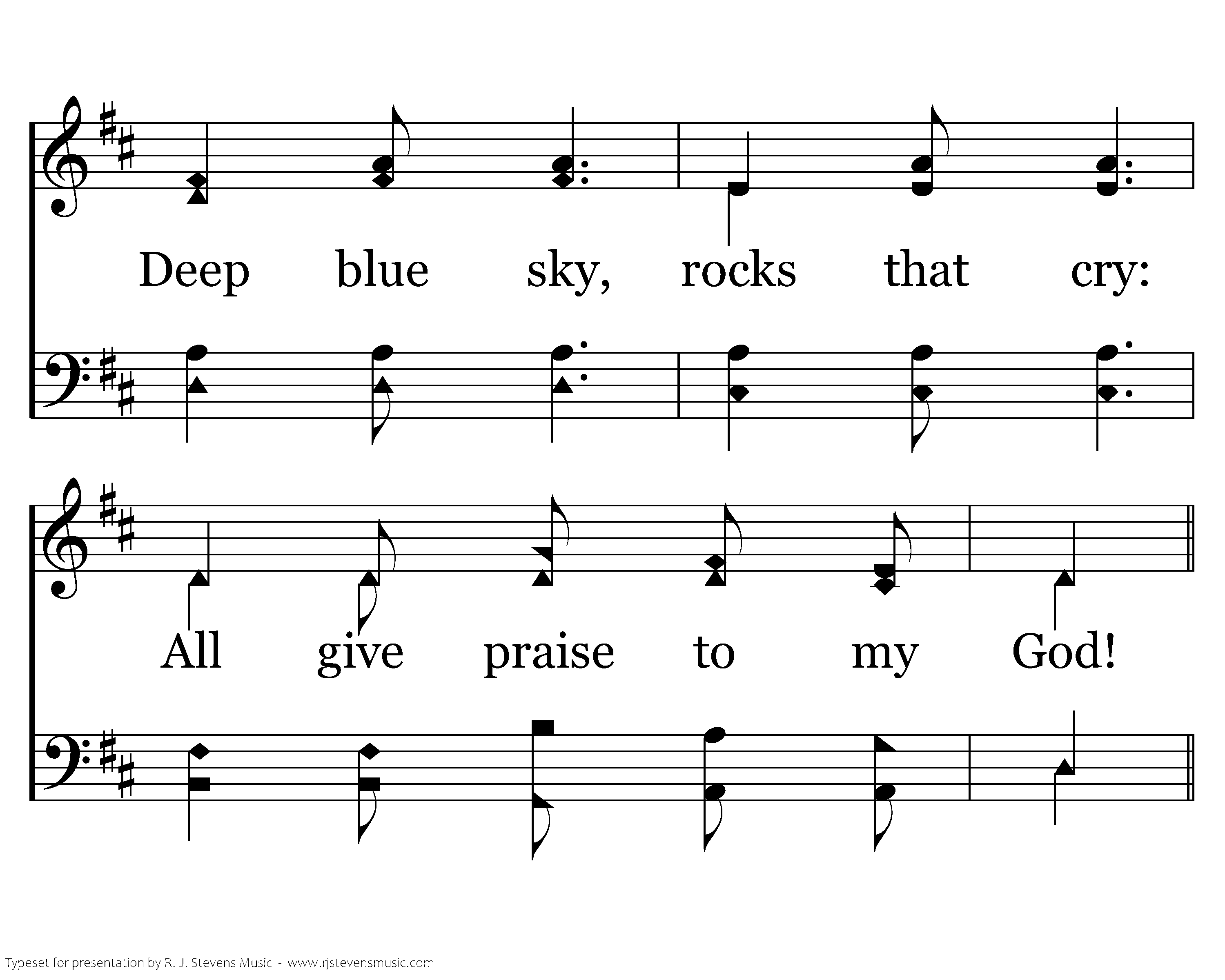 Evergreens, crystal streams, Peaks of Kilimanjaro, Deep blue sky, rocks that cry: All give praise to my God!