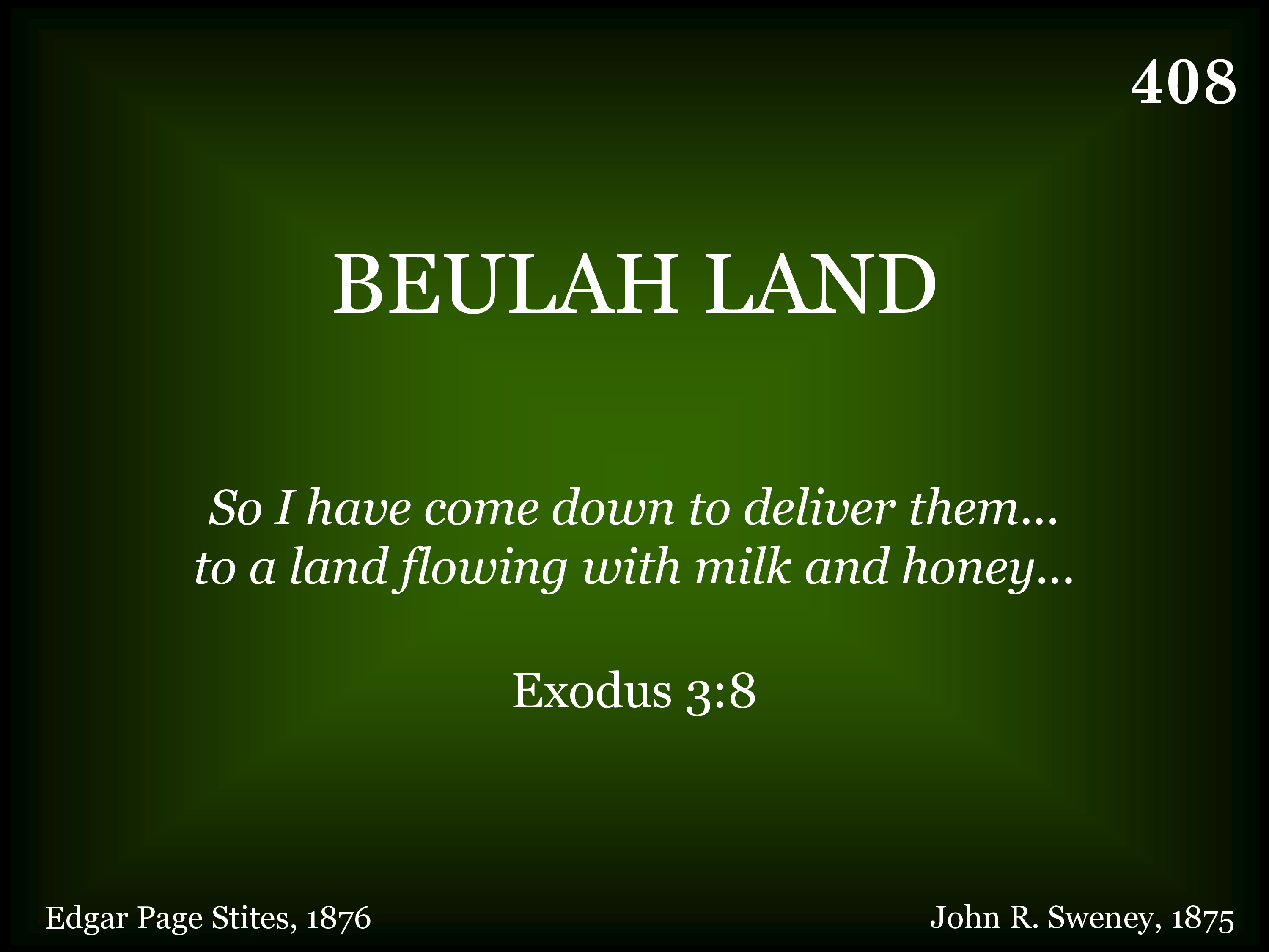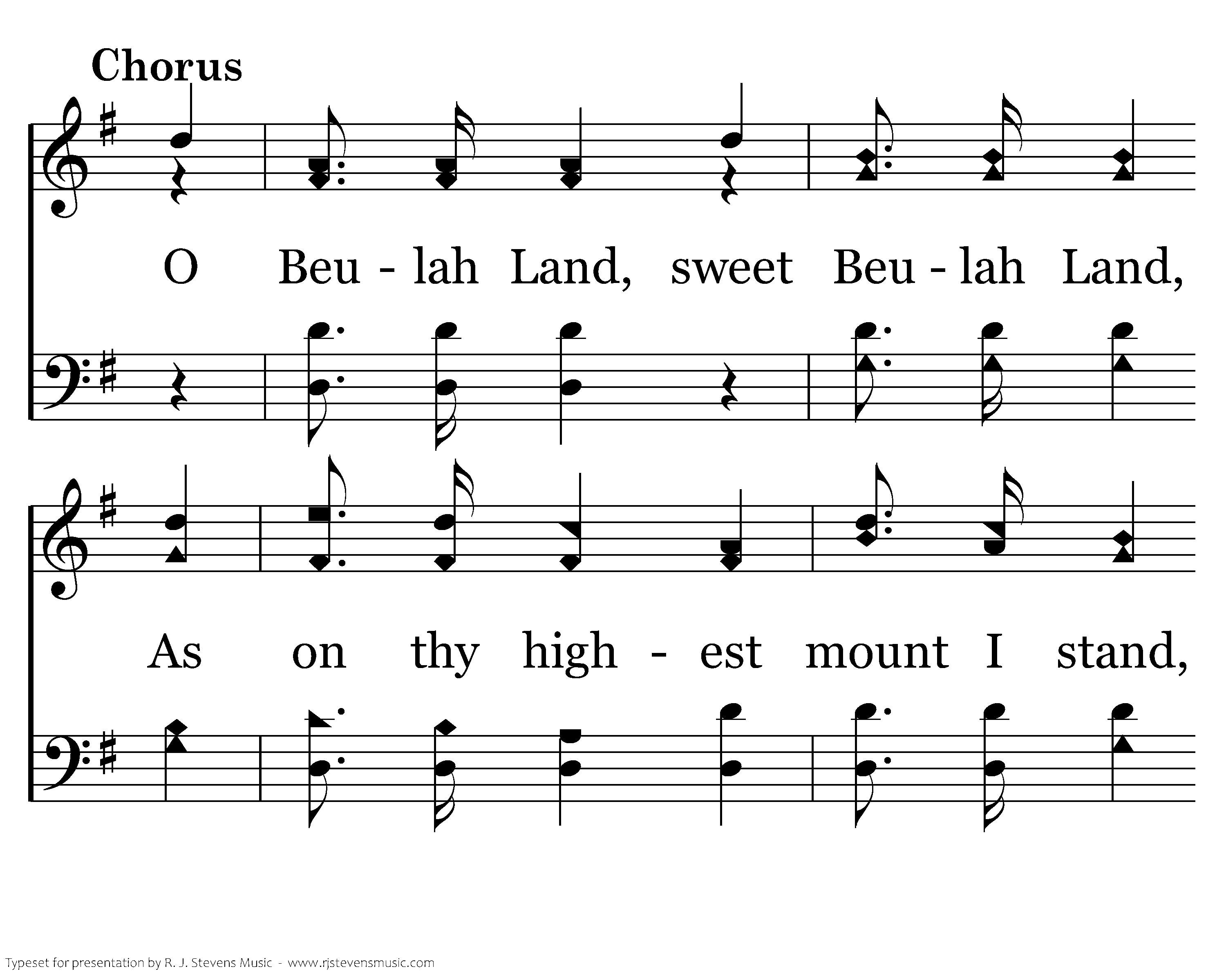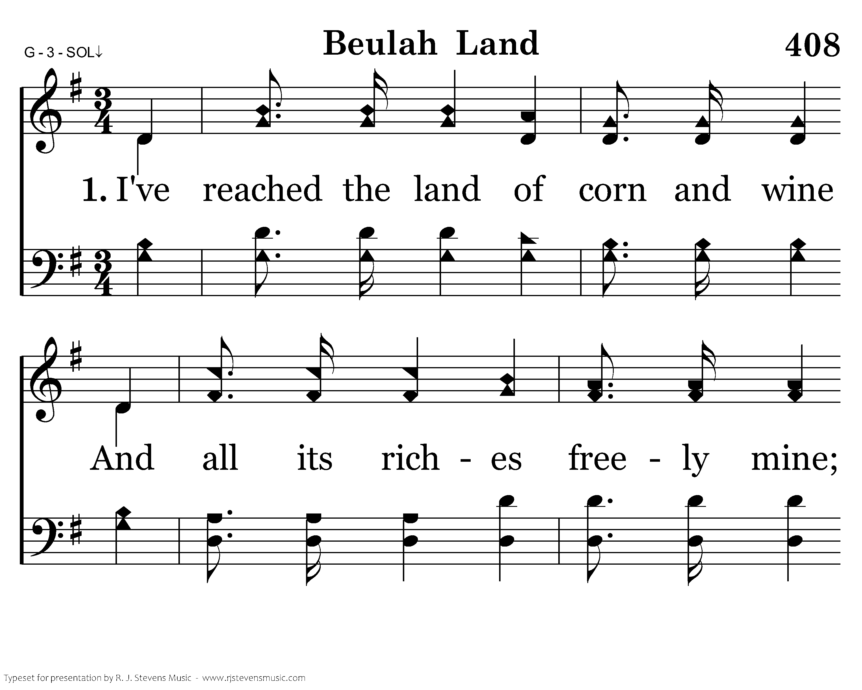 O Beulah Land, sweet Beulah Land, As on thy highest mount I stand, I look away across the sea, Where mansions are prepared for me, and view the shining gloryshore, My heav'n, my home for evermore!