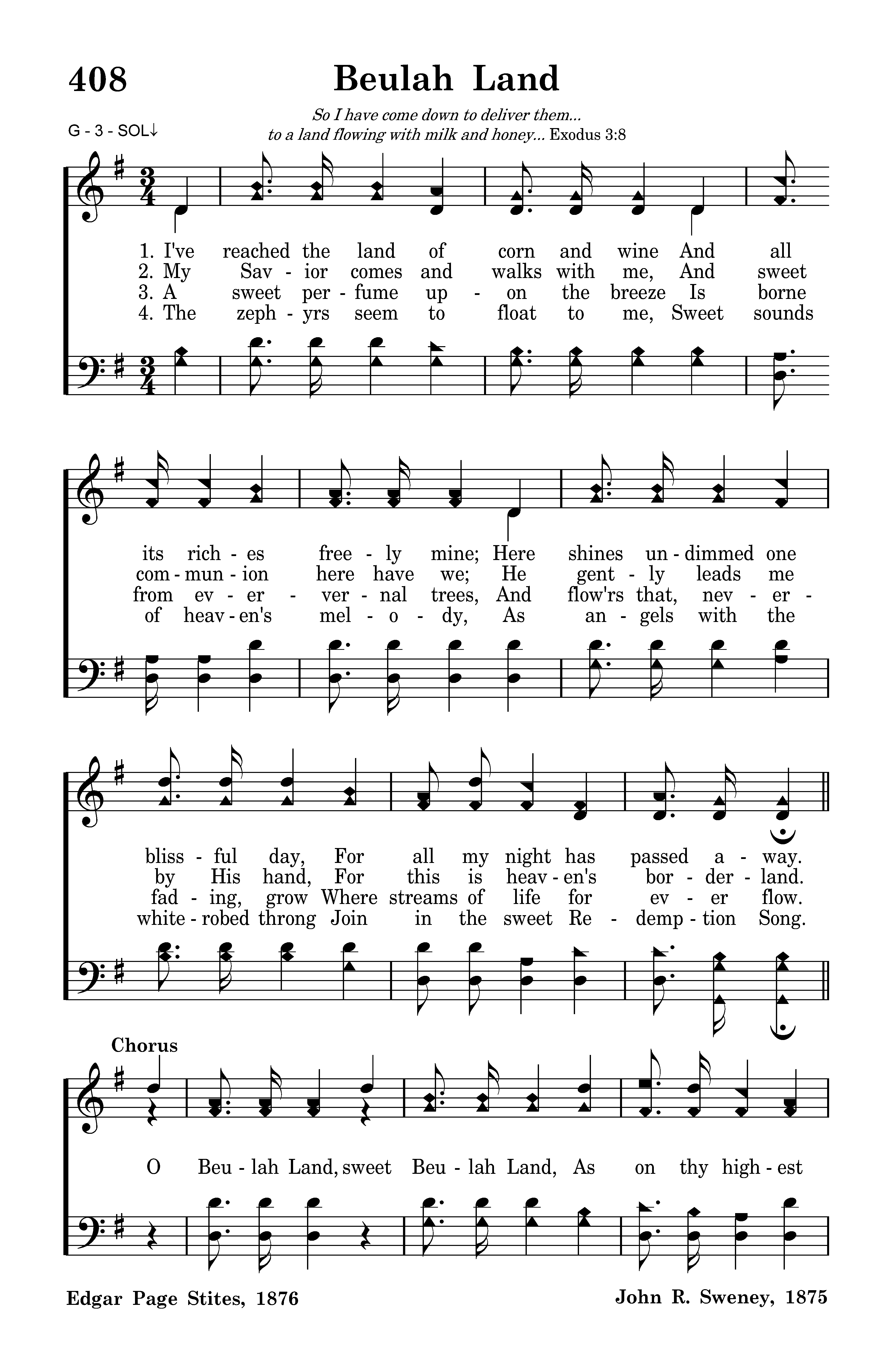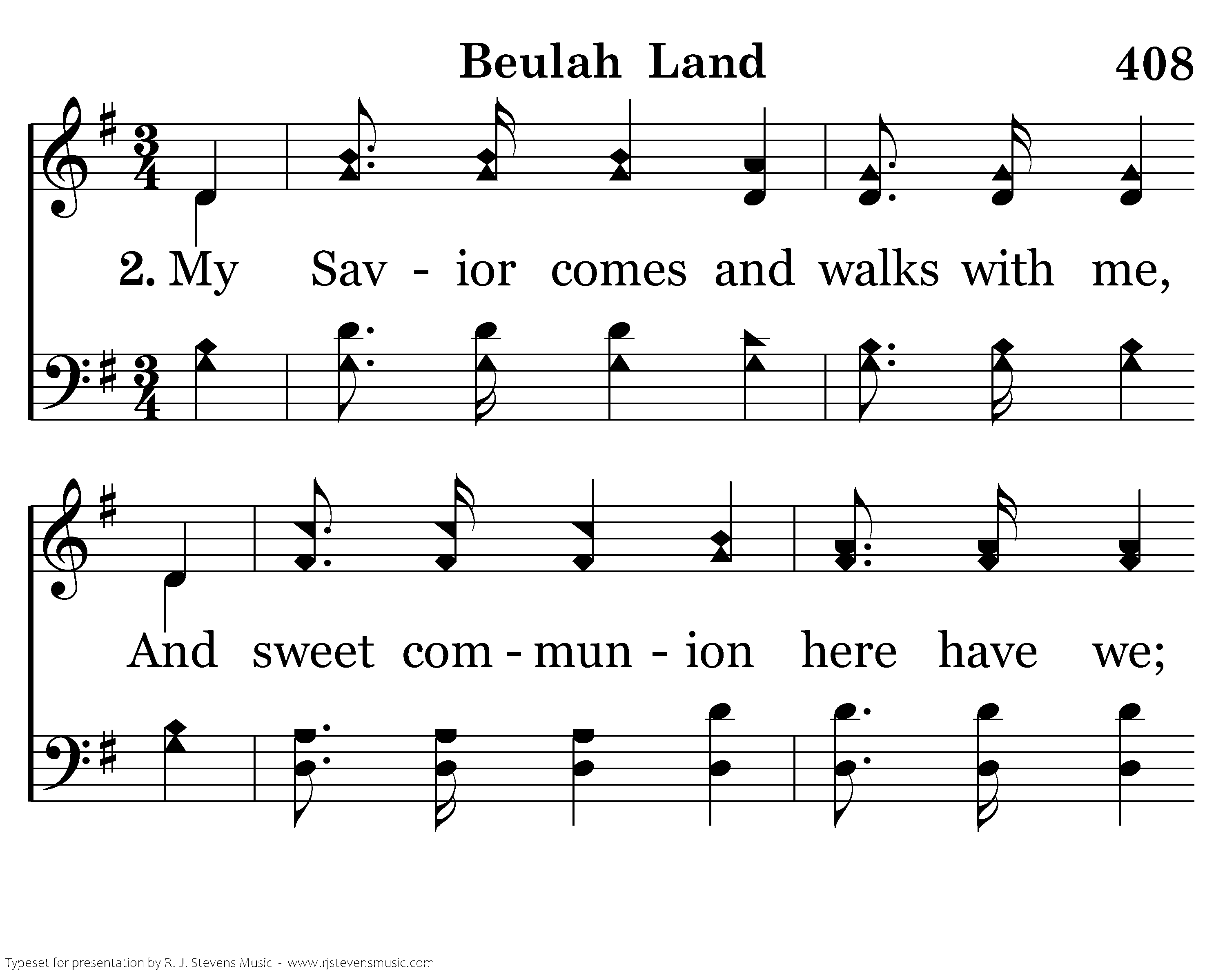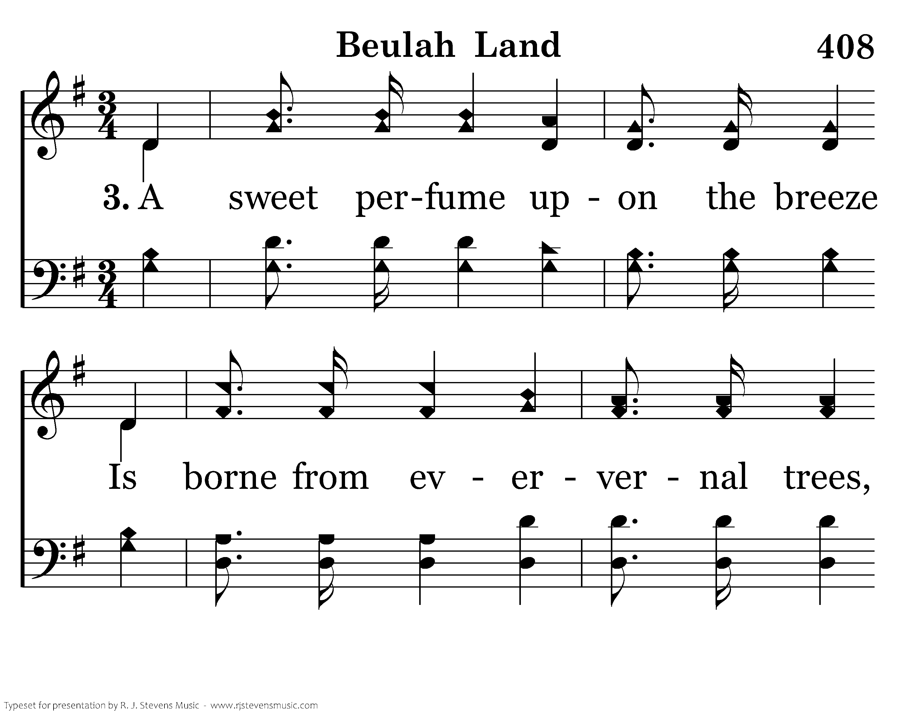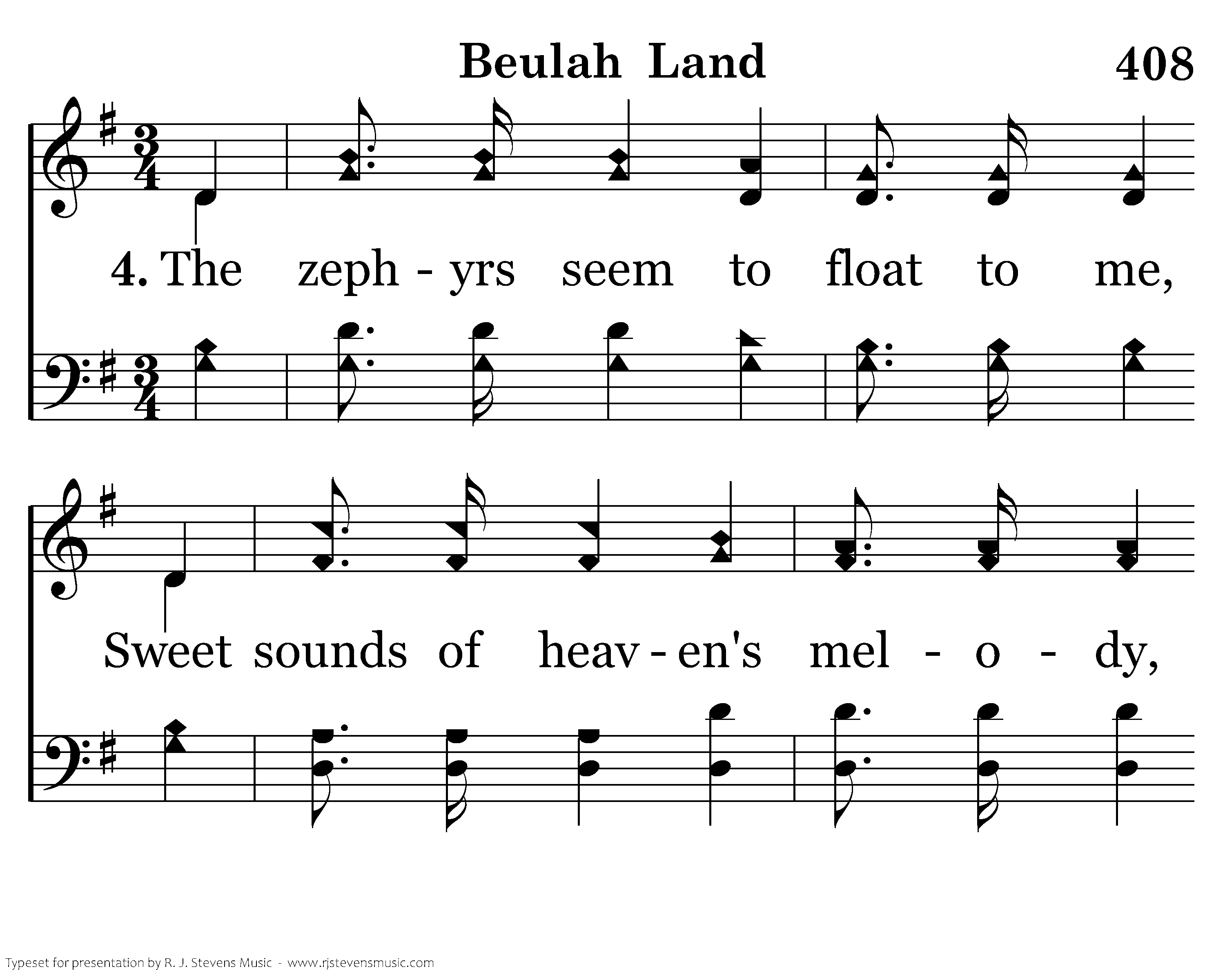 O Beulah Land, sweet Beulah Land, As on thy highest mount I stand, I look away across the sea, Where mansions are prepared for me, and view the shining gloryshore, My heav'n, my home for evermore!