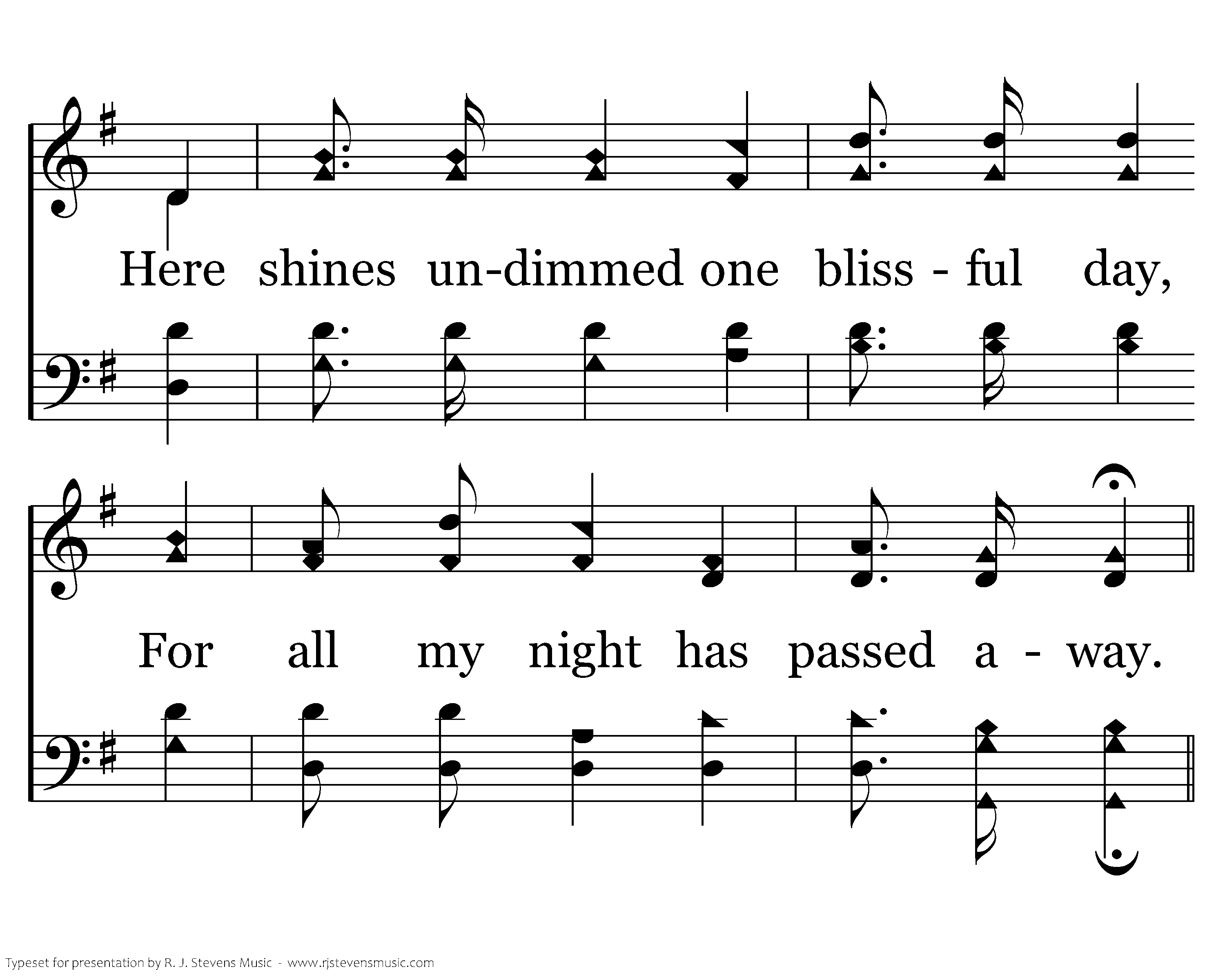 I've reached the land of corn and wine And all its riches freely mine; Here shines undimmed one blessful day, for all my night has passed away.