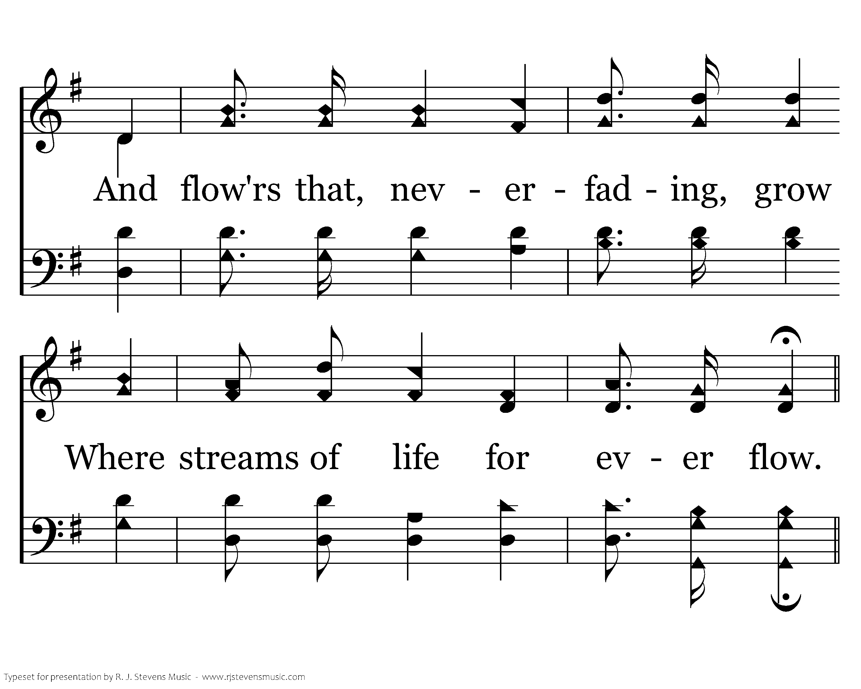 A sweet perfume upon the breeze Is borne from eververnal trees, and flow'rs that, neverfading, grow Where streams of life forever flow.