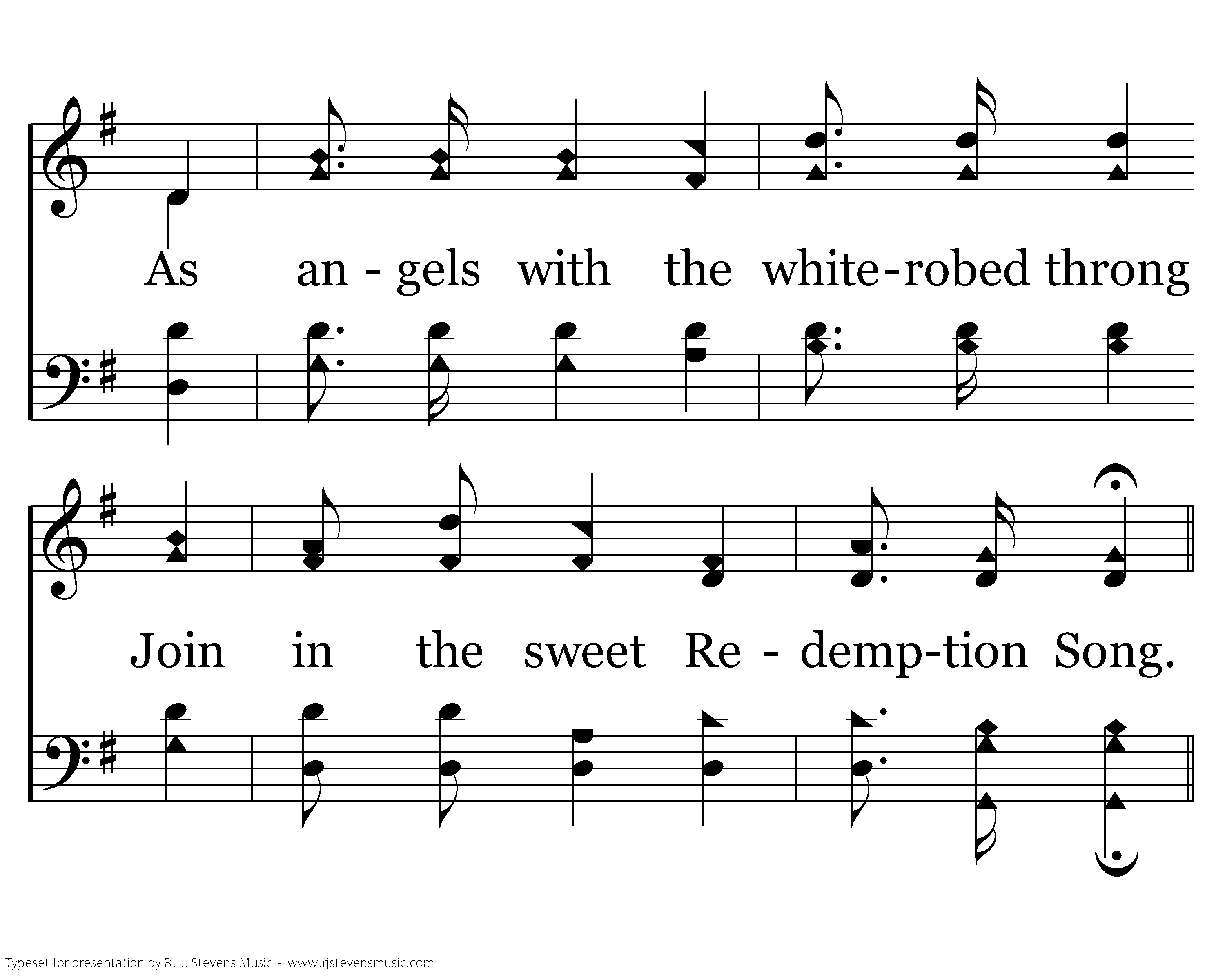 The zephyrs seem to float to me, Sweet sounds of heaven's melody, As angels with the whiterobed throng Join in the sweet redemption Song.