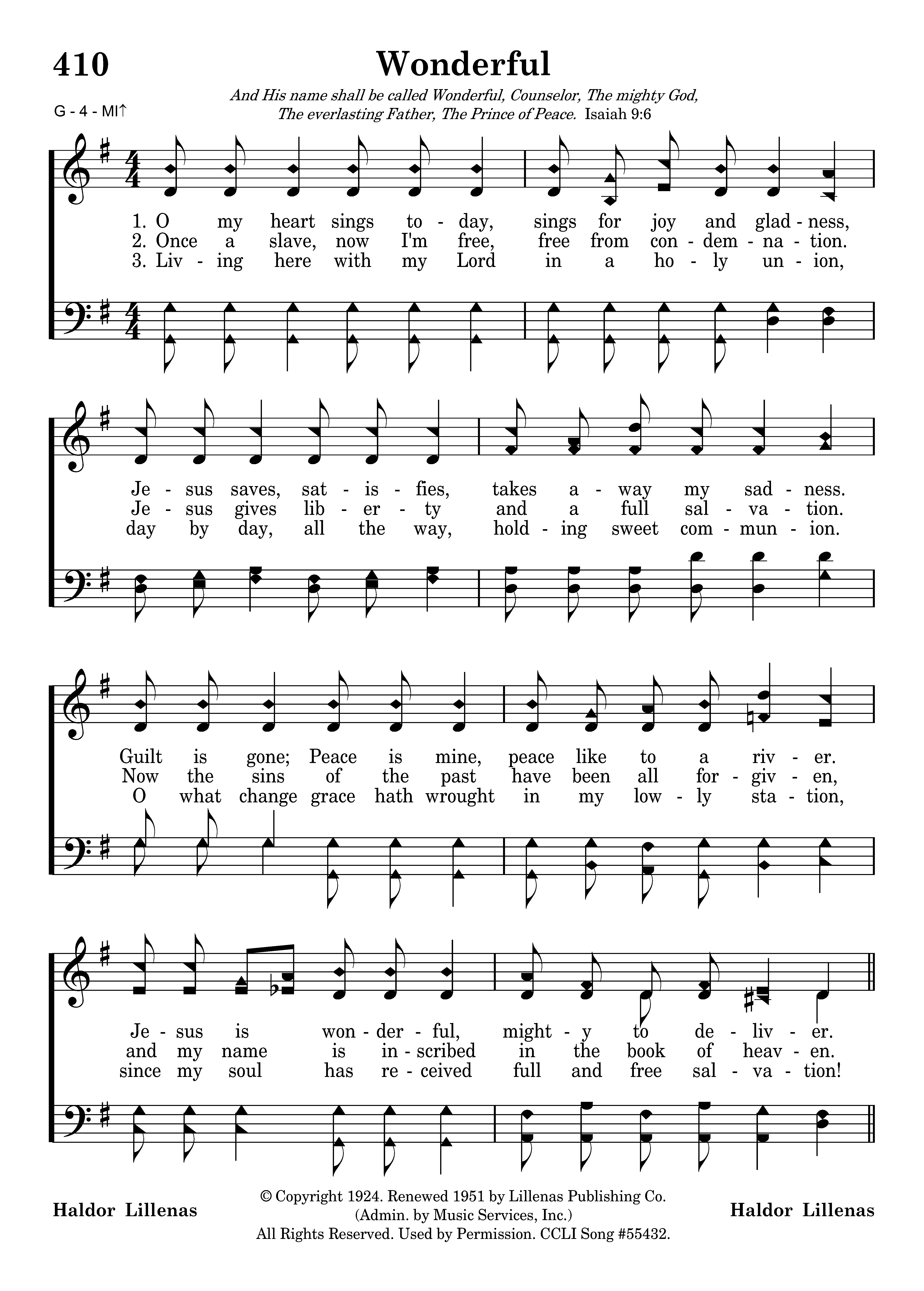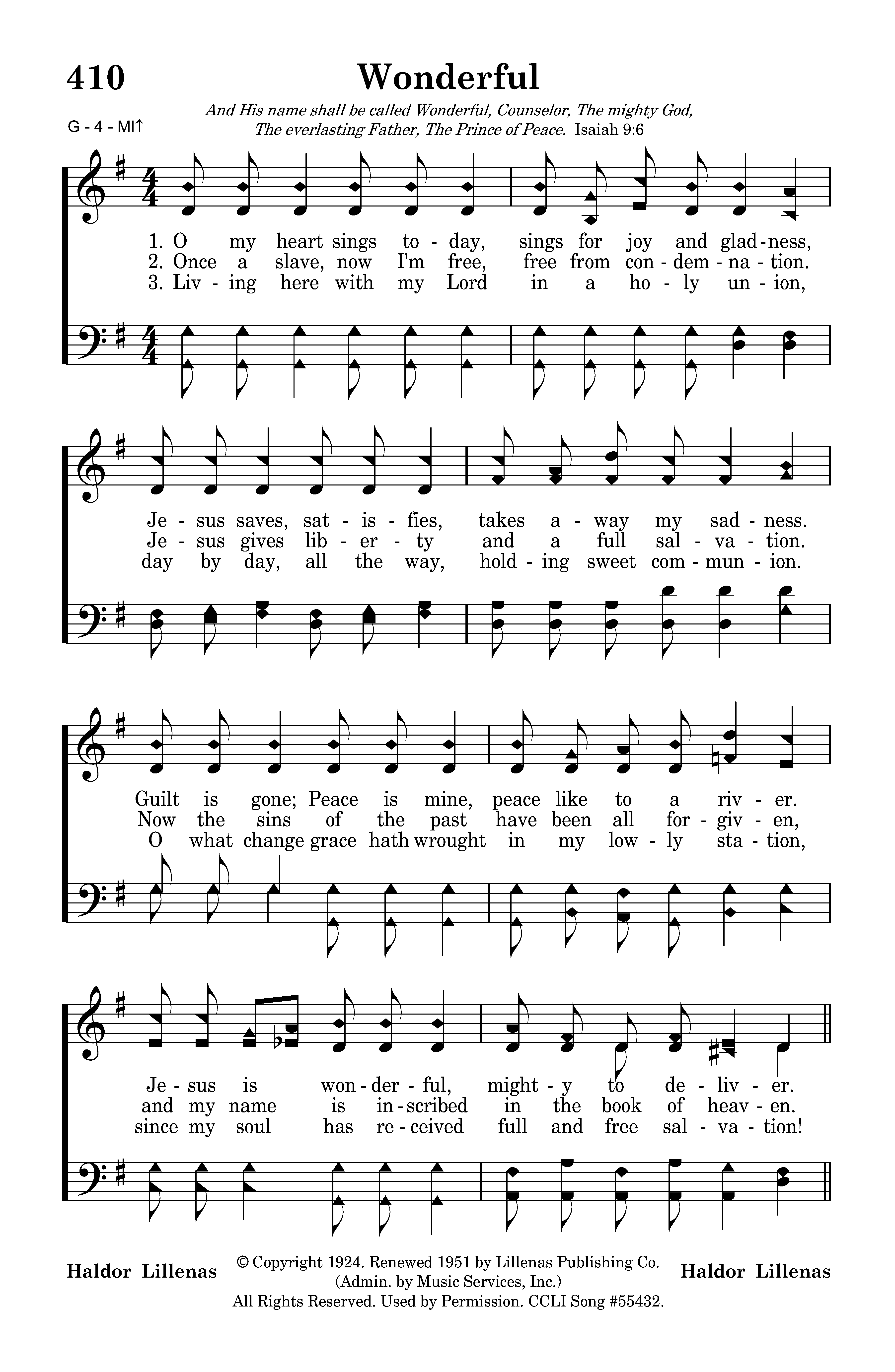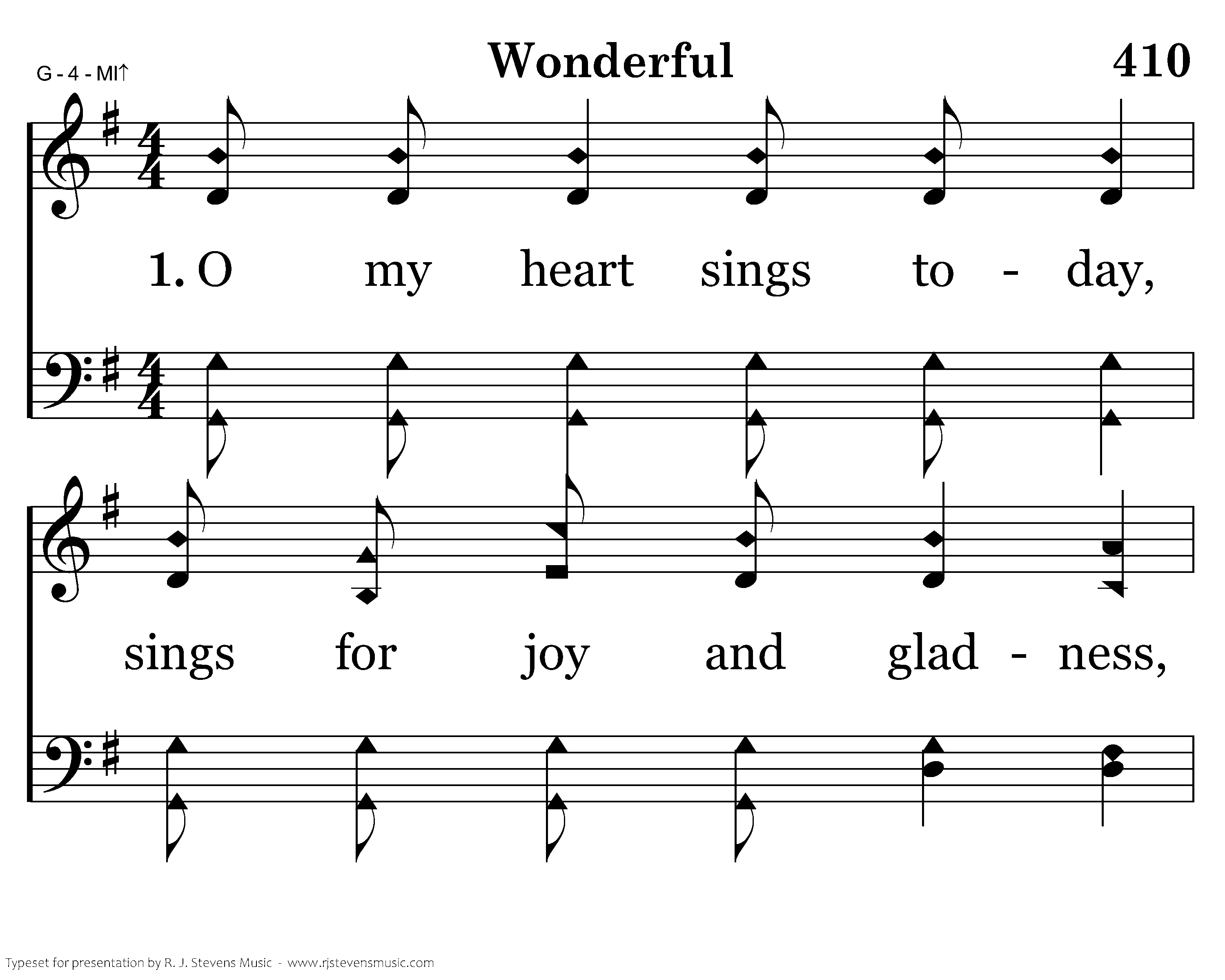 O my heart sings today, sings for joy and gladness, Jesus saves, satisfies, takes away my sadness. Guilt is gone; Peace is mine, peace like to a river. Jesus is wonderful, mighty to deliver.