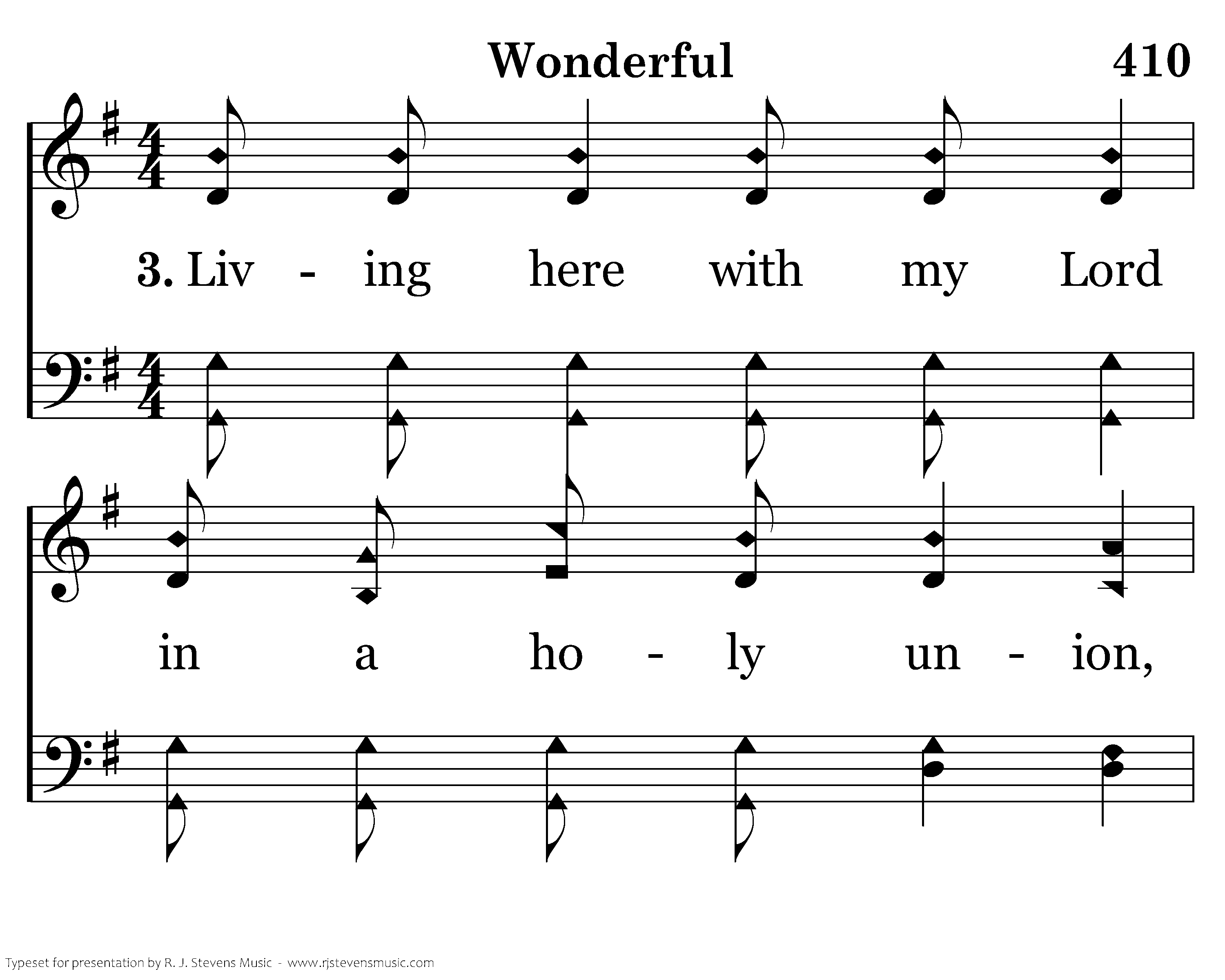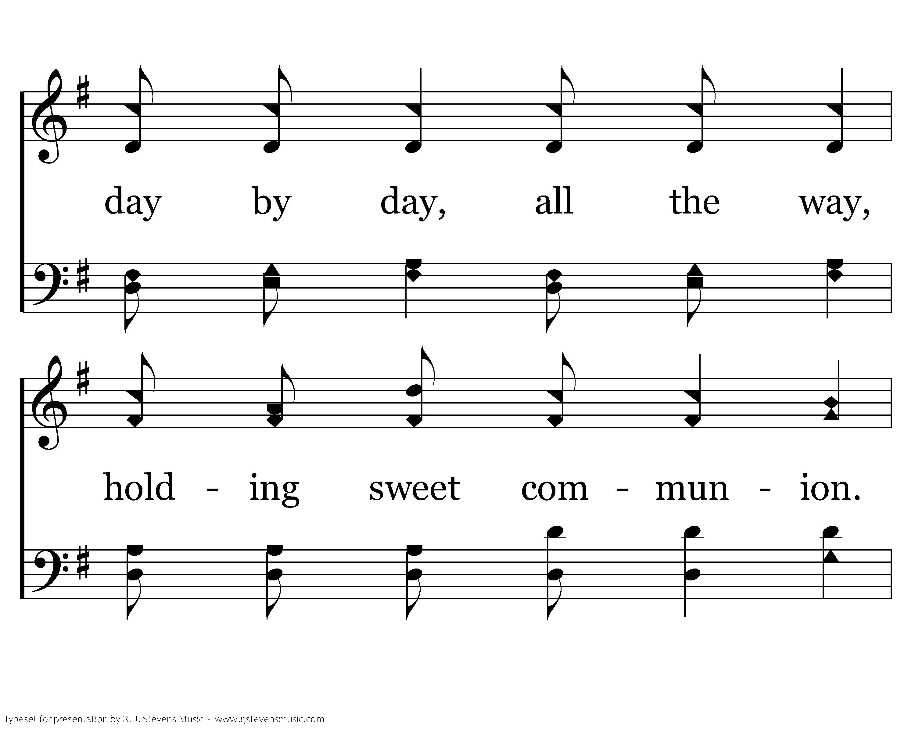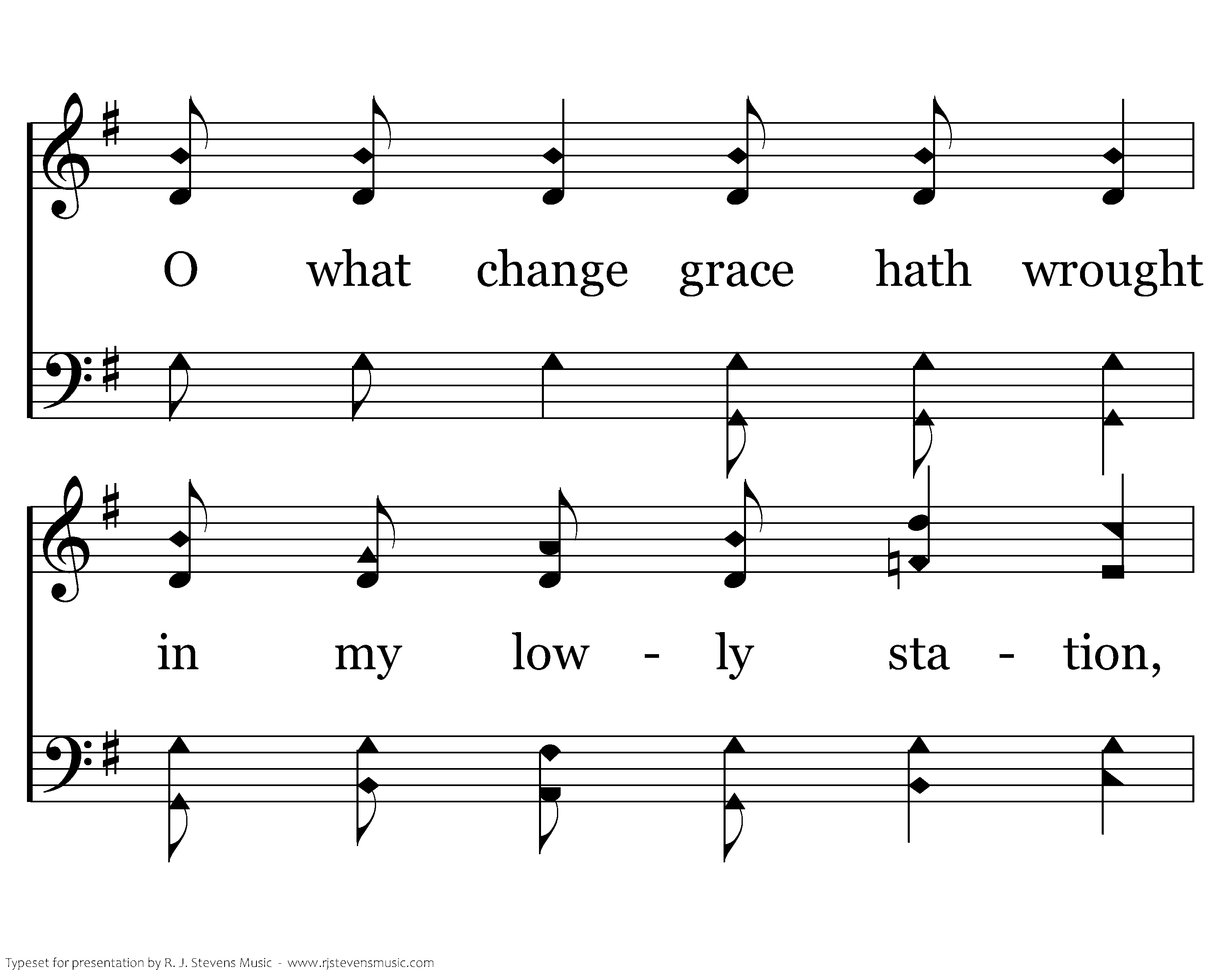 Living here with my Lord in a holy union, day by day, all the way, holding sweet communion. O what change grace hath wrought in my lowly station, since my soul has received full and free salvation!