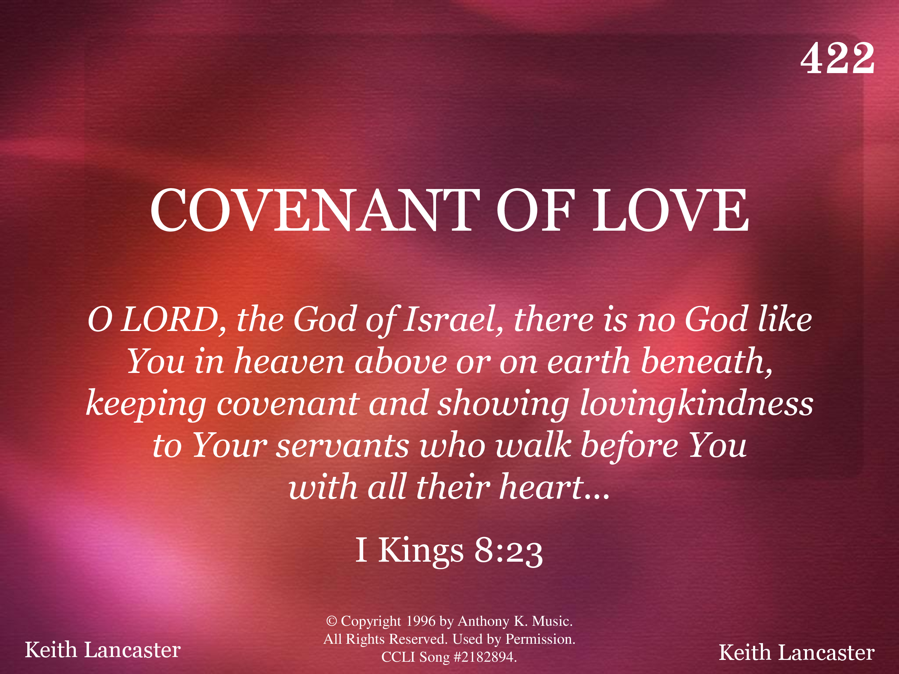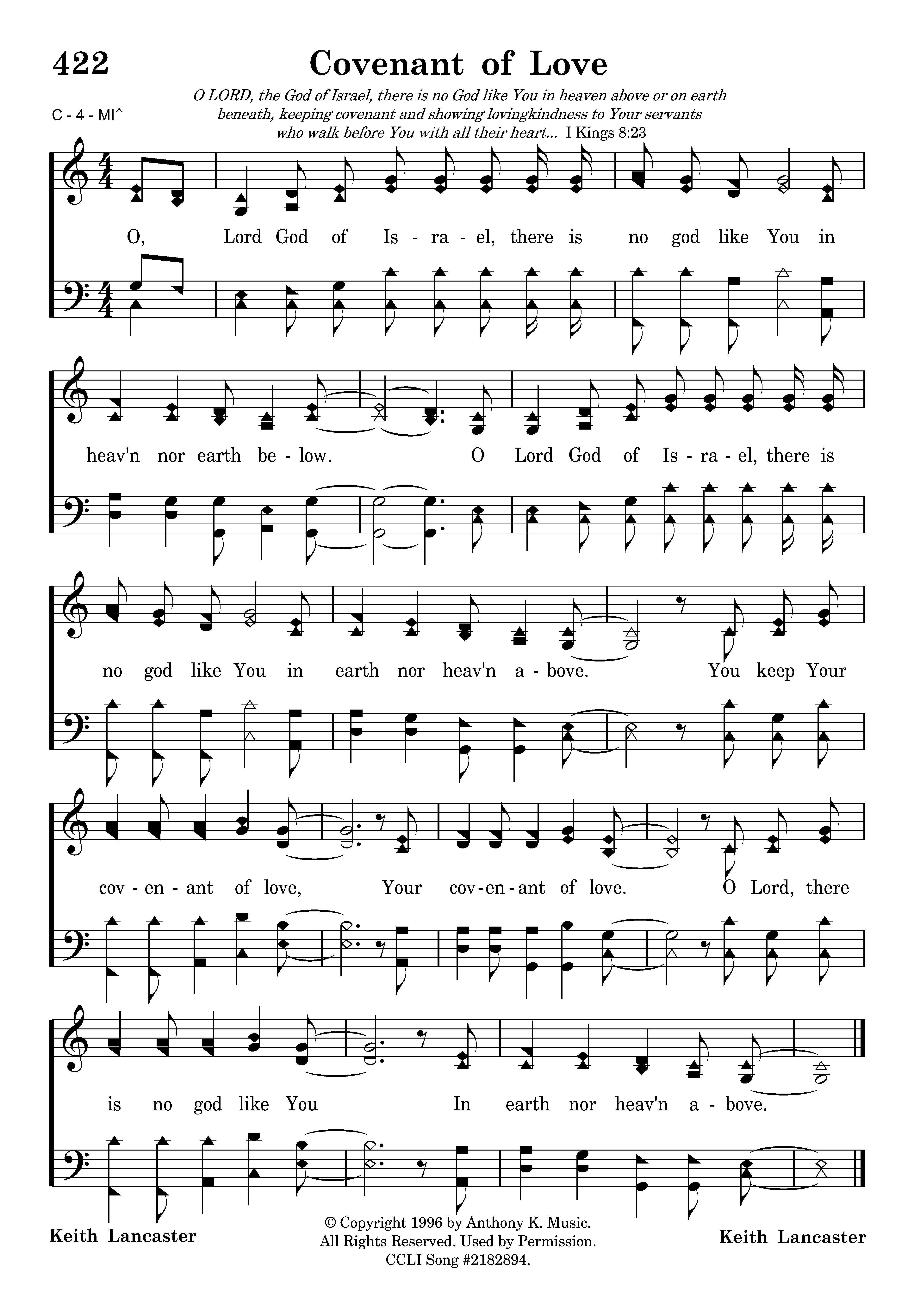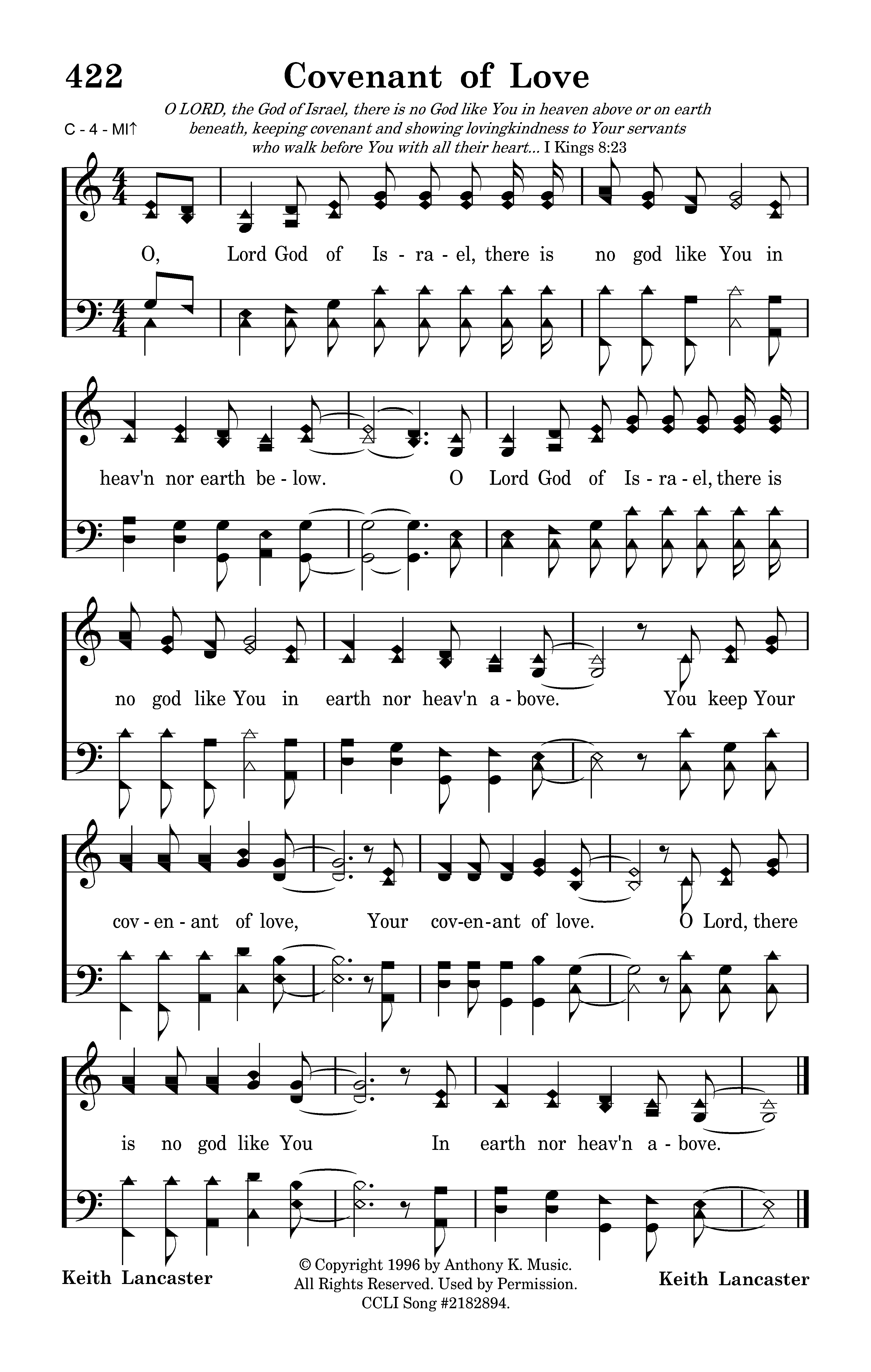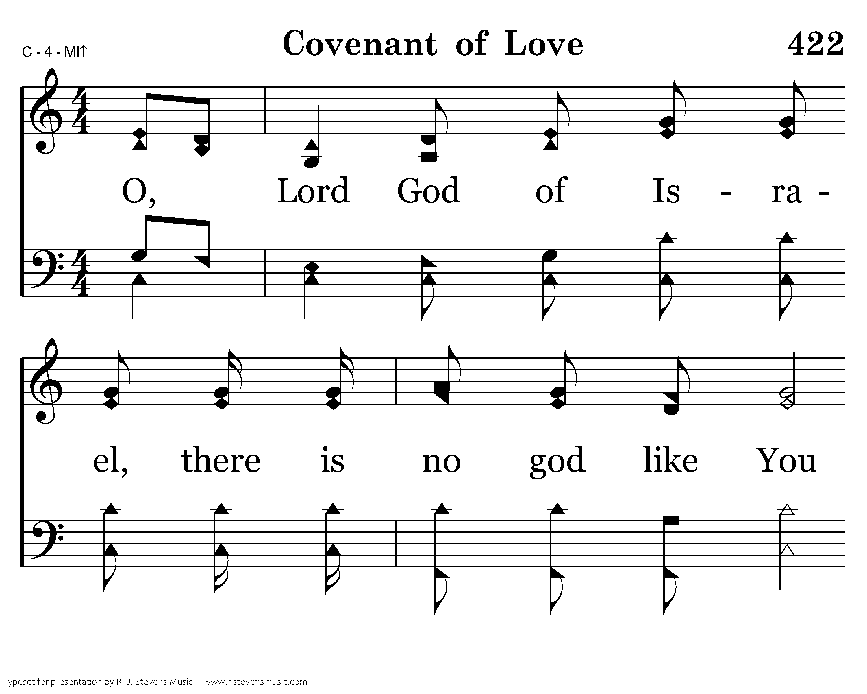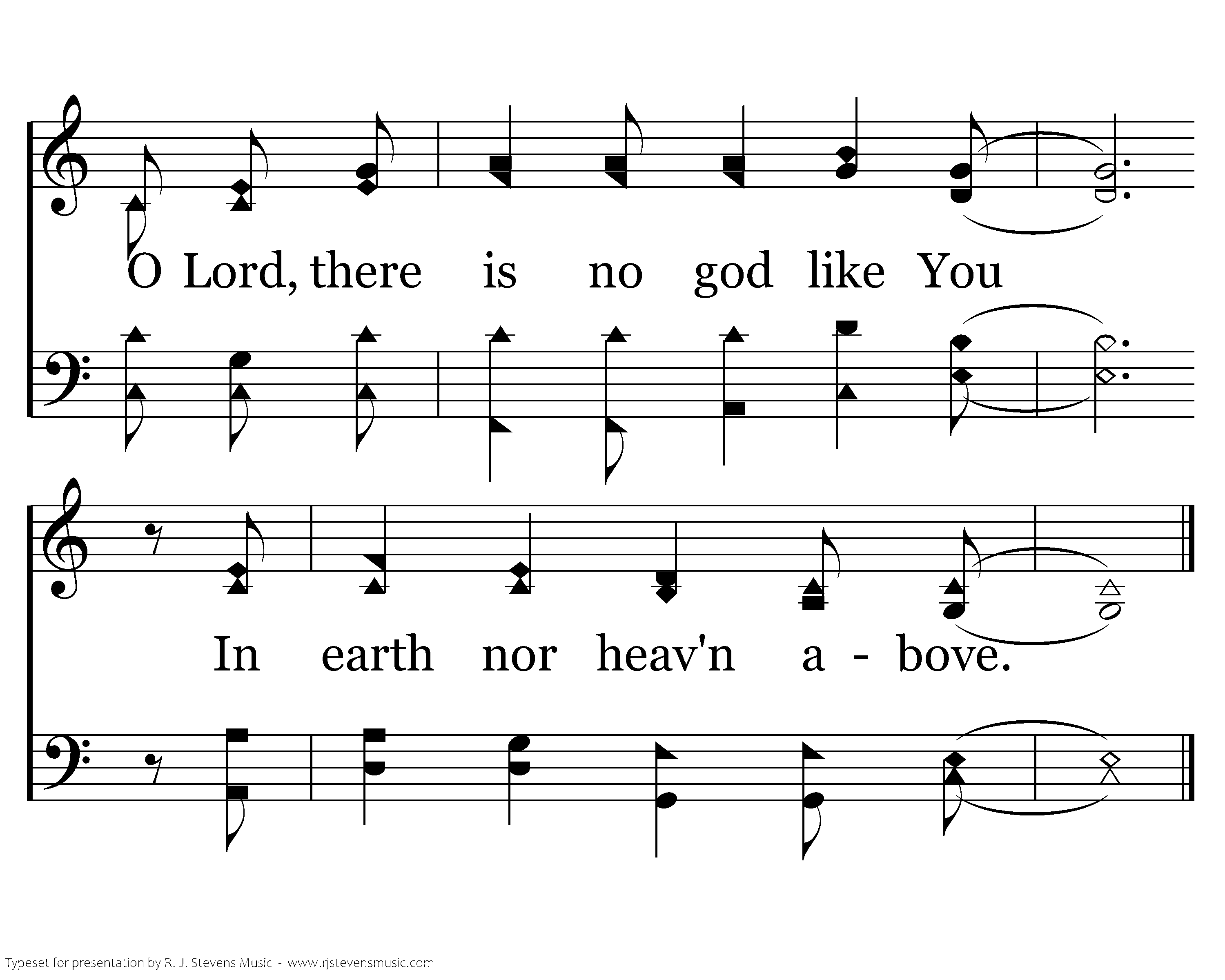 O, Lord God of Israel, there is no god like You in heav'n nor earth below. O Lord God of Israel, there is no god like You in earth nor heav'n above. You keep Your covenant of love, Your covenant of love. O Lord, there is no god like You In earth nor heav'n above.