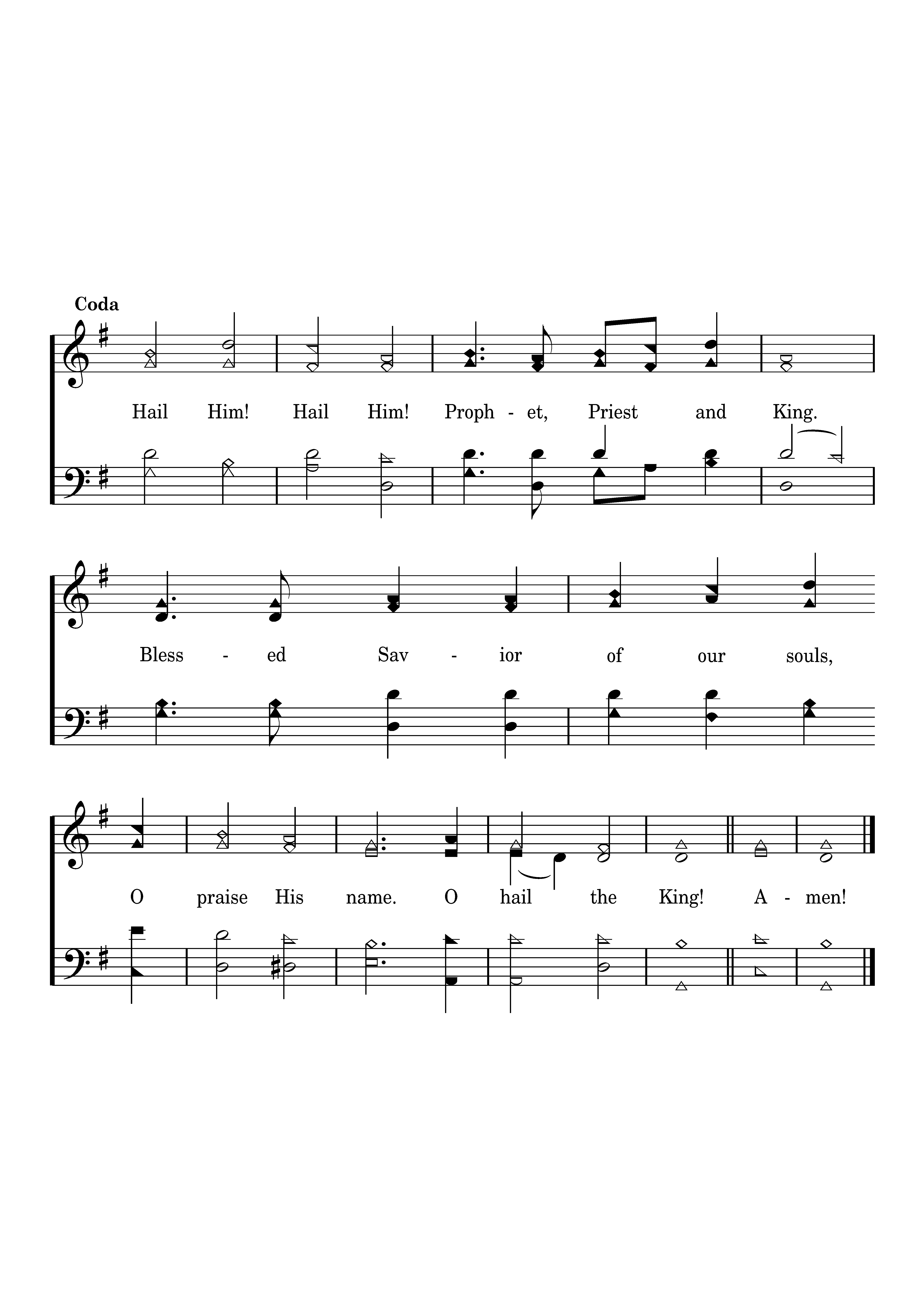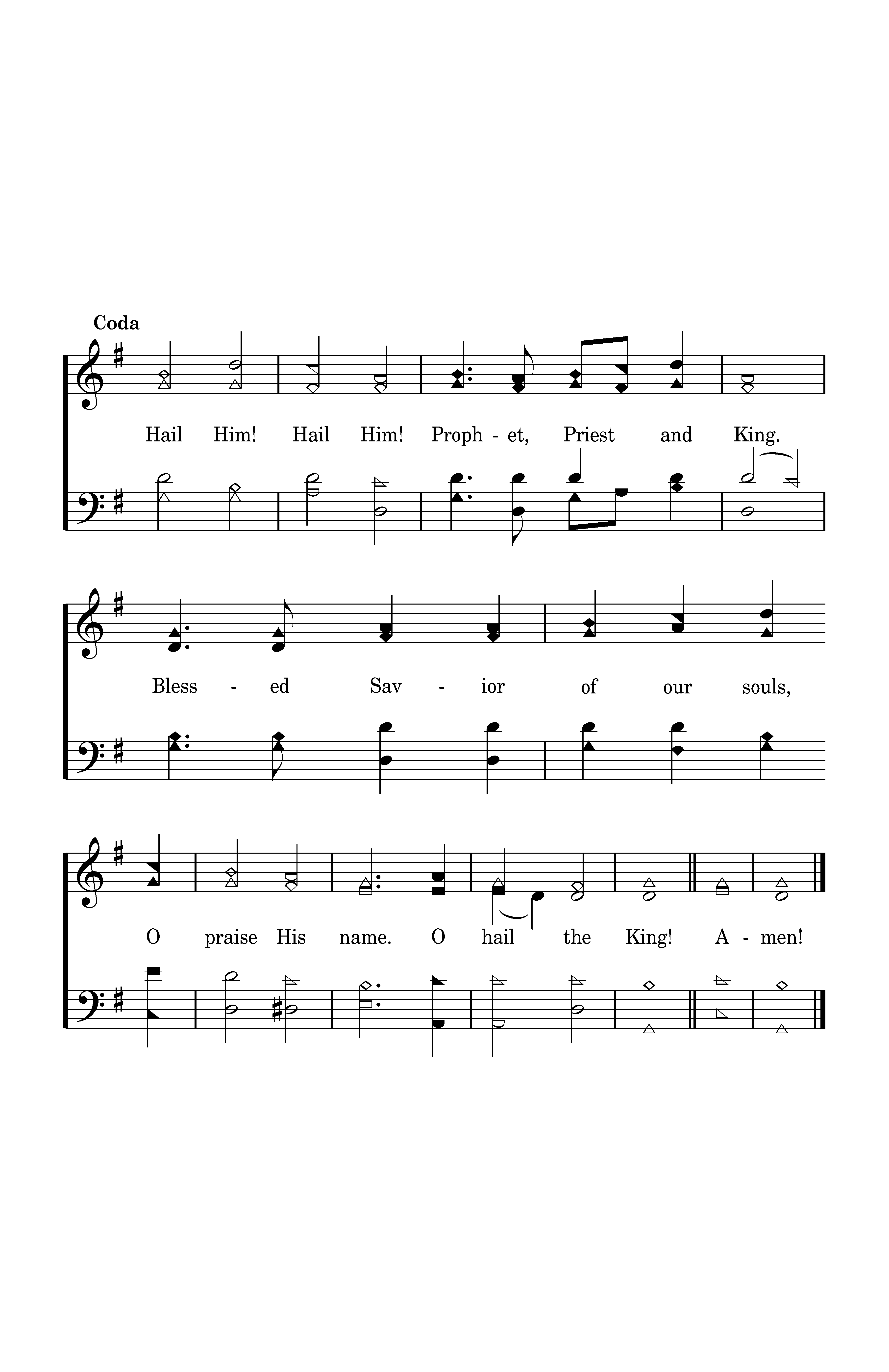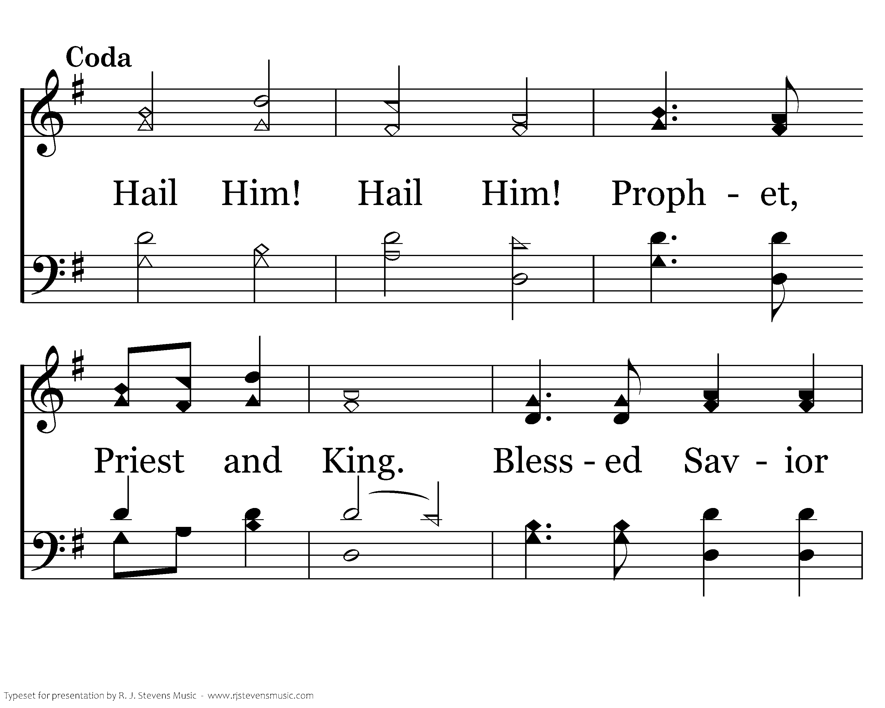 Hail Him! Hail Him! Prophet, Priest and King. Bessed Savior of our souls, Oh praise His name. Oh hail the King!