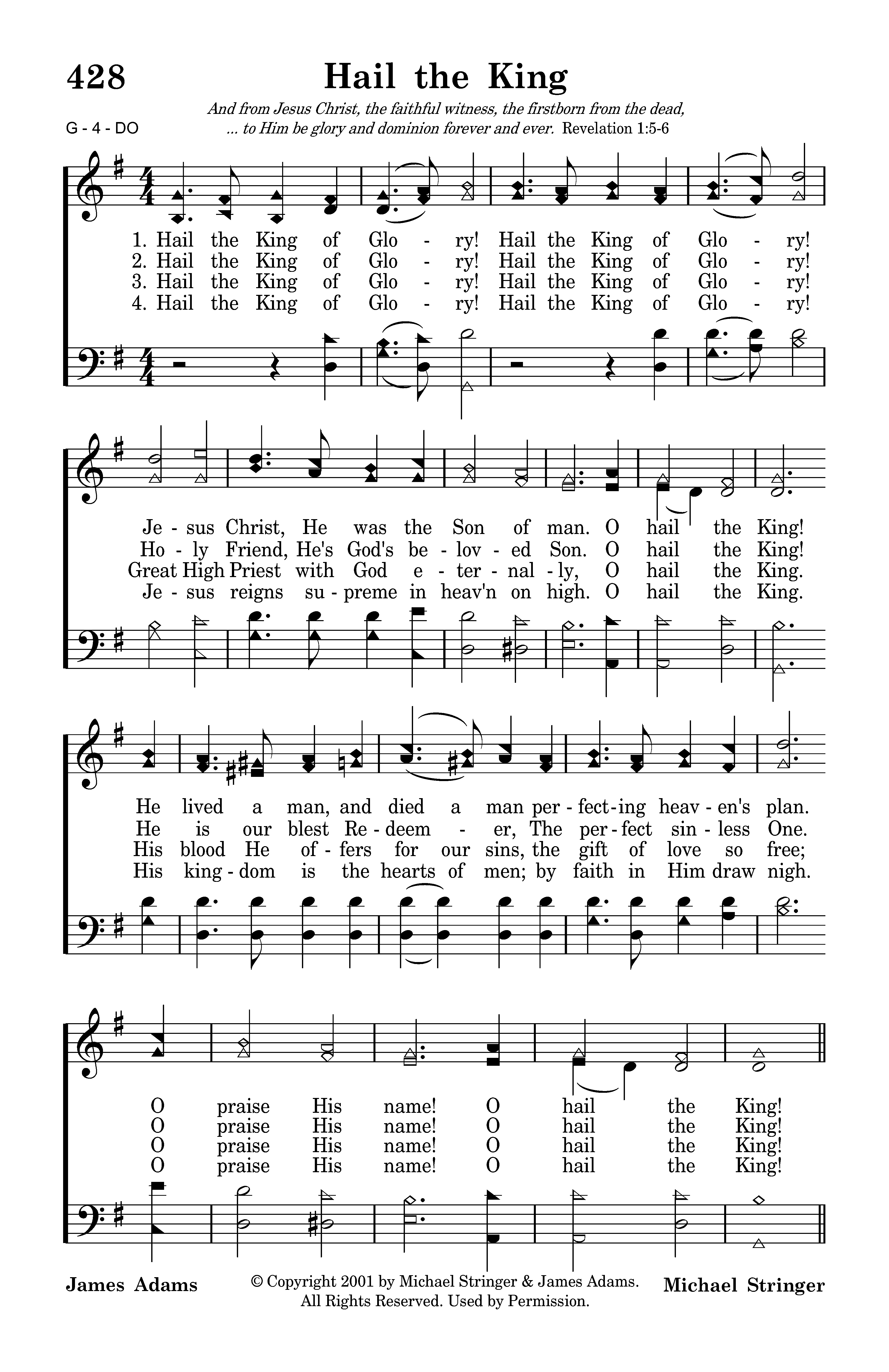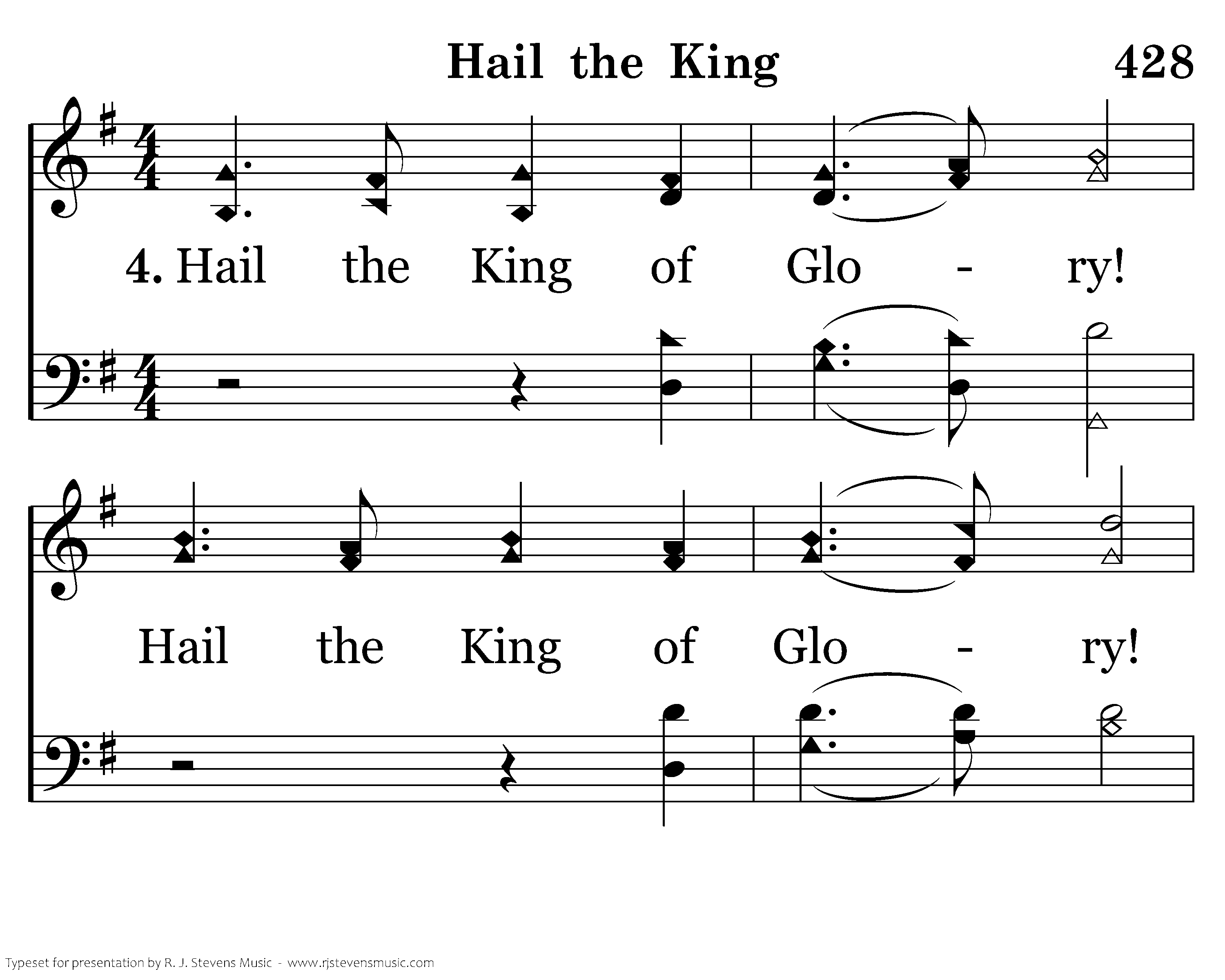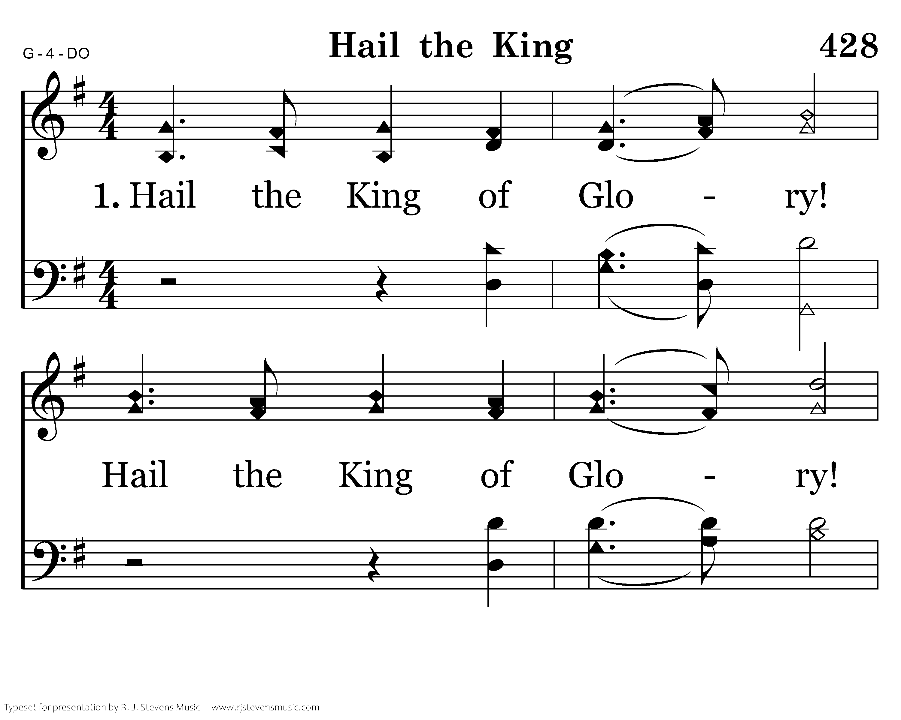 Hail the King of Glory! Hail the King of Glory! Jesus reigns supreme in heav'n on high. O hail the King! His kingdom is the hearts of men, by faith in Him draw nigh. O praise His name! O hail the King!