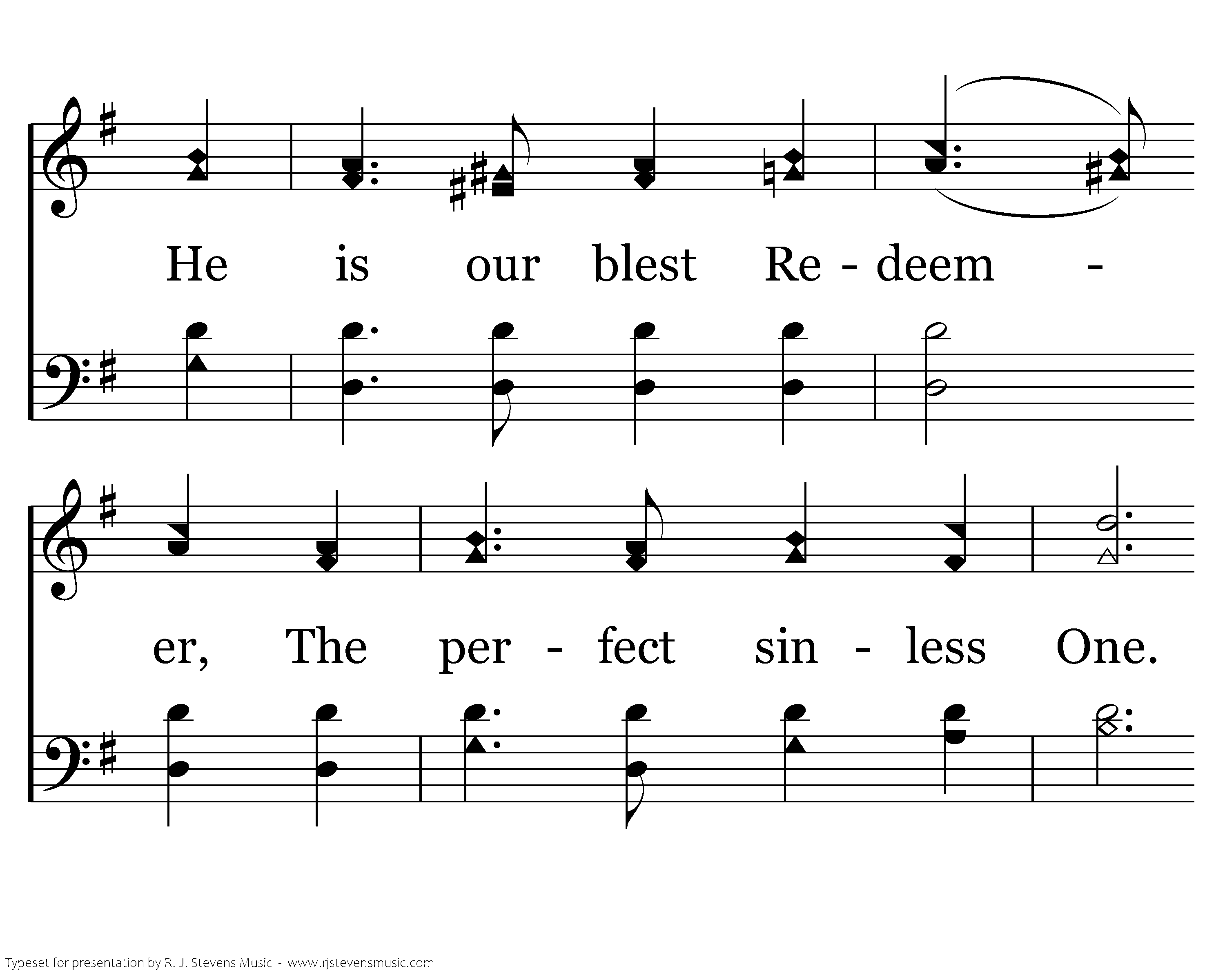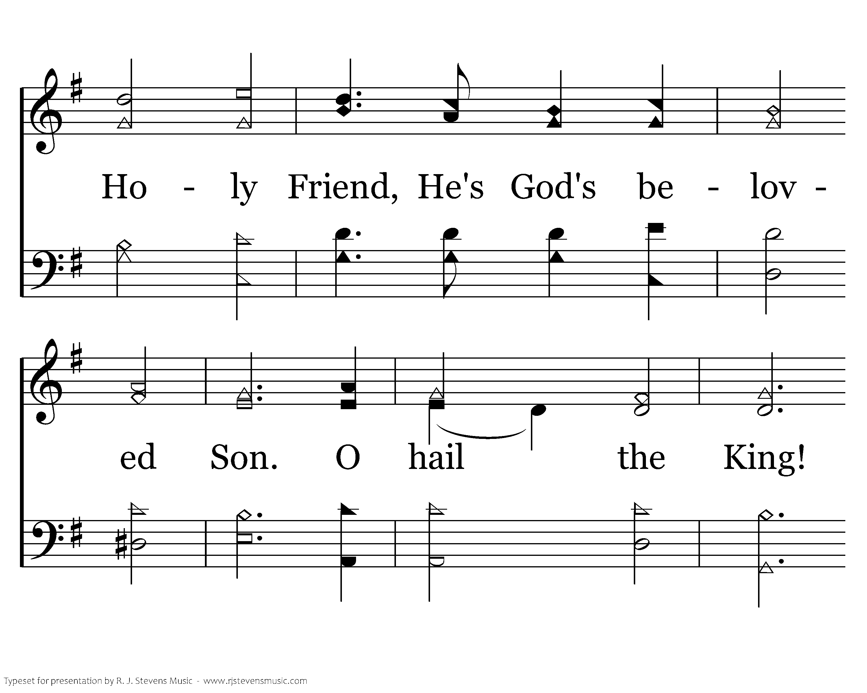 Hail the King of Glory! Hail the King of Glory! Holy Friend, He's God's beloved Son. O hail the King! He is our blest Redeemer, The perfect sinless One, O praise His name! O hail the King!