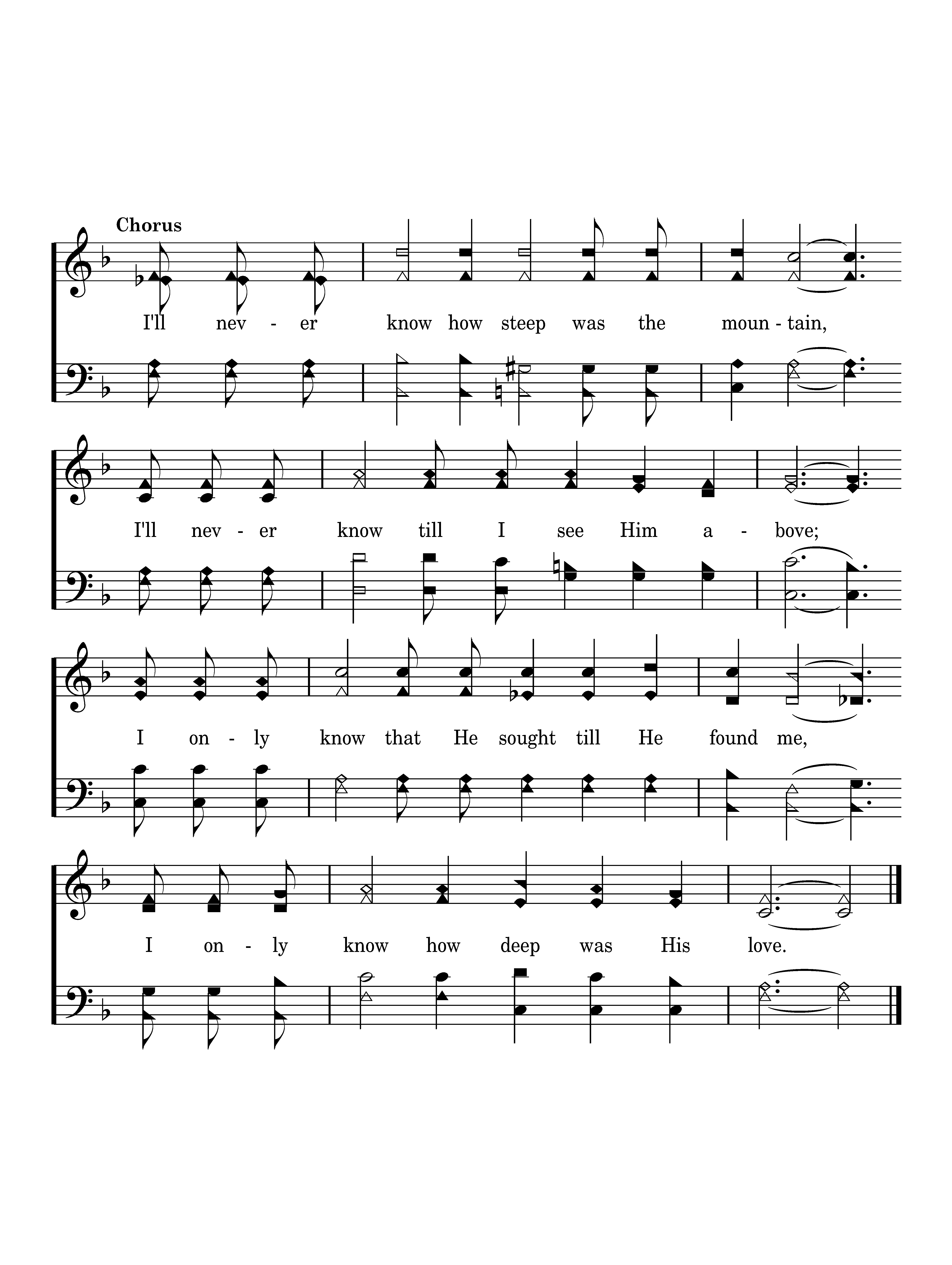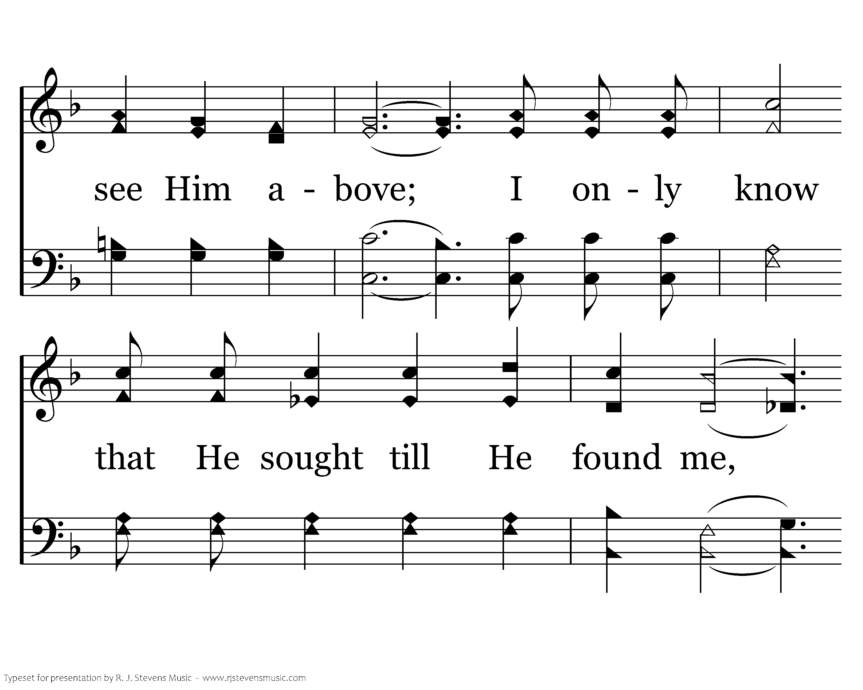 I'll never know how steep was the mountain, I'll never know till I see Him above; I only know that He sought till He found me, I only know how deep was His love.