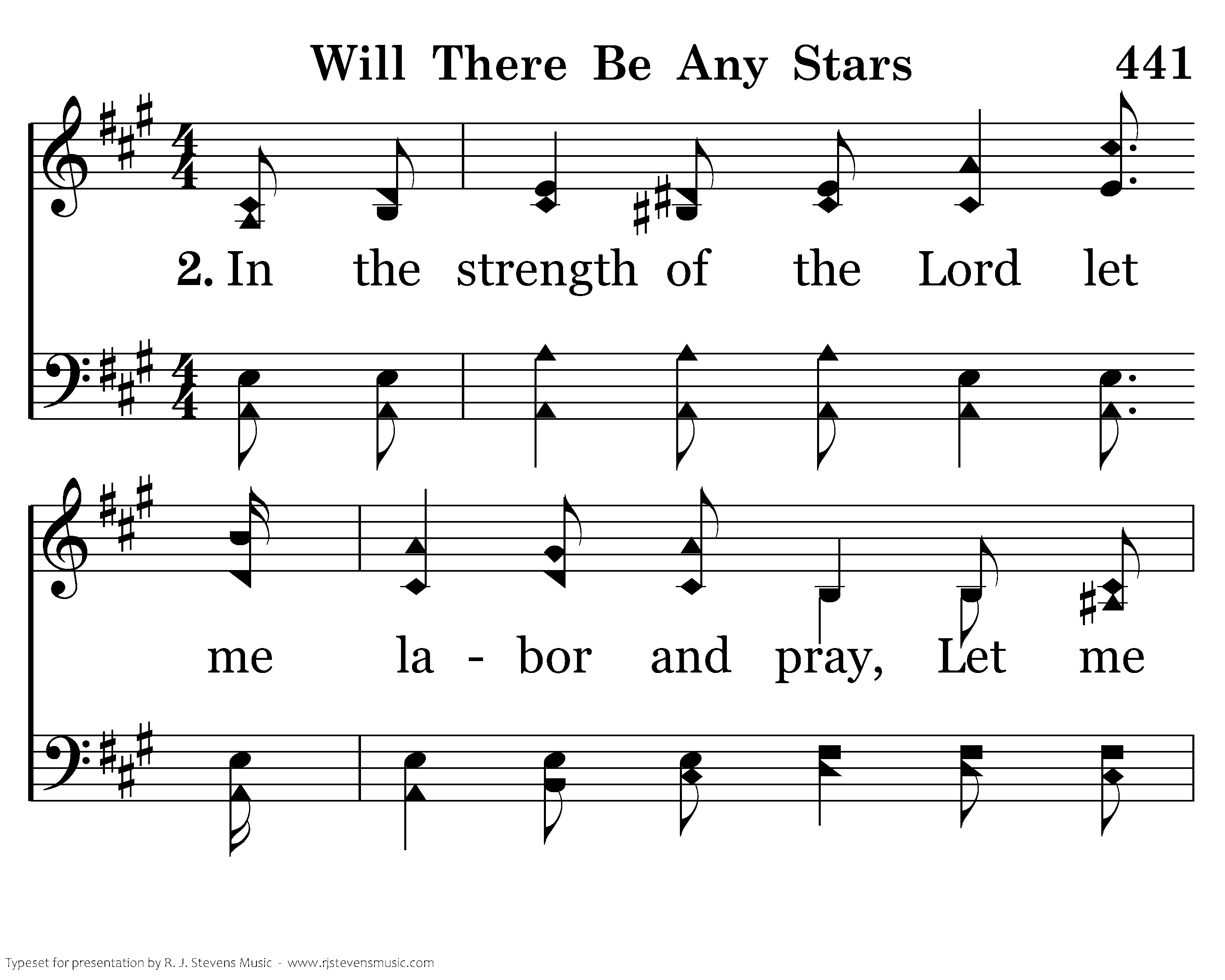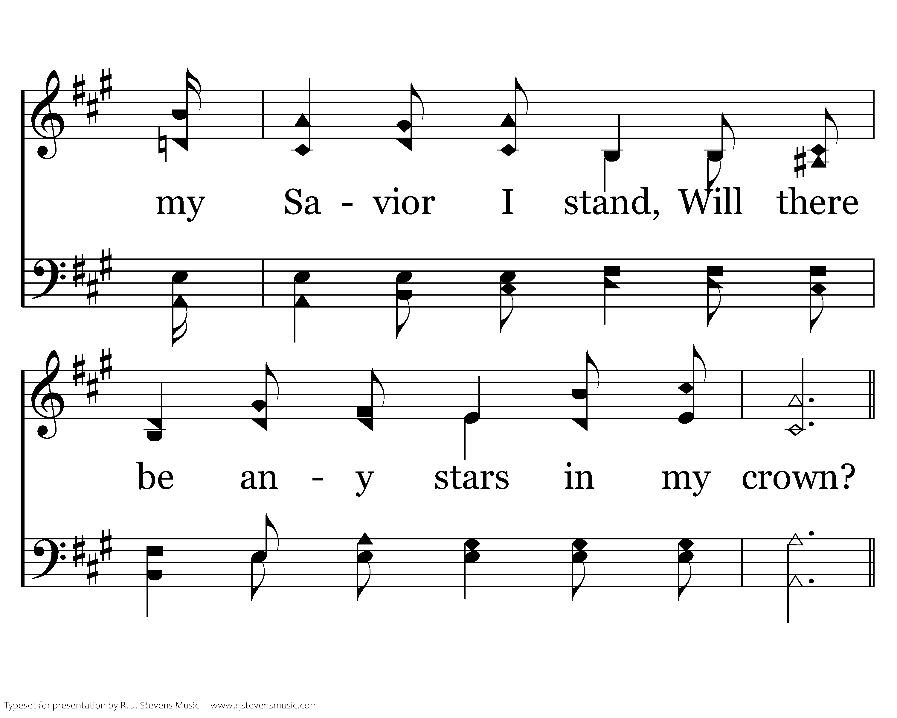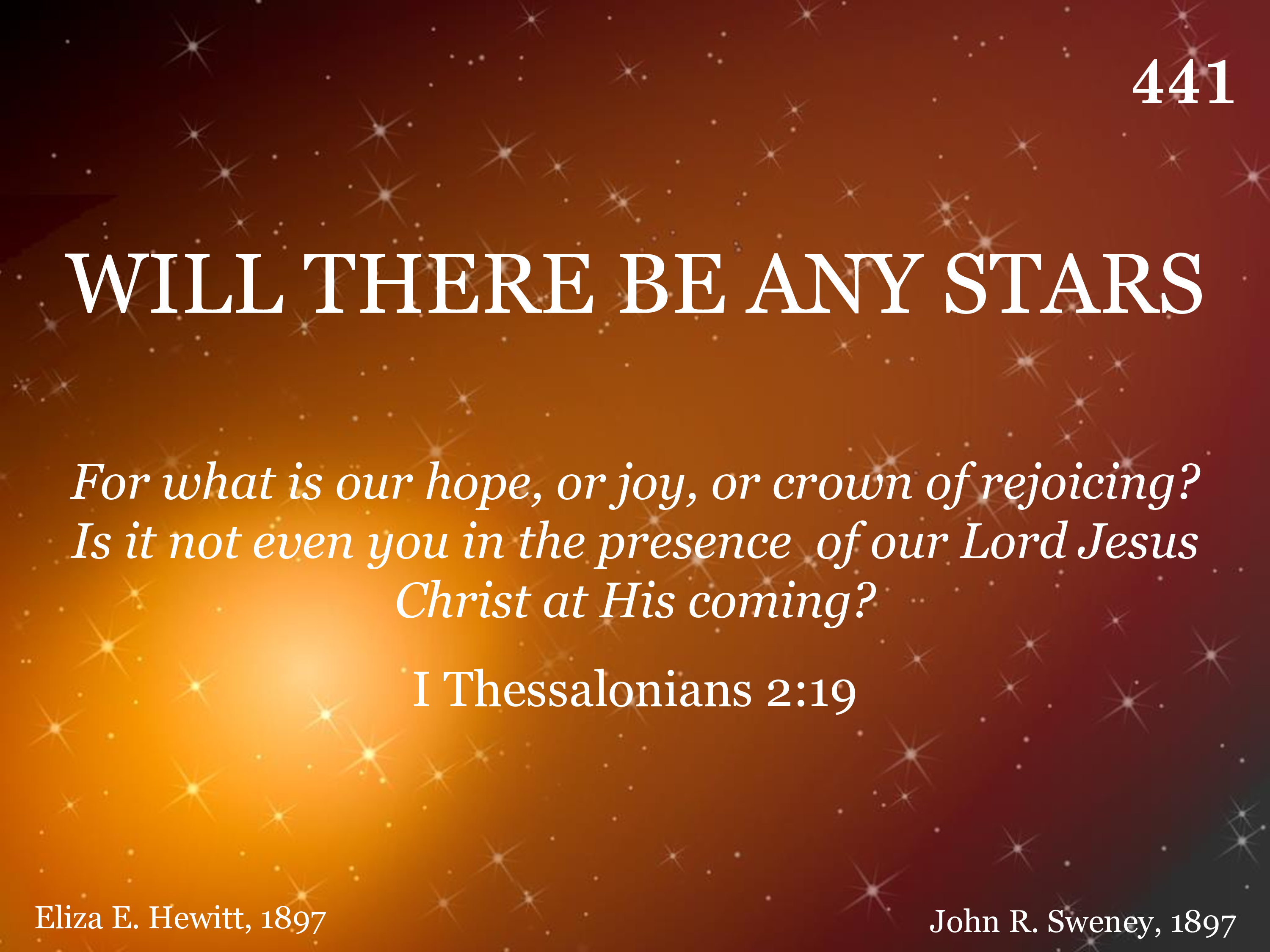 Will there be any stars, any stars in my crown When at evening the sun goeth down? When I wake with the blest in the mansions of rest, Will there be any stars in my crown?