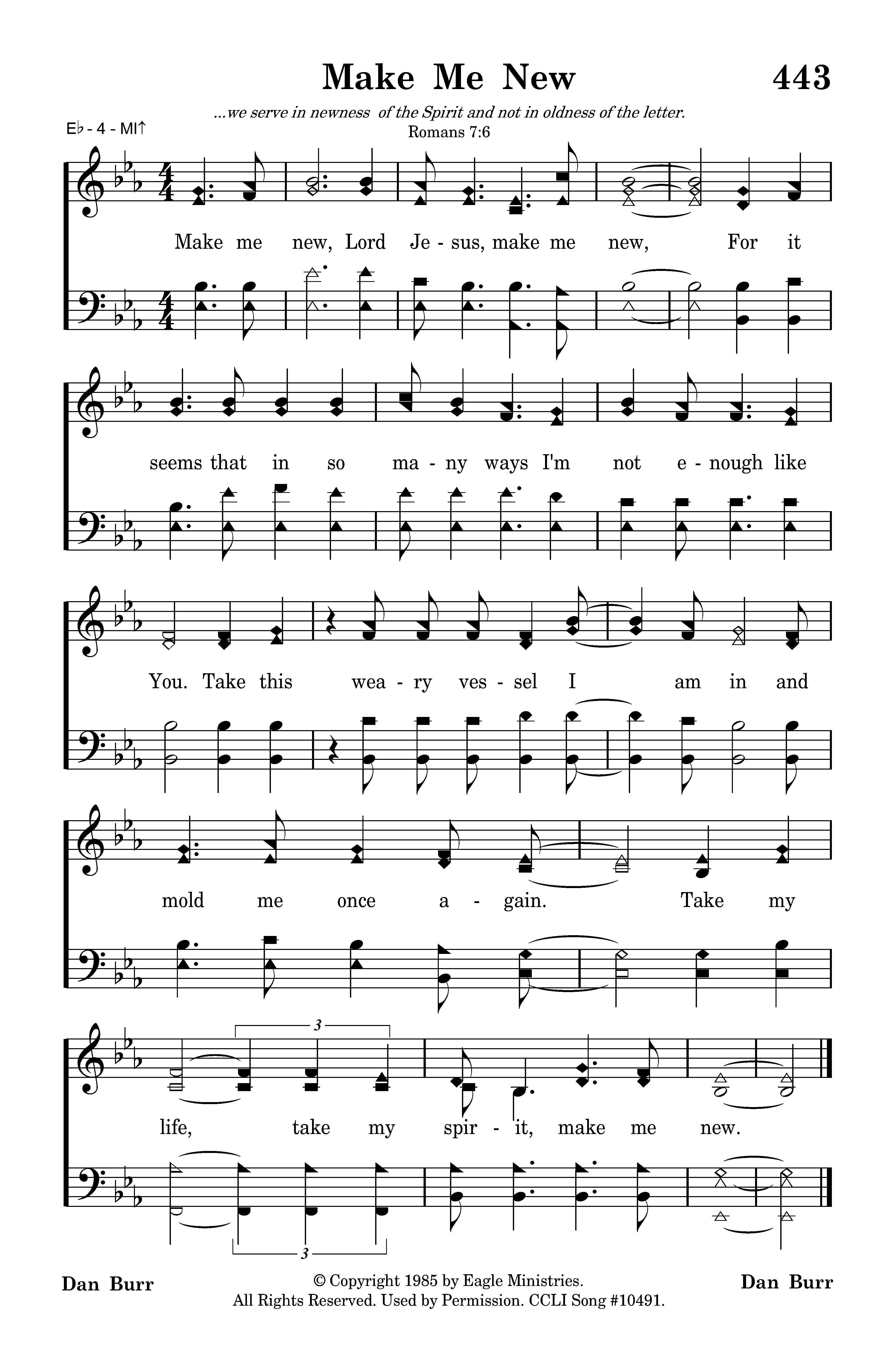 Make me new, Lord Jesus, make me new, For it seems that in so many ways I'm not enough like You. Take this weary vessel I am in and mold me once again. Take my life, take my spirit, make me new.