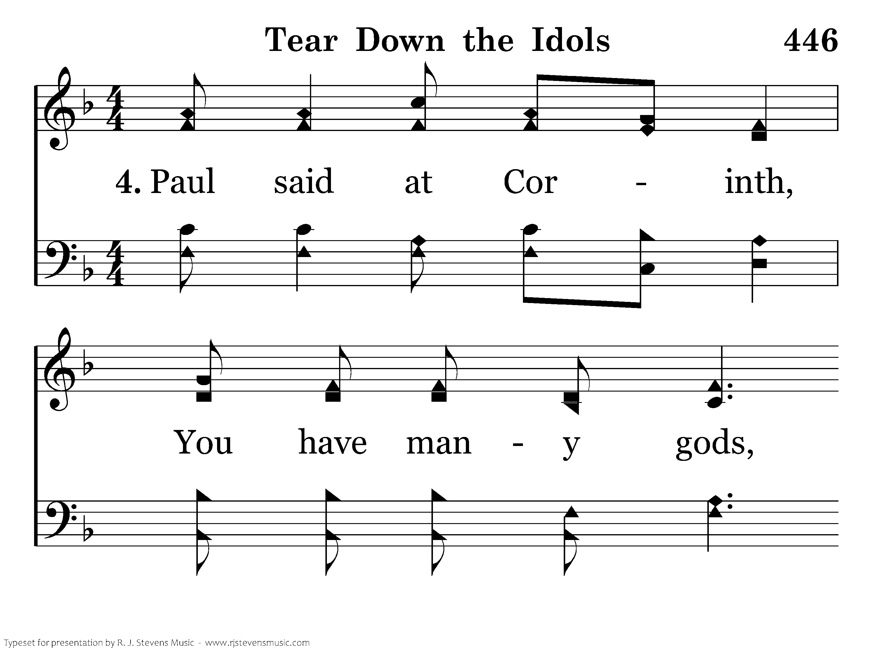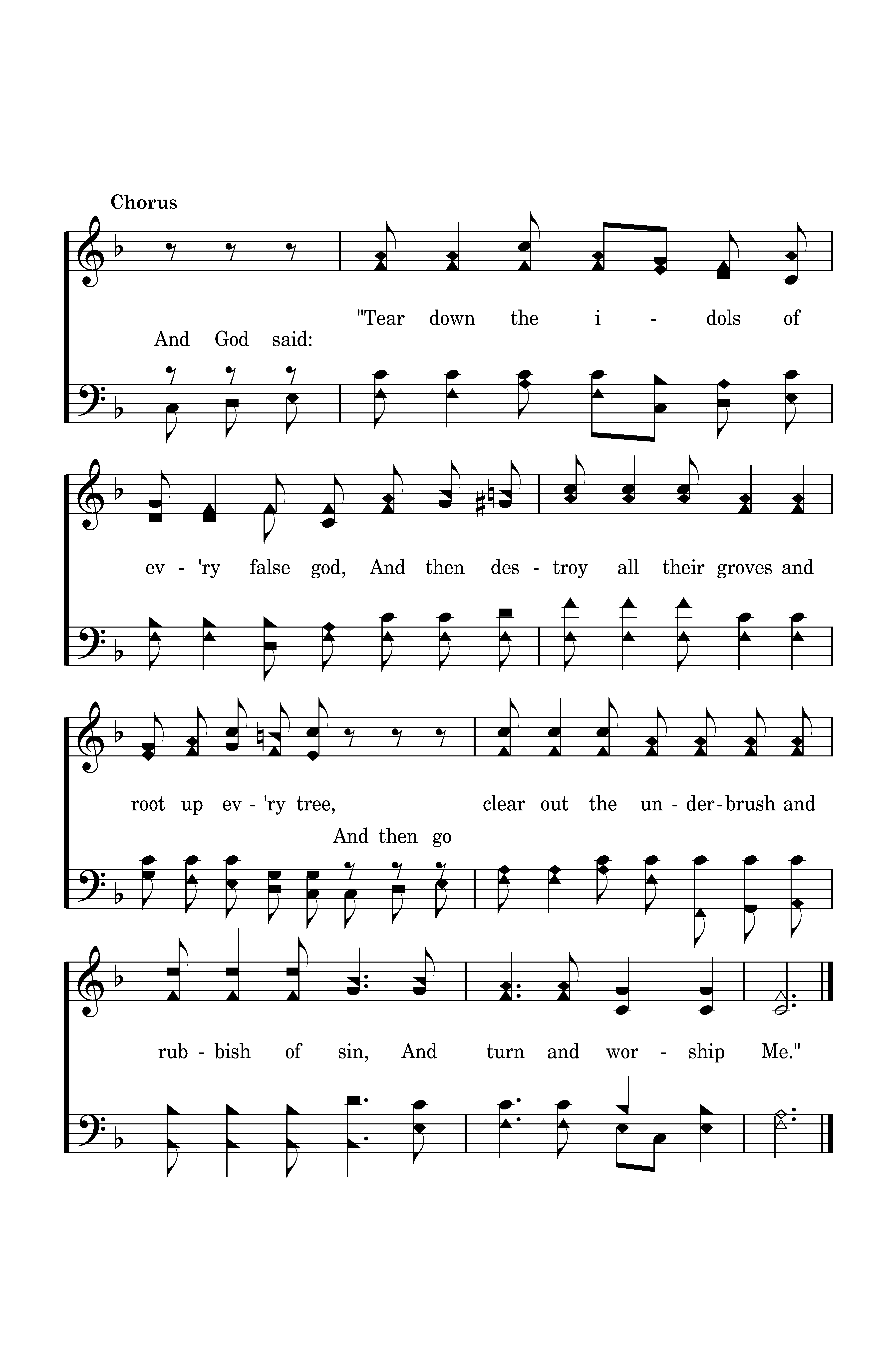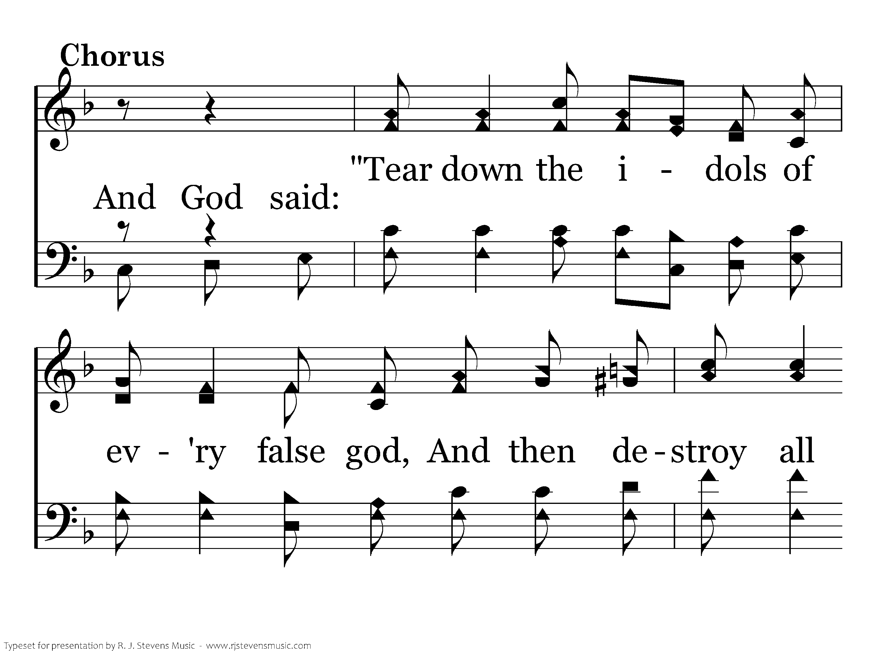 And God said: "Tear down the idos of ev'ry false god, And then destroy all their groves and root up ev'ry tree, And then go clear out the underbrush and rubbish of sin, And turn and worship Me."