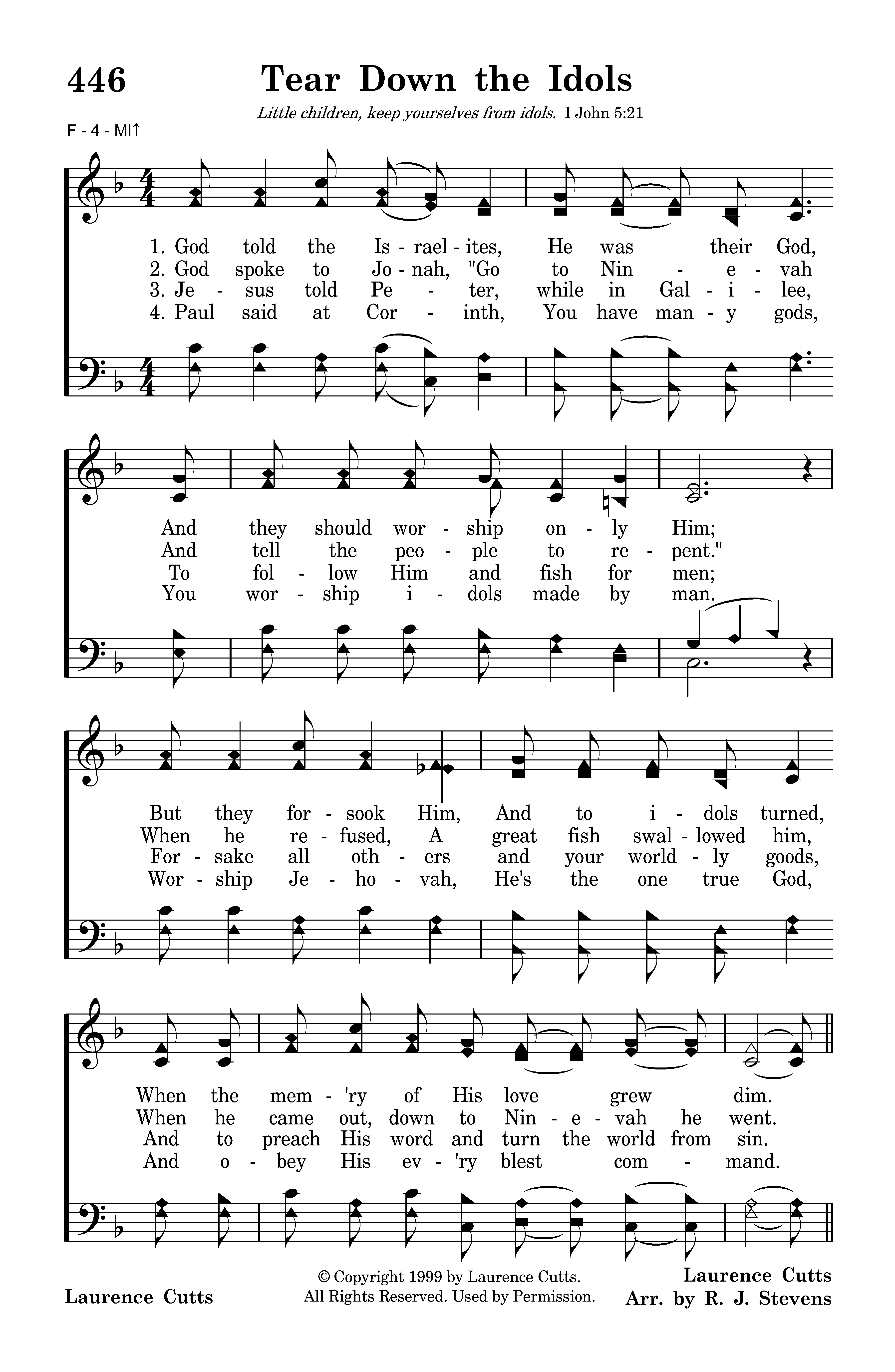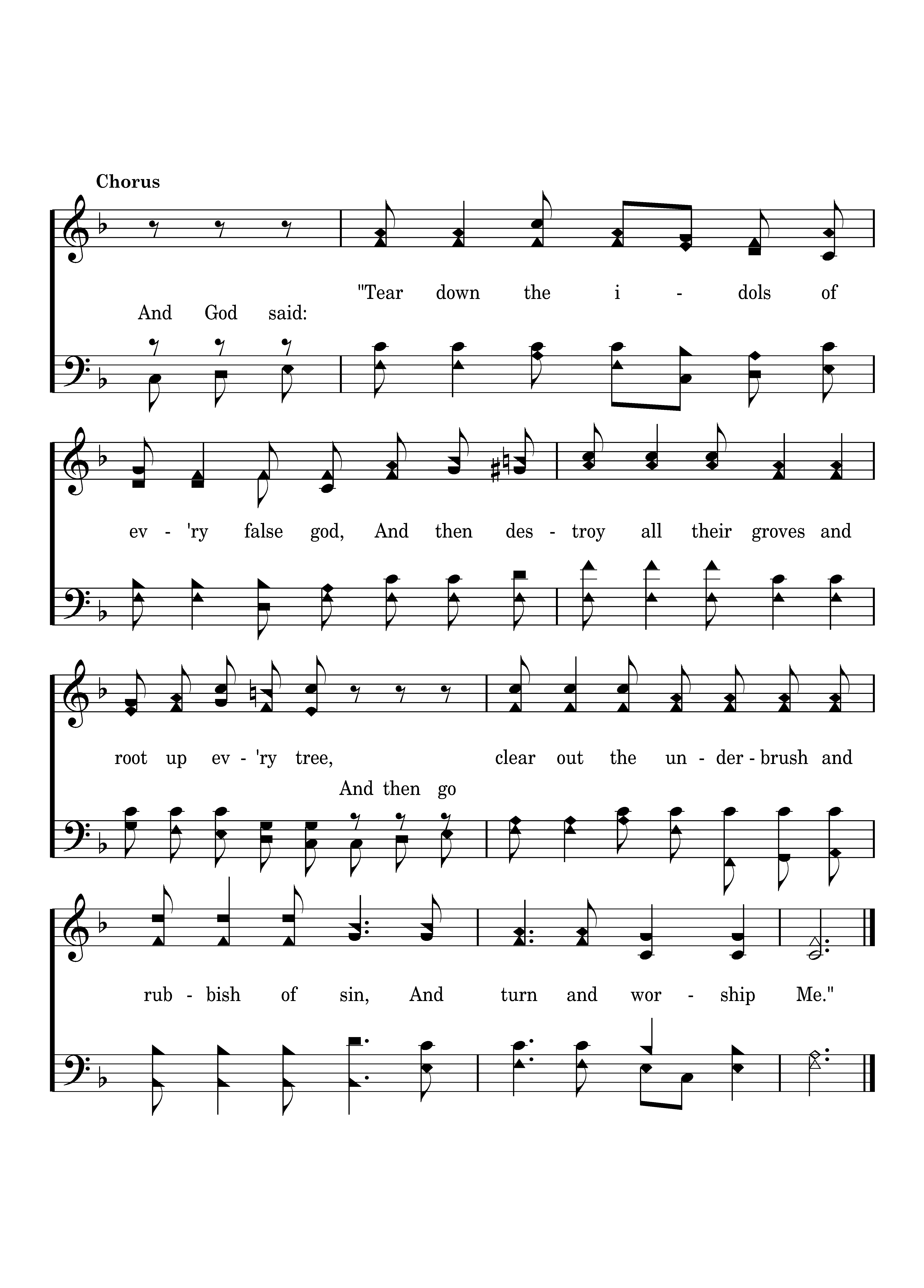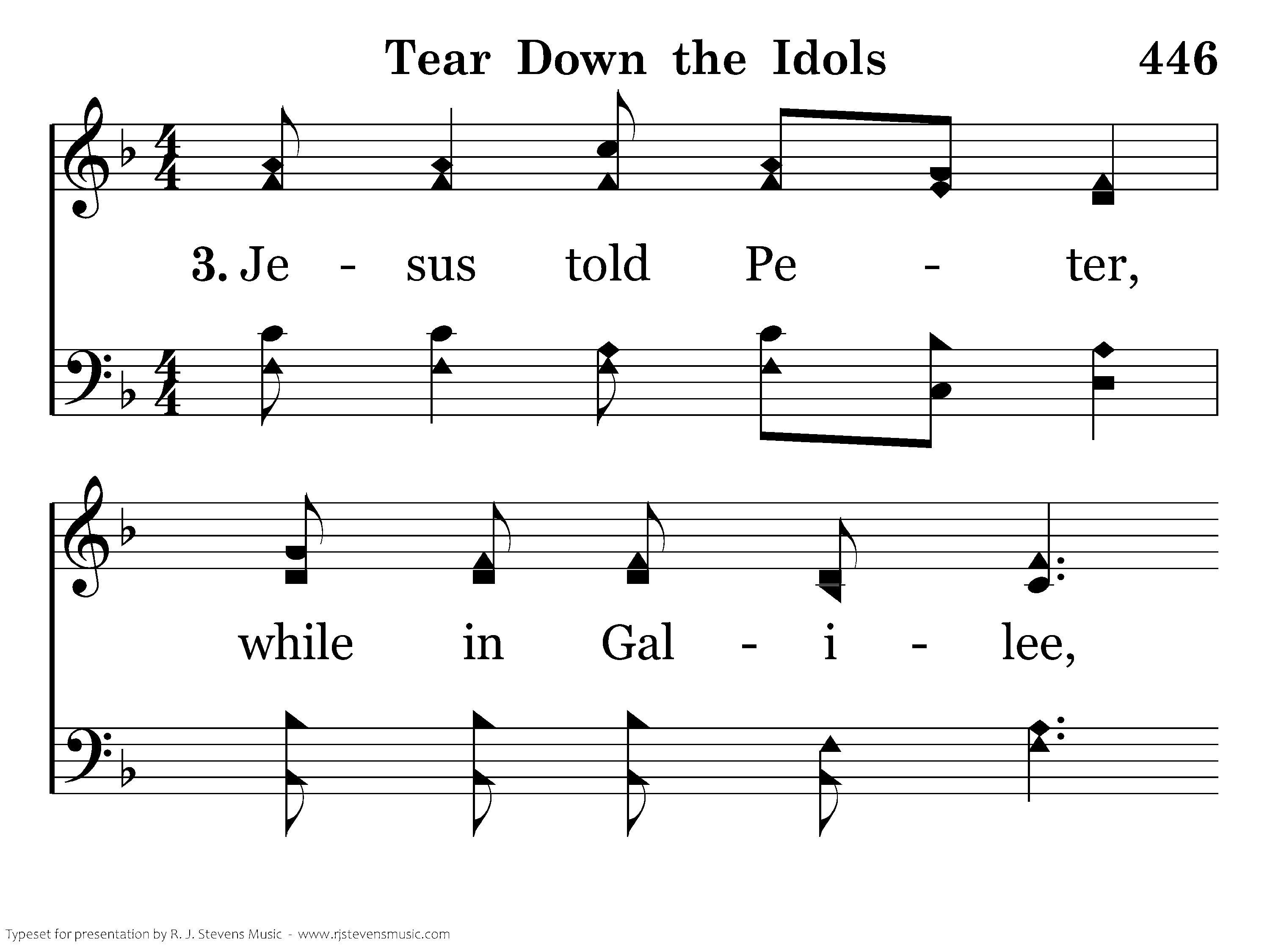 And God said: "Tear down the idos of ev'ry false god, And then destroy all their groves and root up ev'ry tree, And then go clear out the underbrush and rubbish of sin, And turn and worship Me."