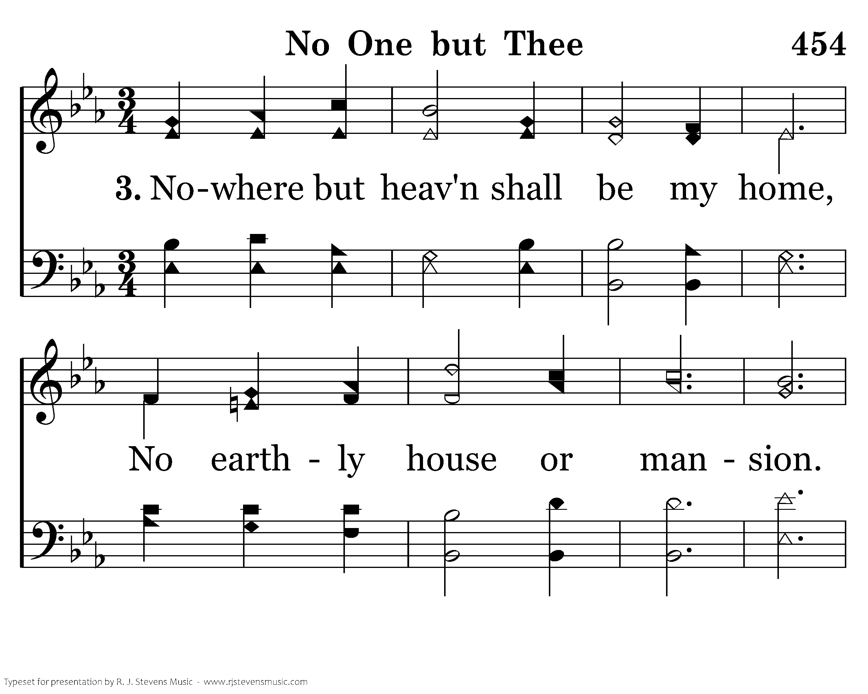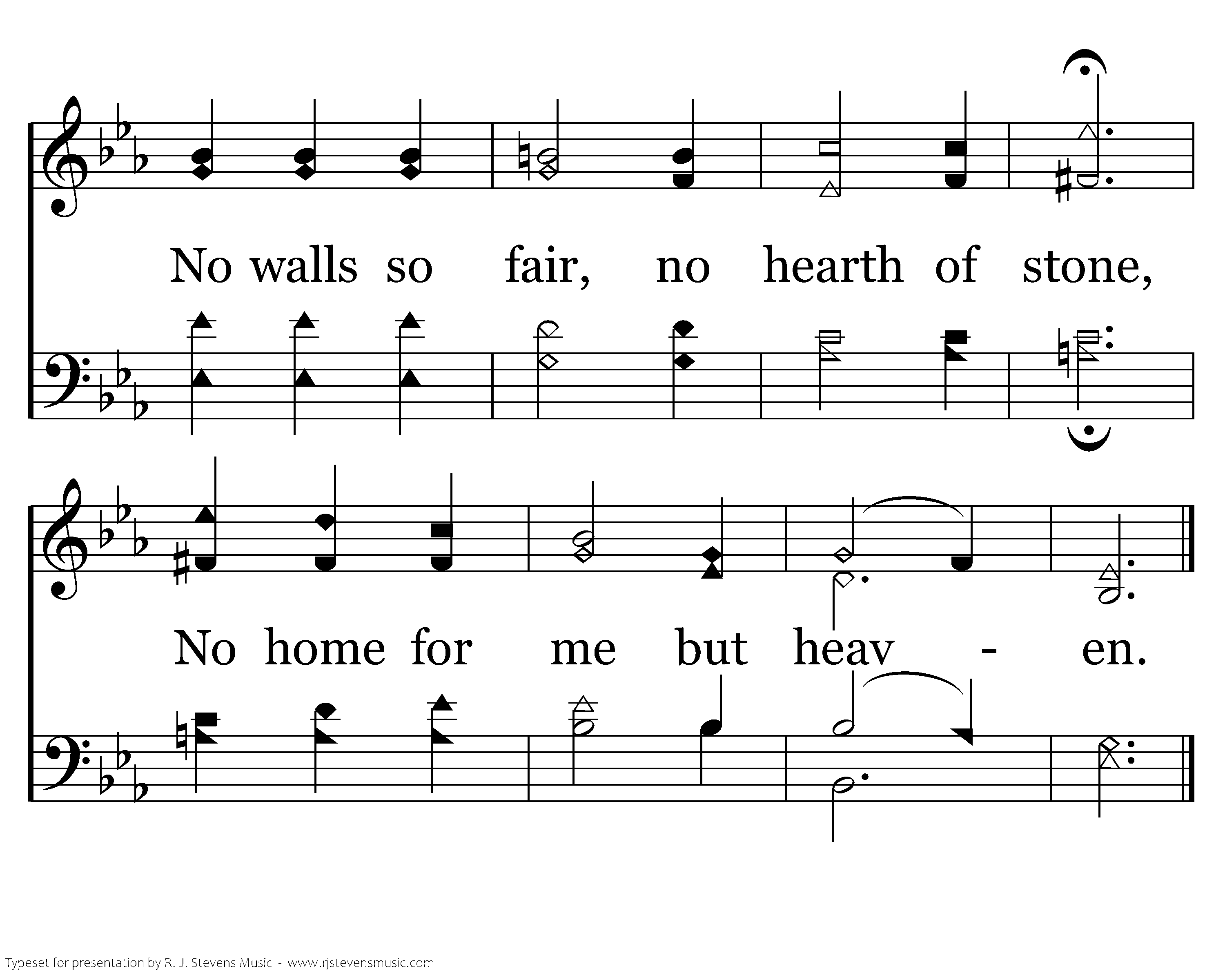 Nowhere but heav'n shall be my home, No earthly house or mansion. No walls so fair, no hearth of stone, No home for me but heaven.