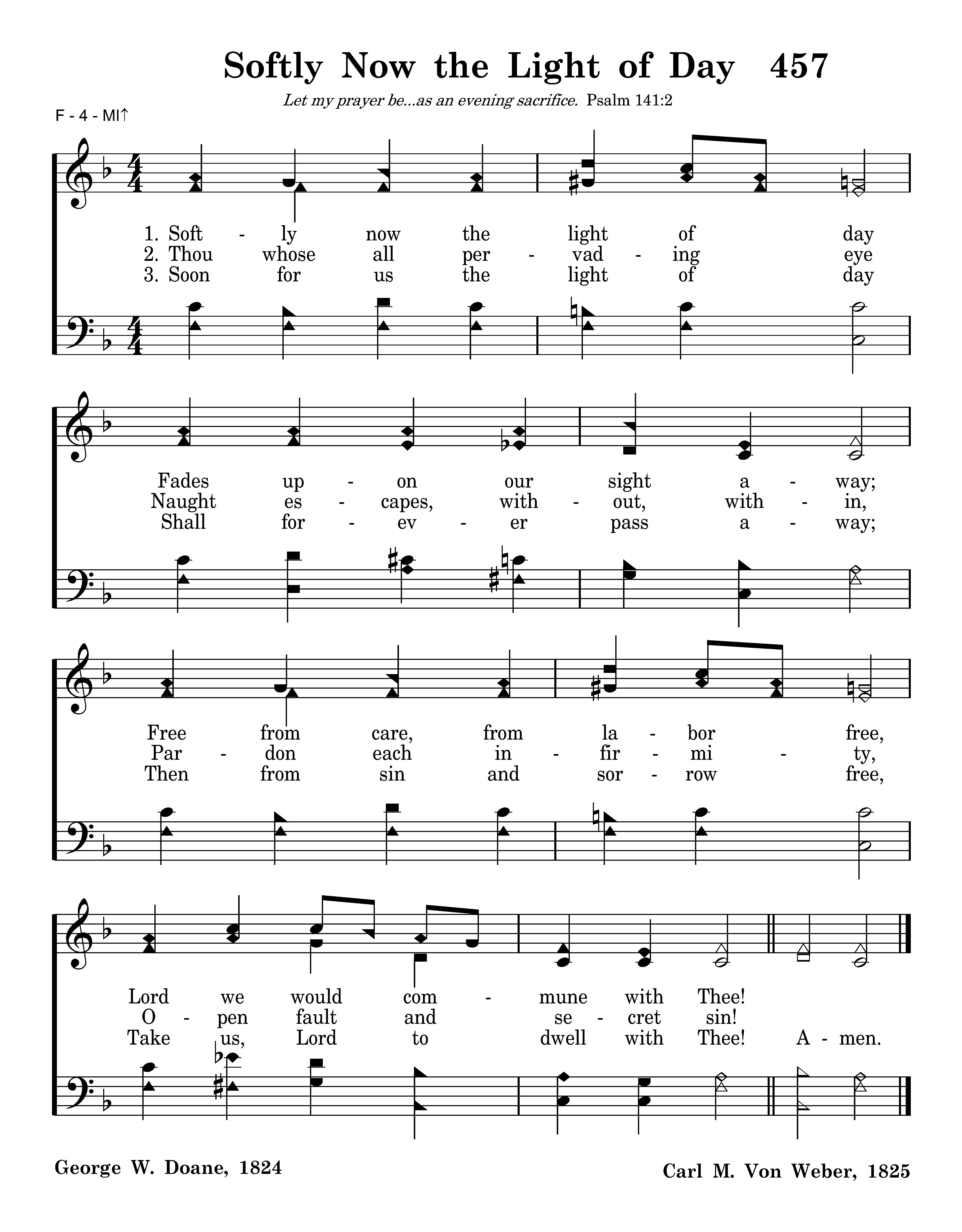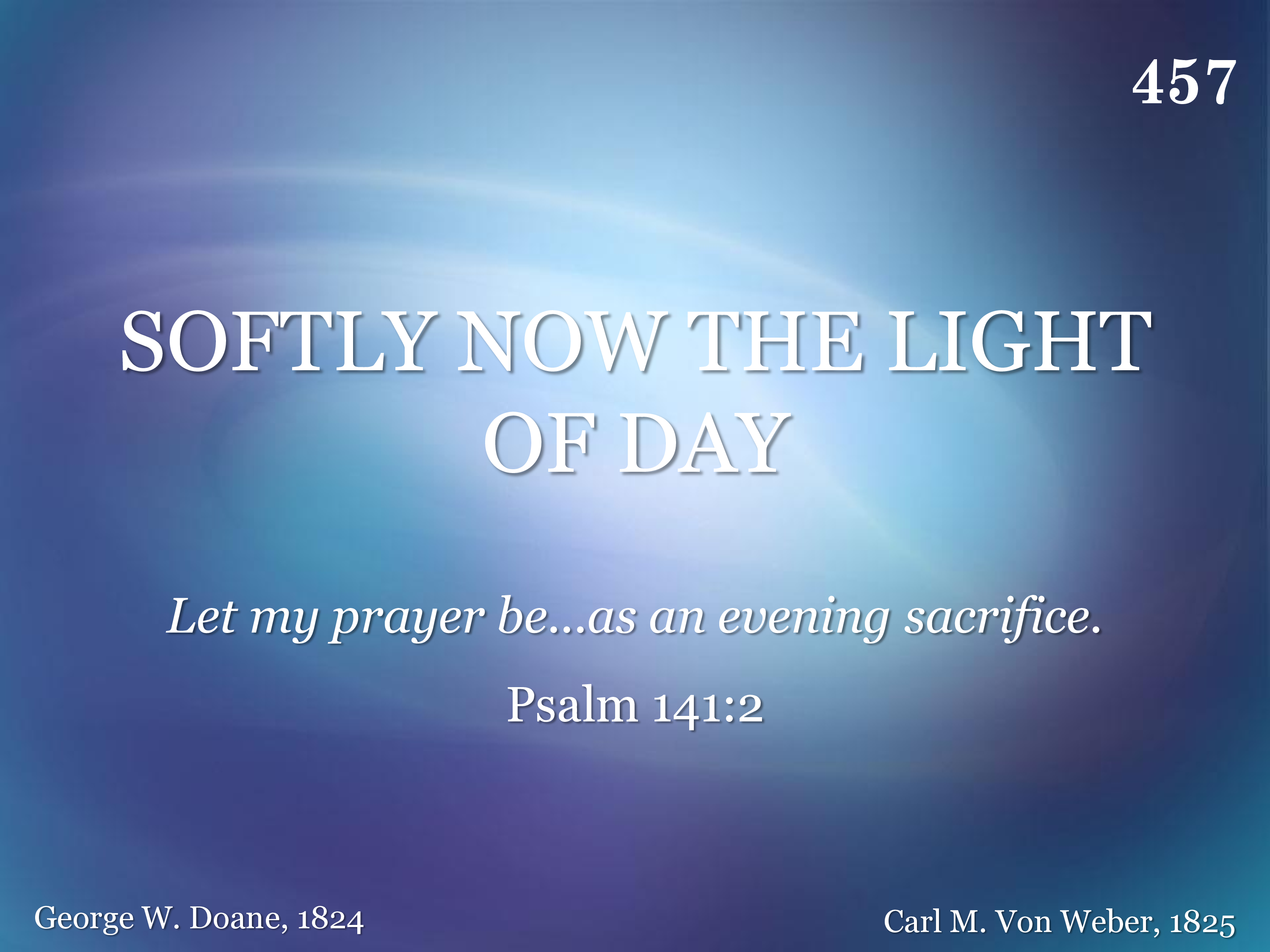 Softly now the light of day Fades upon our sight away; Free from care, from labor free, Lord we would commune with Thee!